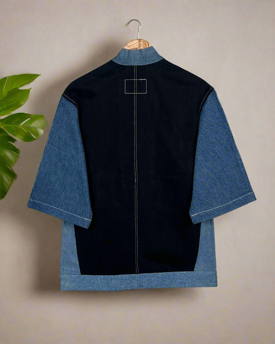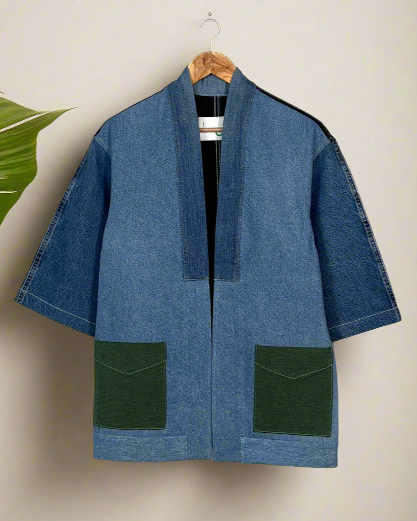 This unisex reconstructed kimono jacket in a relaxed fit is upcycled from rescued premium denim. Each Un Denim kimono is crafted from a hand-picked selection of unique denim segments. The segments are then carefully matched & contrasted to bring to life truly one-of-a-kind statement pieces. Each has its own special denim detailing and character, and you™ll never find two that look the same.Wide sleeves and an open front create a roomy and breezy silhouette that pairs well for both casual and formal styling.The kimono includes our signature GreenPocket to showcase your preference for conscious & sustainable fashion.