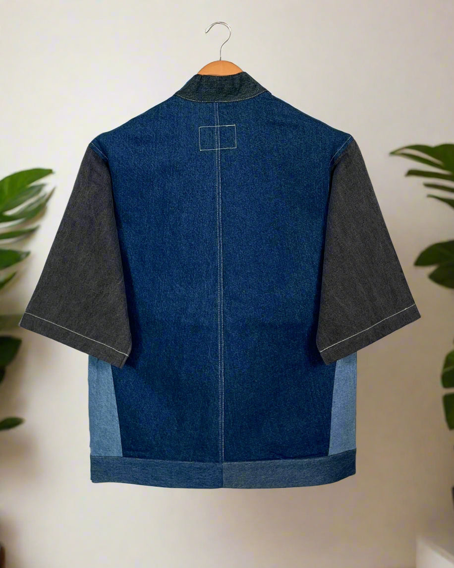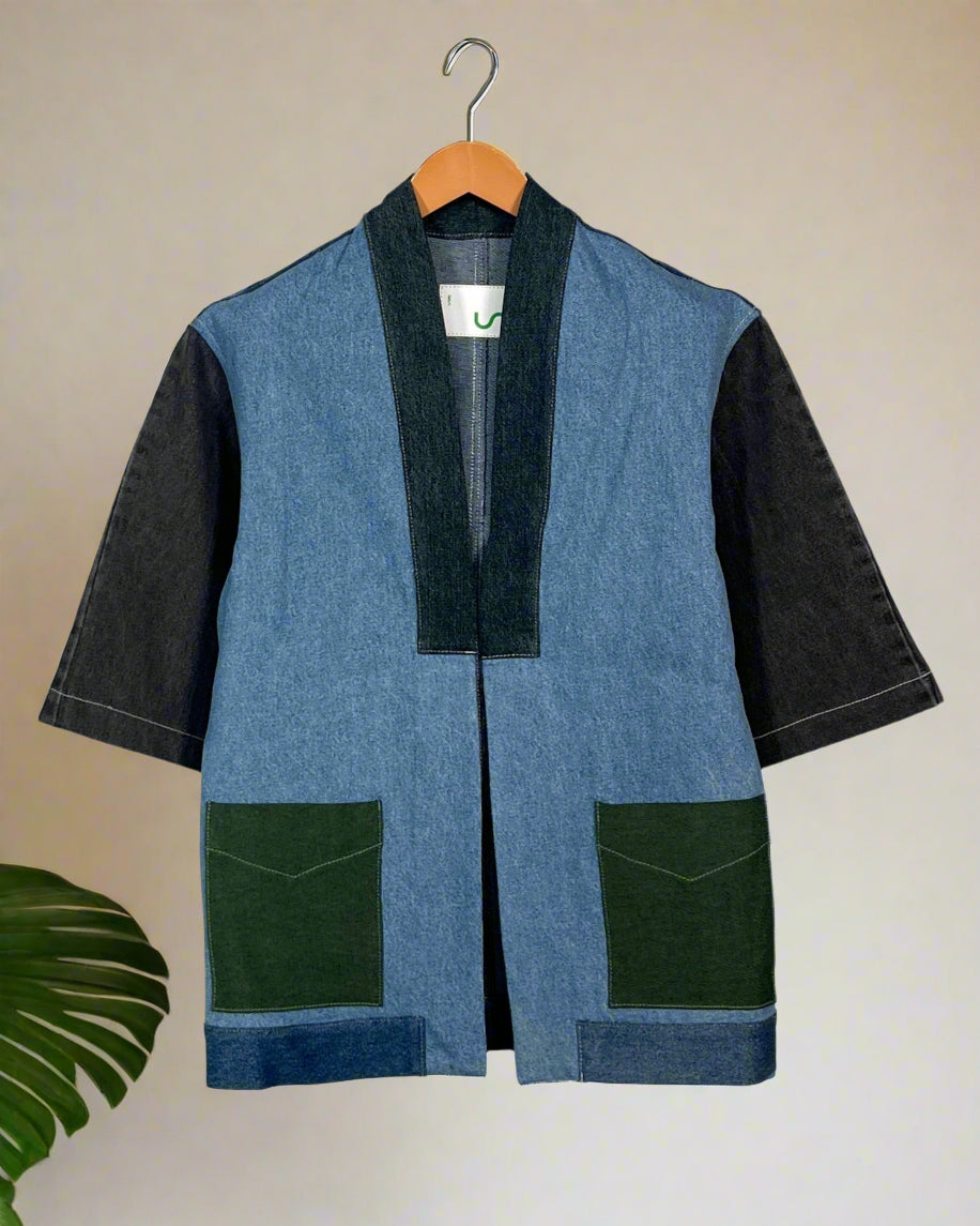 This unisex reconstructed kimono jacket in a relaxed fit is upcycled from rescued premium denim. Each Un Denim kimono is crafted from a hand-picked selection of unique denim segments. The segments are then carefully matched & contrasted to bring to life truly one-of-a-kind statement pieces. Each has its own special denim detailing and character, and you™ll never find two that look the same.Wide sleeves and an open front create a roomy and breezy silhouette that pairs well for both casual and formal styling.The kimono includes our signature GreenPocket to showcase your preference for conscious & sustainable fashion.