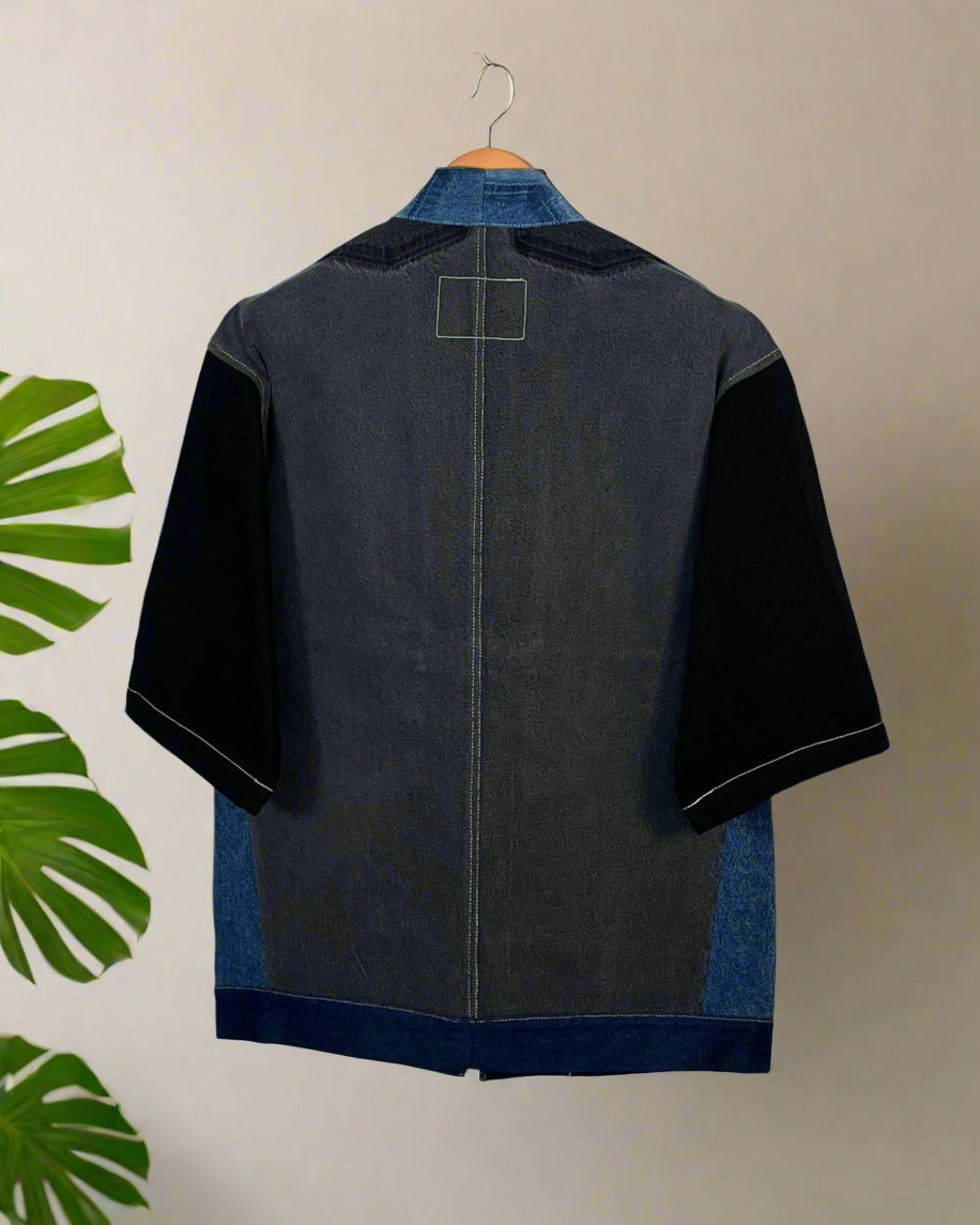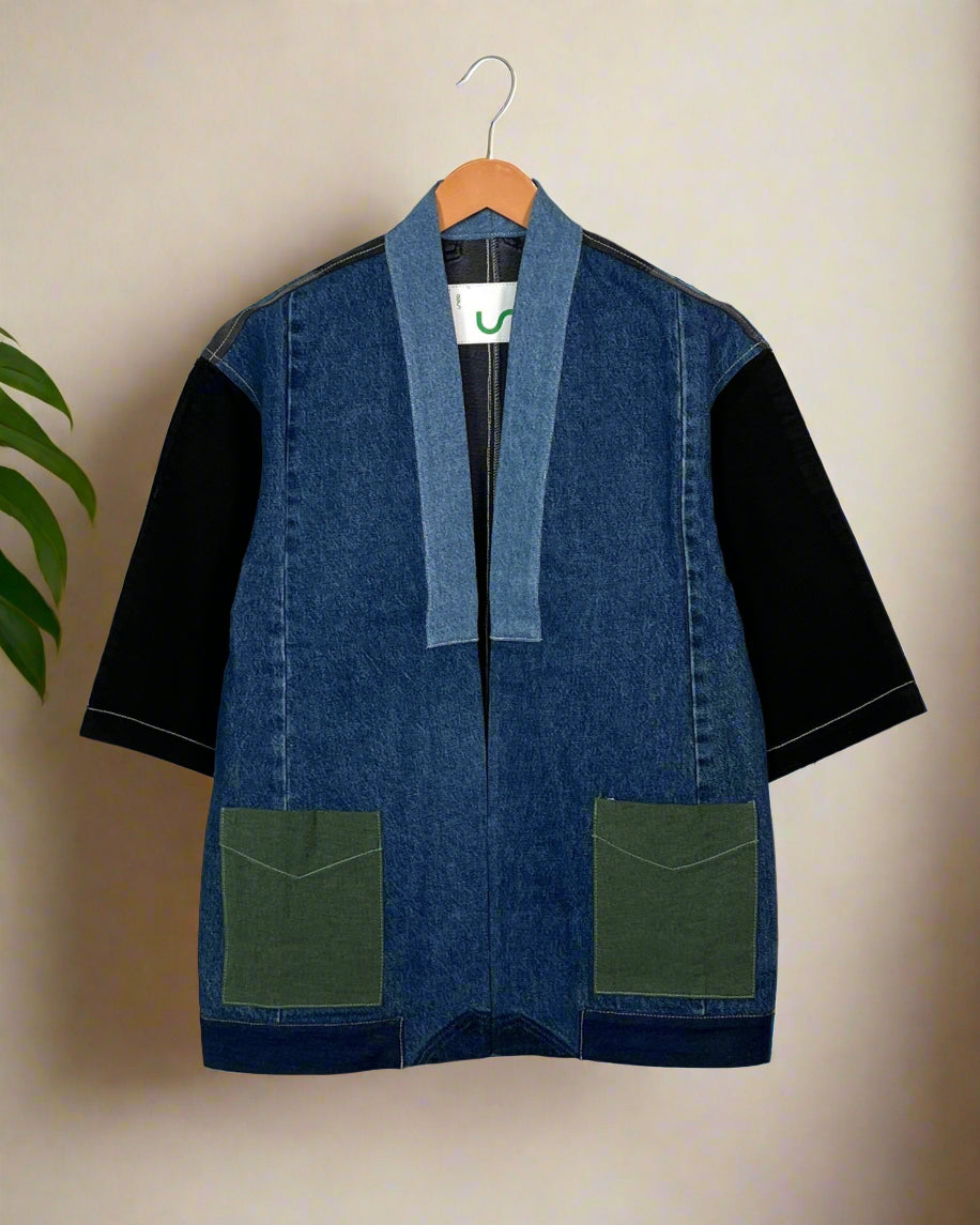 This unisex reconstructed kimono jacket in a relaxed fit is upcycled from rescued premium denim. Each Un Denim kimono is crafted from a hand-picked selection of unique denim segments. The segments are then carefully matched & contrasted to bring to life truly one-of-a-kind statement pieces. Each has its own special denim detailing and character, and you never find two that look the same.Wide sleeves and an open front create a roomy and breezy silhouette that pairs well for both casual and formal styling.The kimono includes our signature GreenPocket to showcase your preference for conscious & sustainable fashion.