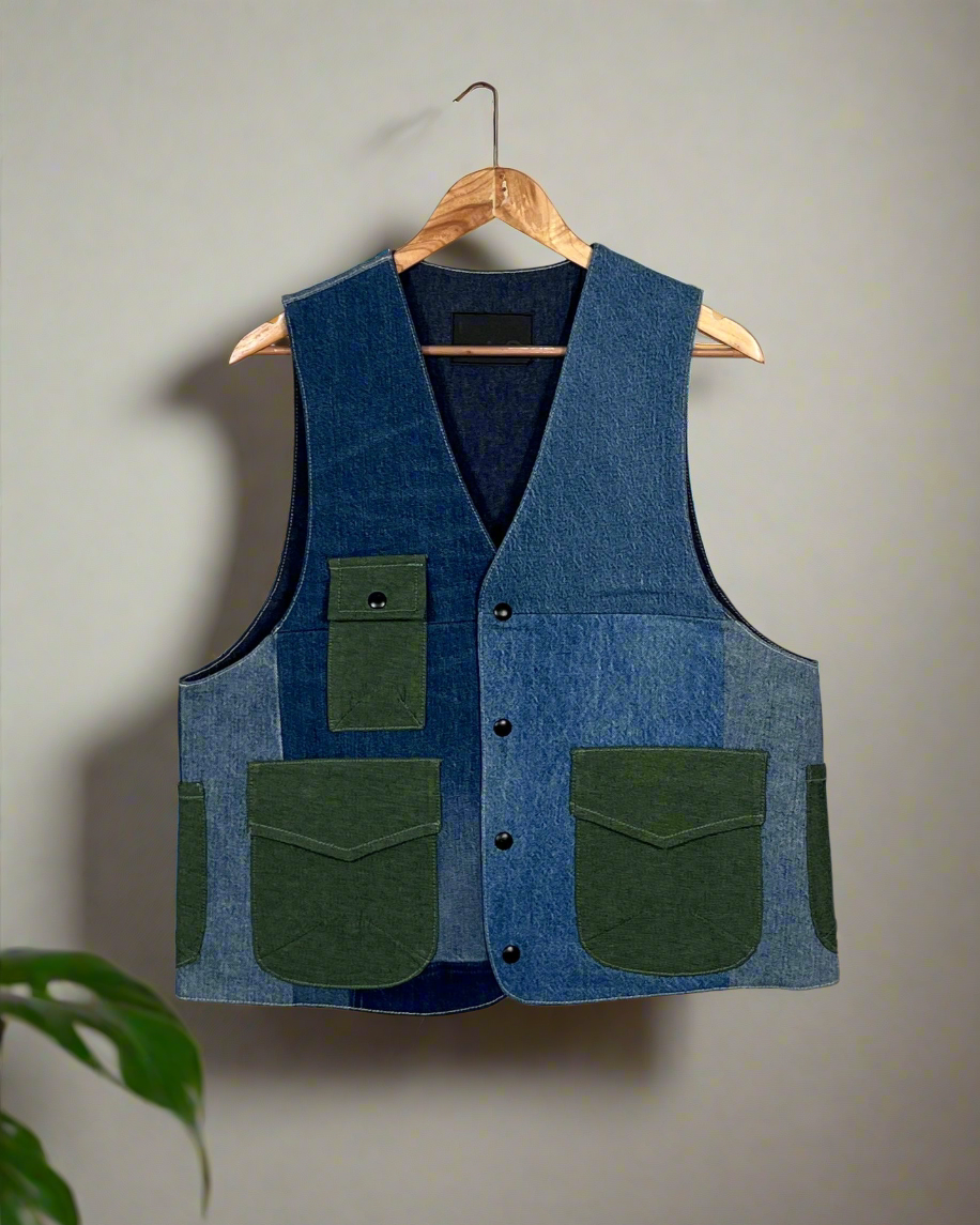 Let's talk about this vest from Un Denim - because it's not just any vest. We obsessively hand-pick each piece of premium rescued denim, carefully matching and contrasting segments to create something extraordinary.Inspired by classic cargo design, we've added perfectly placed pockets that are as functional as they are striking. Every vest is a masterpiece of reconstruction, where interesting edges meet original character, and no two pieces ever look the same.That signature GreenPocket™? It's just the finishing touch on your one-of-a-kind story.