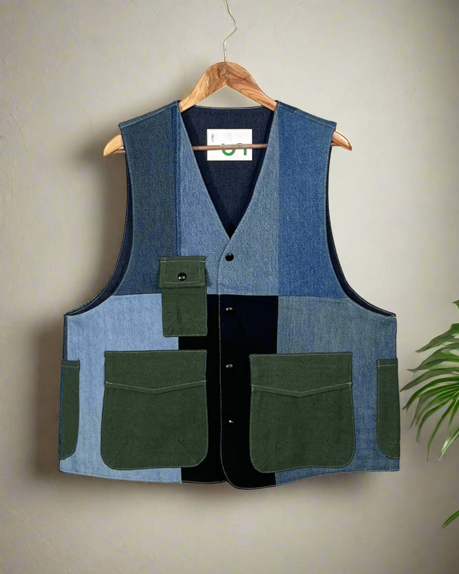 Let's talk about this vest from Un Denim - because it's not just any vest. We obsessively hand-pick each piece of premium rescued denim, carefully matching and contrasting segments to create something extraordinary.Inspired by classic cargo design, we've added perfectly placed pockets that are as functional as they are striking. Every vest is a masterpiece of reconstruction, where interesting edges meet original character, and no two pieces ever look the same.That signature GreenPocket™? It's just the finishing touch on your one-of-a-kind story.