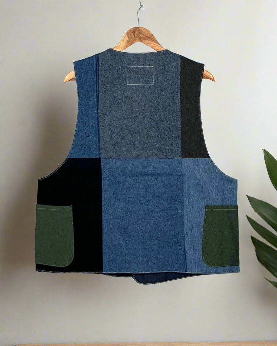 Let's talk about this vest from Un Denim - because it's not just any vest. We obsessively hand-pick each piece of premium rescued denim, carefully matching and contrasting segments to create something extraordinary.Inspired by classic cargo design, we've added perfectly placed pockets that are as functional as they are striking. Every vest is a masterpiece of reconstruction, where interesting edges meet original character, and no two pieces ever look the same.That signature GreenPocket™? It's just the finishing touch on your one-of-a-kind story.