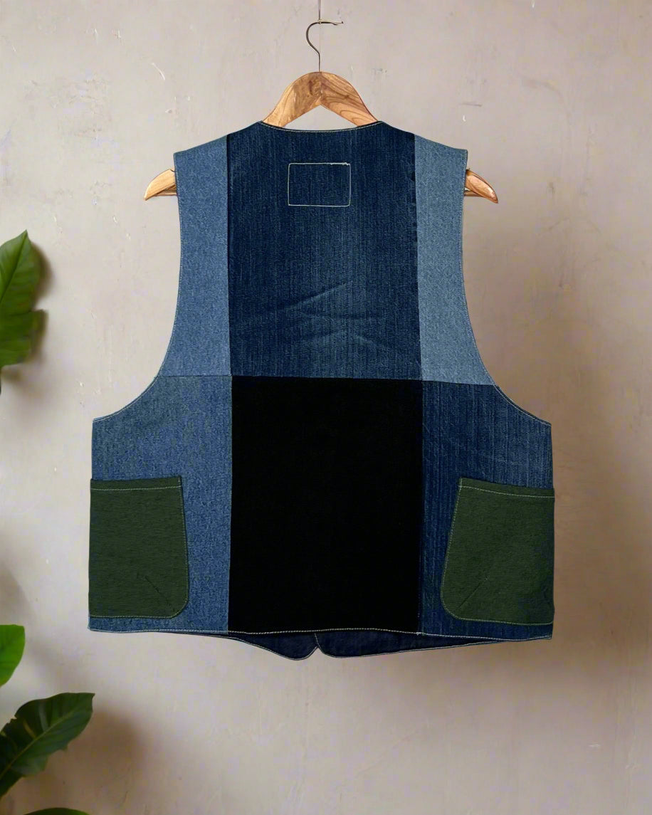 Let's talk about this vest from Un Denim - because it's not just any vest. We obsessively hand-pick each piece of premium rescued denim, carefully matching and contrasting segments to create something extraordinary.Inspired by classic cargo design, we've added perfectly placed pockets that are as functional as they are striking. Every vest is a masterpiece of reconstruction, where interesting edges meet original character, and no two pieces ever look the same.That signature GreenPocket™? It's just the finishing touch on your one-of-a-kind story.
