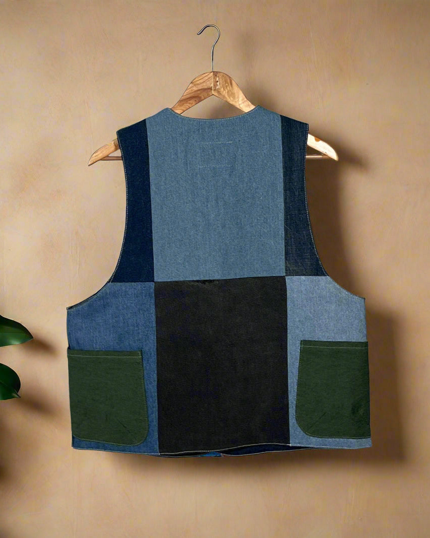 Let's talk about this vest from Un Denim - because it's not just any vest. We obsessively hand-pick each piece of premium rescued denim, carefully matching and contrasting segments to create something extraordinary.Inspired by classic cargo design, we've added perfectly placed pockets that are as functional as they are striking. Every vest is a masterpiece of reconstruction, where interesting edges meet original character, and no two pieces ever look the same.That signature GreenPocket™? It's just the finishing touch on your one-of-a-kind story.
