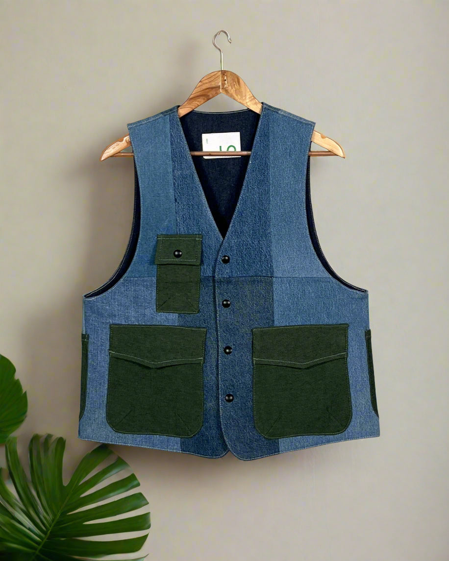 Let's talk about this vest from Un Denim - because it's not just any vest. We obsessively hand-pick each piece of premium rescued denim, carefully matching and contrasting segments to create something extraordinary.Inspired by classic cargo design, we've added perfectly placed pockets that are as functional as they are striking. Every vest is a masterpiece of reconstruction, where interesting edges meet original character, and no two pieces ever look the same.That signature GreenPocket™? It's just the finishing touch on your one-of-a-kind story.