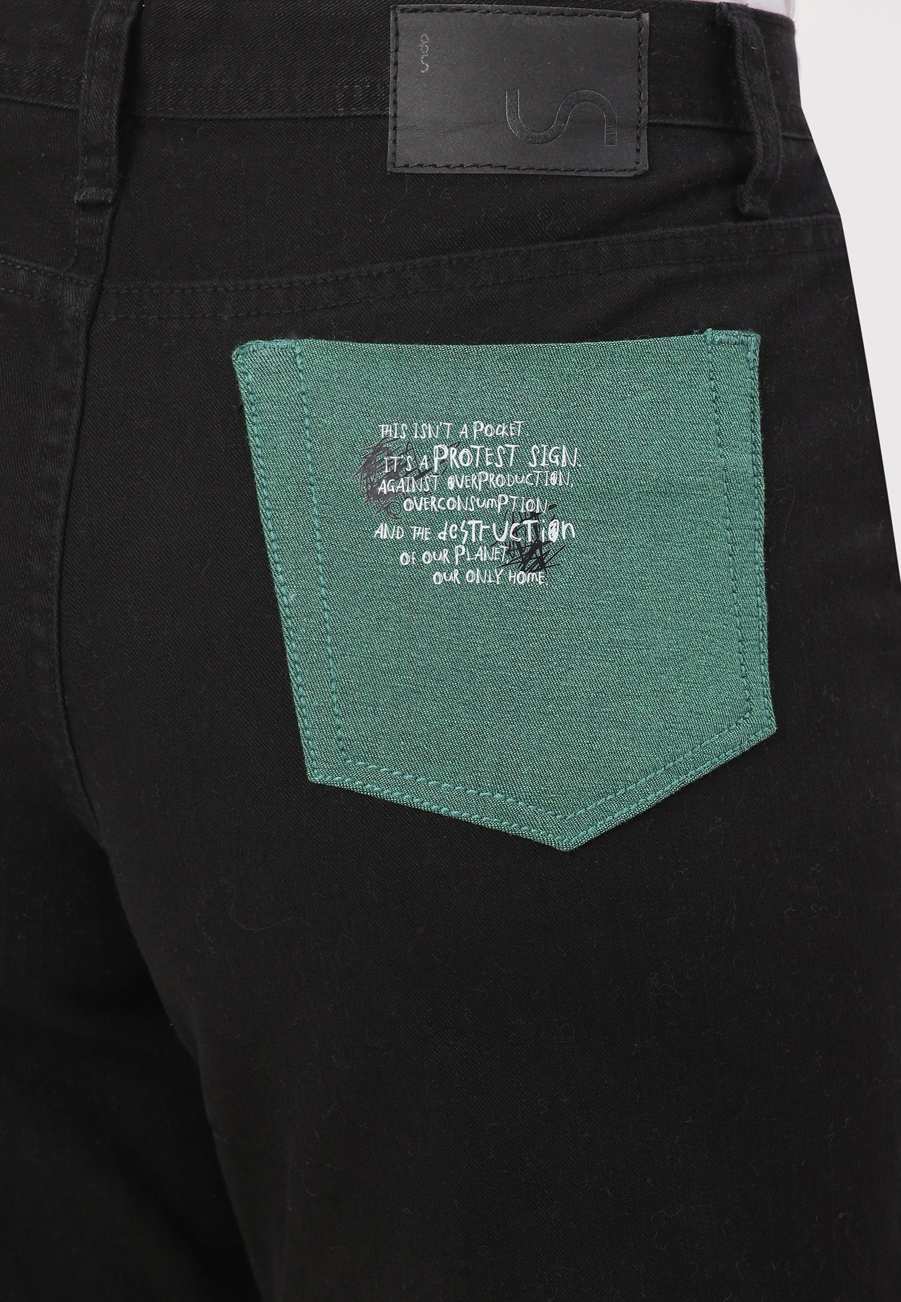 Women's black straight denim shorts that sit high on the waist with narrow leg openings. They fit fuller through the hip and thigh and run straight from hip to hem. They feature Un Denim's signature GreenPocket™ that says - ‘This is not a green pocket, it’s a protest sign, against overproduction, overconsumption and the destruction of our planet, our only home.’