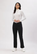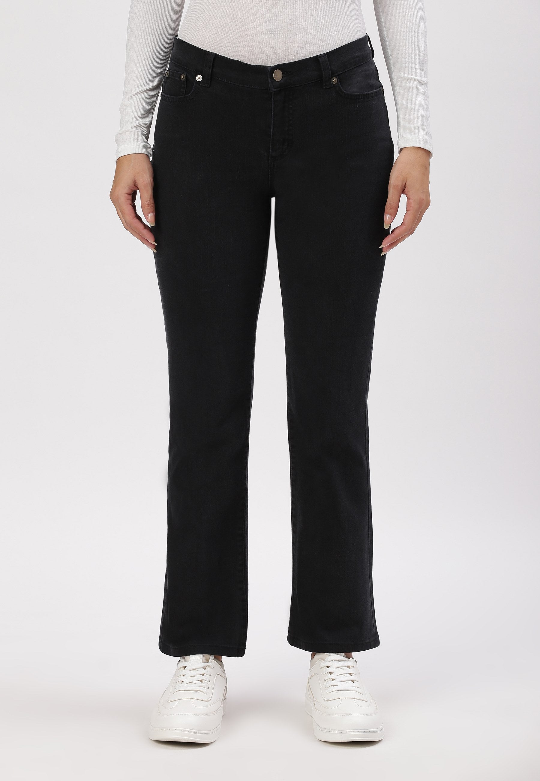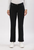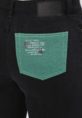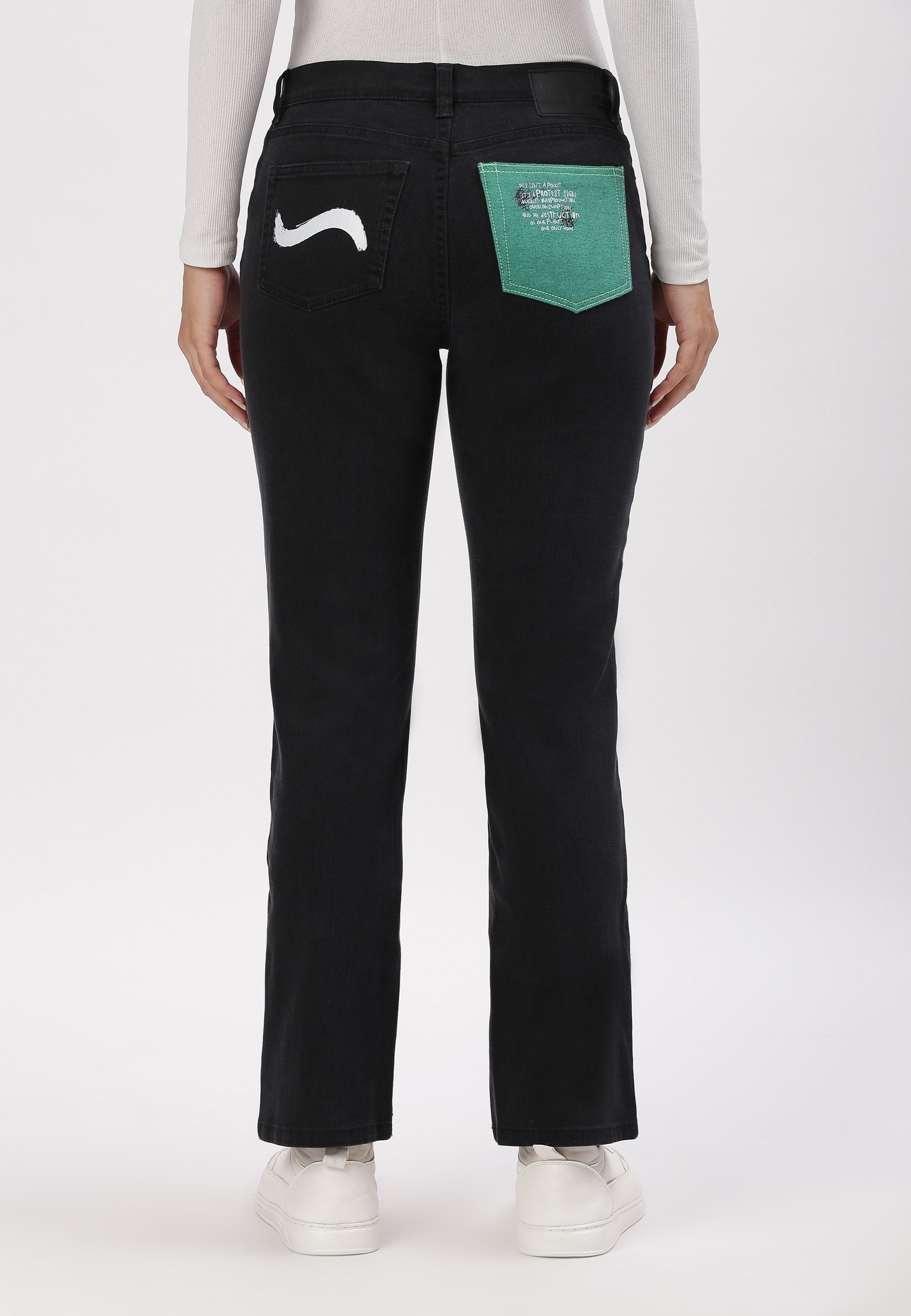 Women's black straight jeans that sit low on waist with narrow leg openings. They fit fuller through the hip and thigh and run straight from hip to ankle. They feature Un Denim's signature GreenPocket™ that says - ‘This is not a green pocket, it’s a protest sign, against overproduction, overconsumption and the destruction of our planet, our only home.’