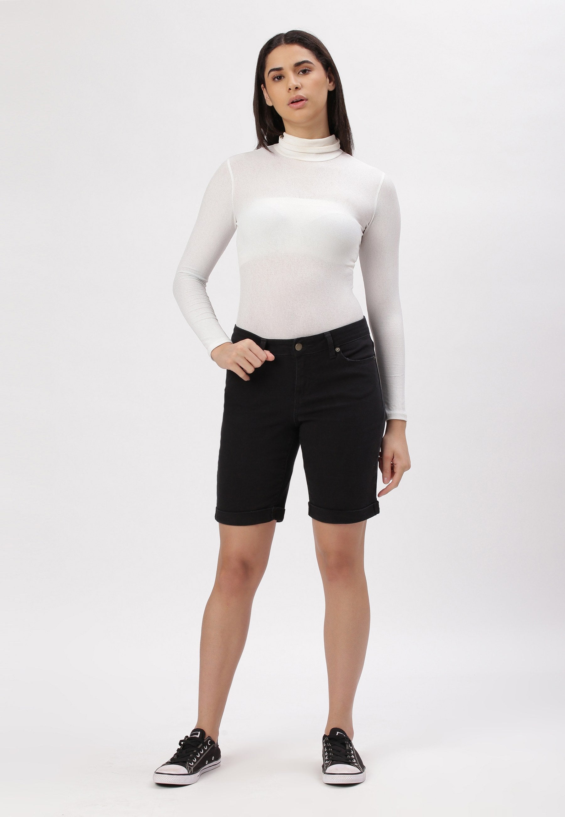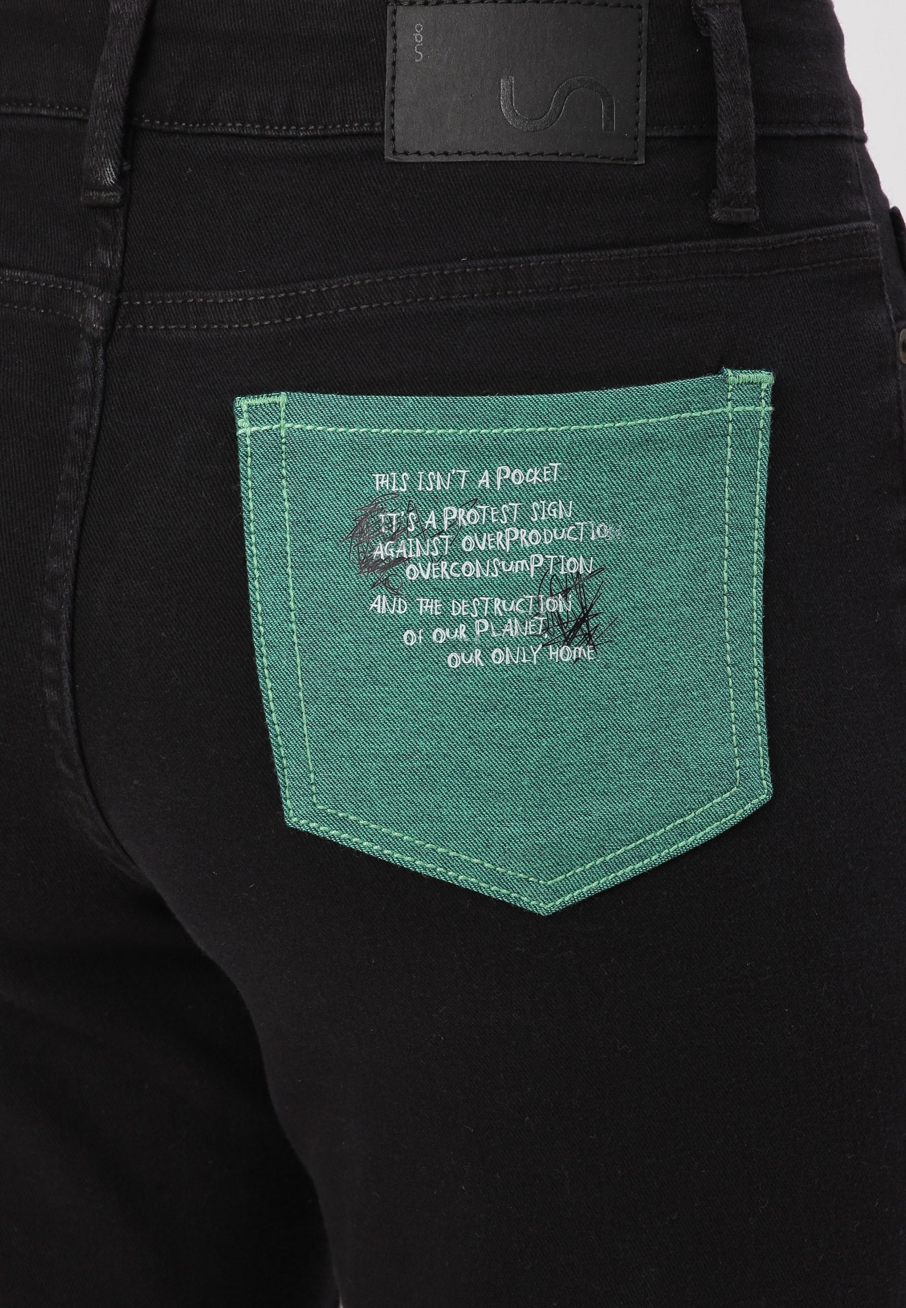 Women's black straight denim shorts that sit comfortably at the waist with narrow leg openings. They fit fuller through the hip and thigh and run straight from hip to hem. They feature Un Denim's signature GreenPocket that says - ˜This is not a green pocket, its a protest sign, against overproduction, overconsumption and the destruction of our planet, our only home.™
