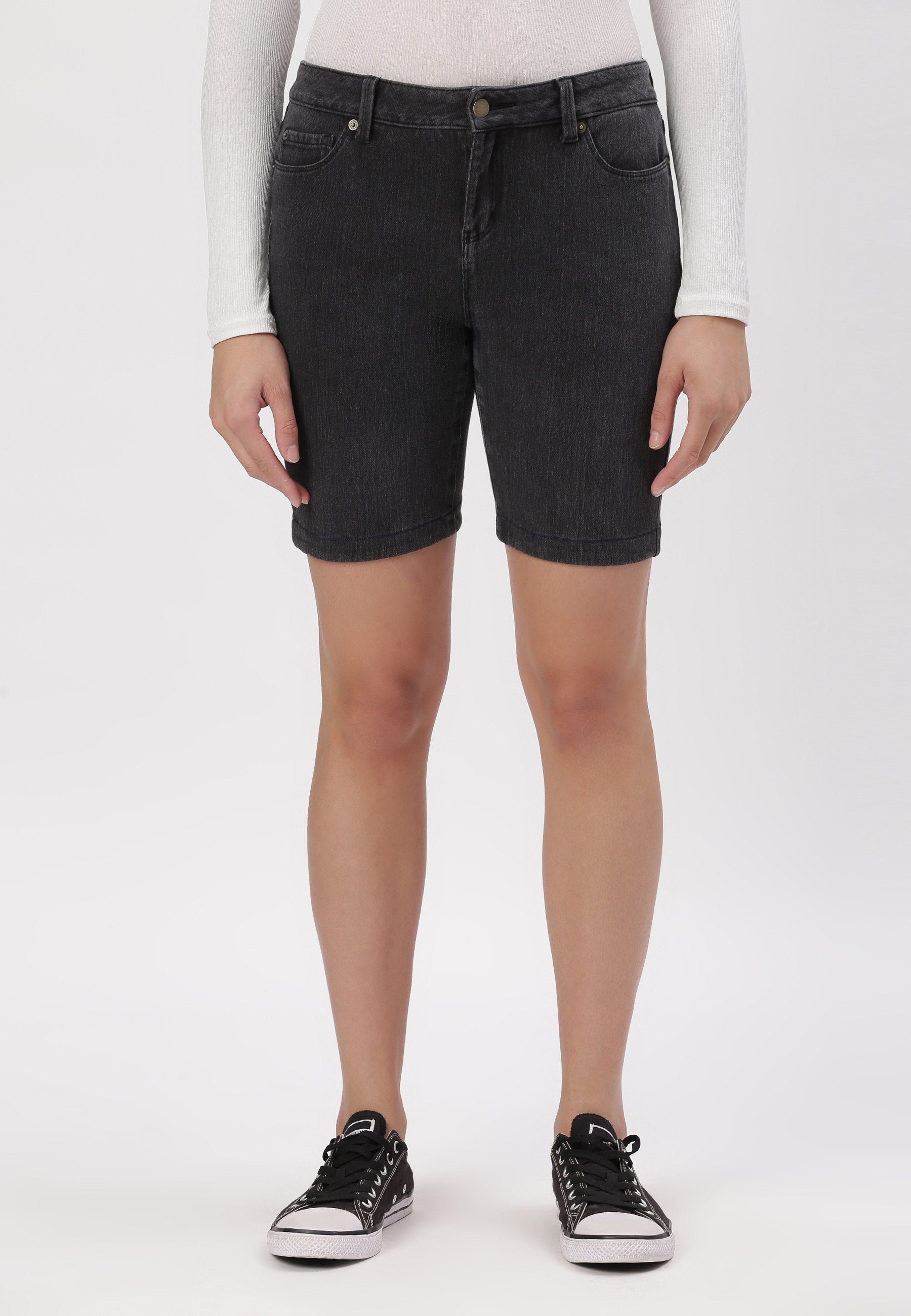 Women's black straight denim shorts that sit comfortably at the waist with narrow leg openings. They fit fuller through the hip and thigh and run straight from hip to hem. They feature Un Denim's signature GreenPocket™ that says - ‘This is not a green pocket, it’s a protest sign, against overproduction, overconsumption and the destruction of our planet, our only home.’