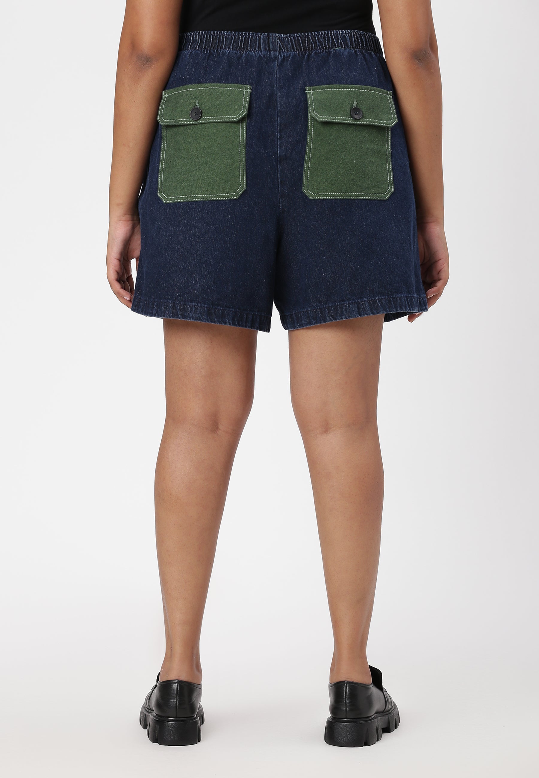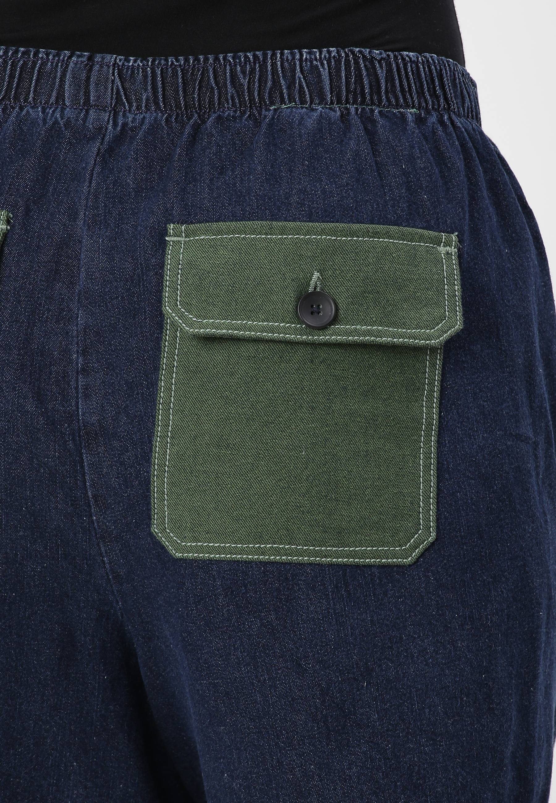 Women's dark indigo baggy denim shorts that sit high on the waist with wide leg openings. A relaxed fit, roomy and slouchy through the hip and thigh, ending above the knee. They come with bold, earthy green back pockets.