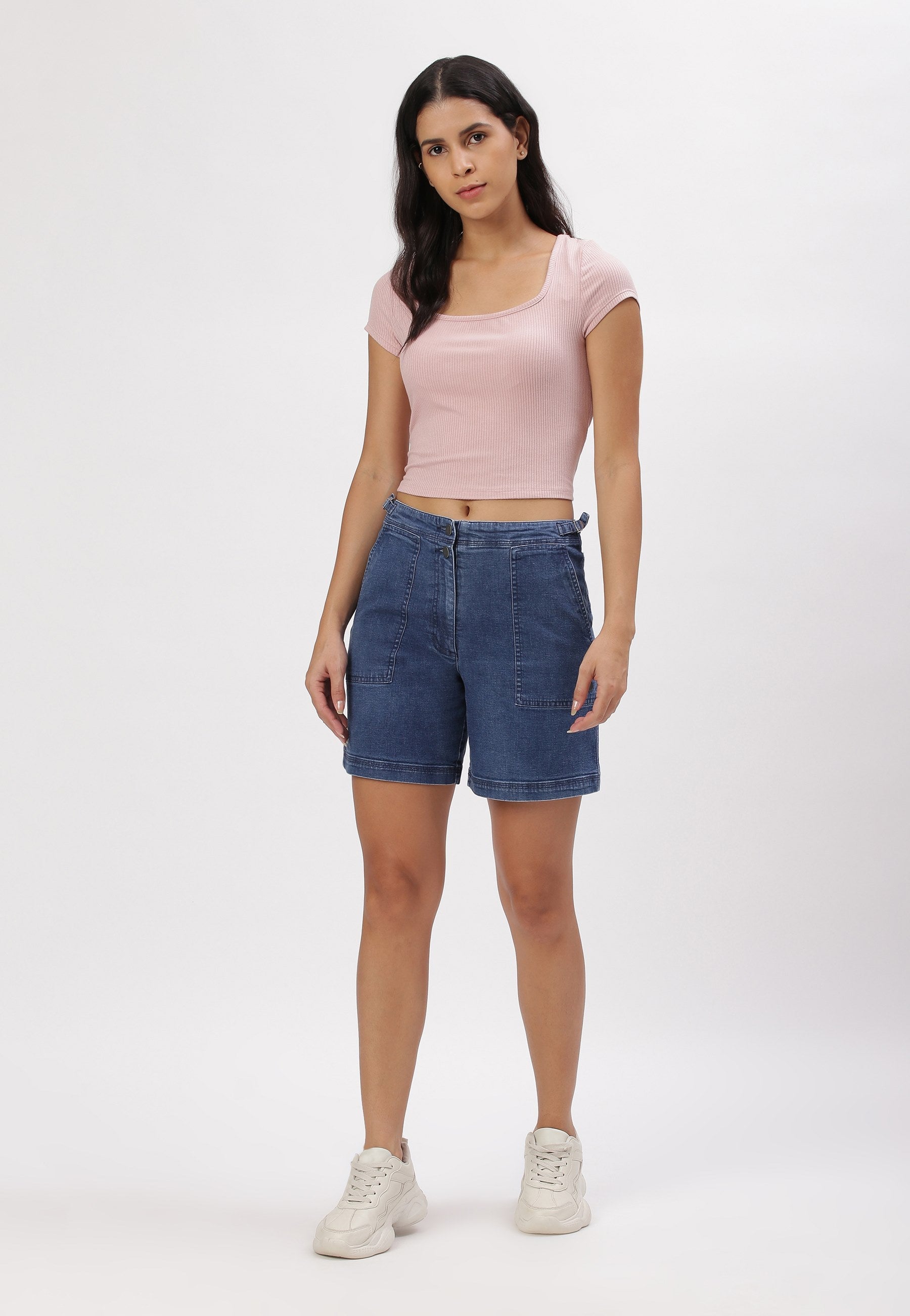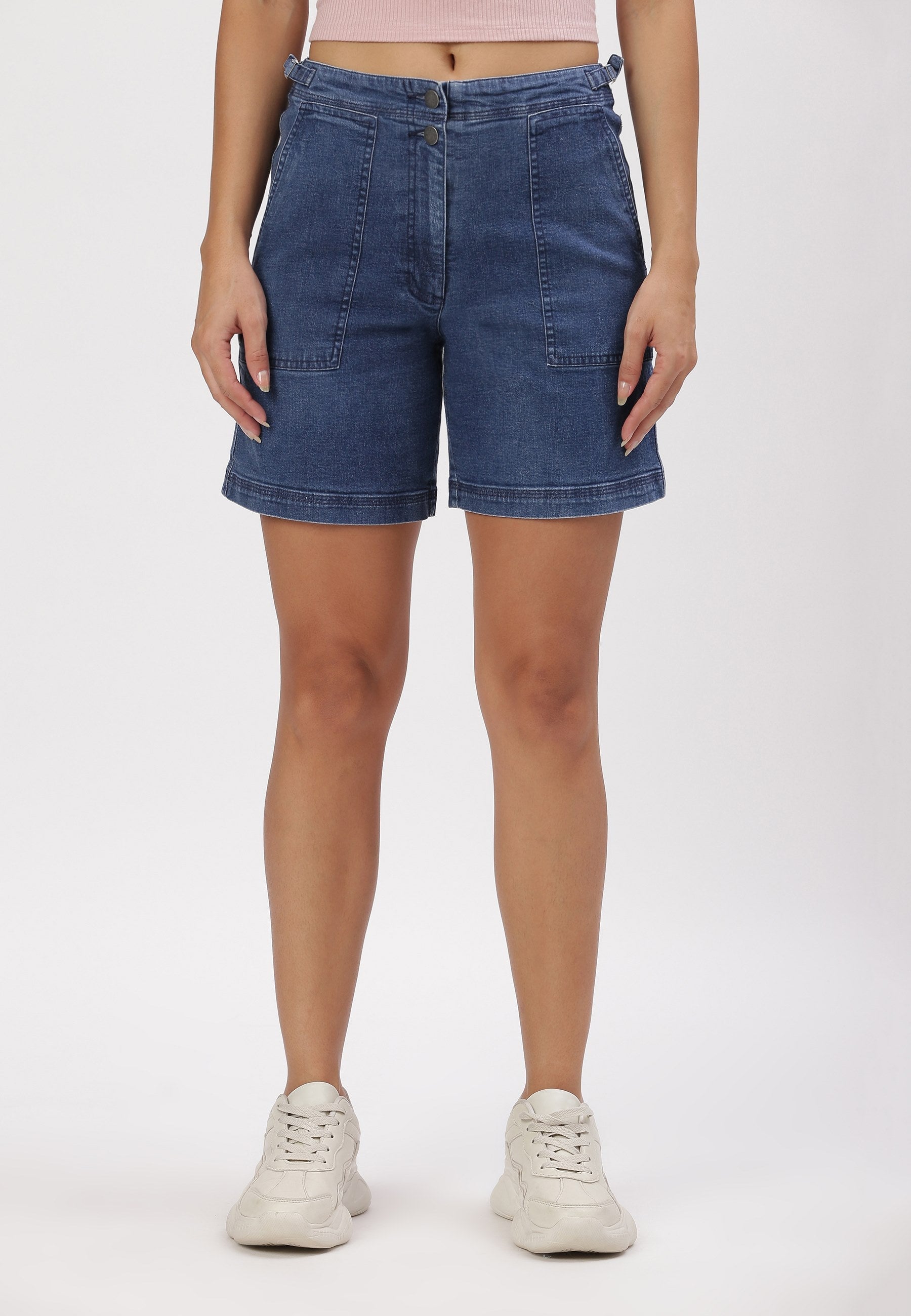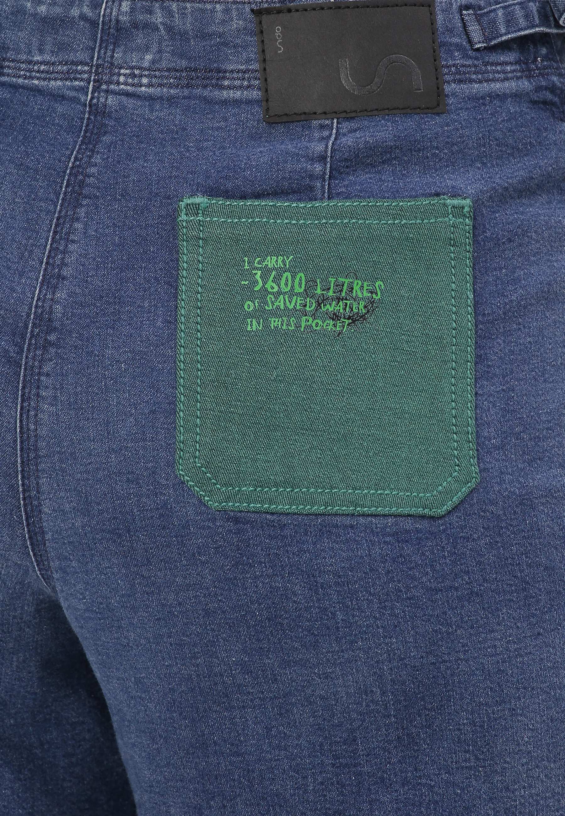 Women's dark indigo baggy denim shorts that sit high on the waist with wide leg openings. A relaxed fit, roomy and slouchy through the hip and thigh, ending above the knee. They feature a deep green back pocket that says - ˜I carry ~3600 litres of saved water in this pocket.™