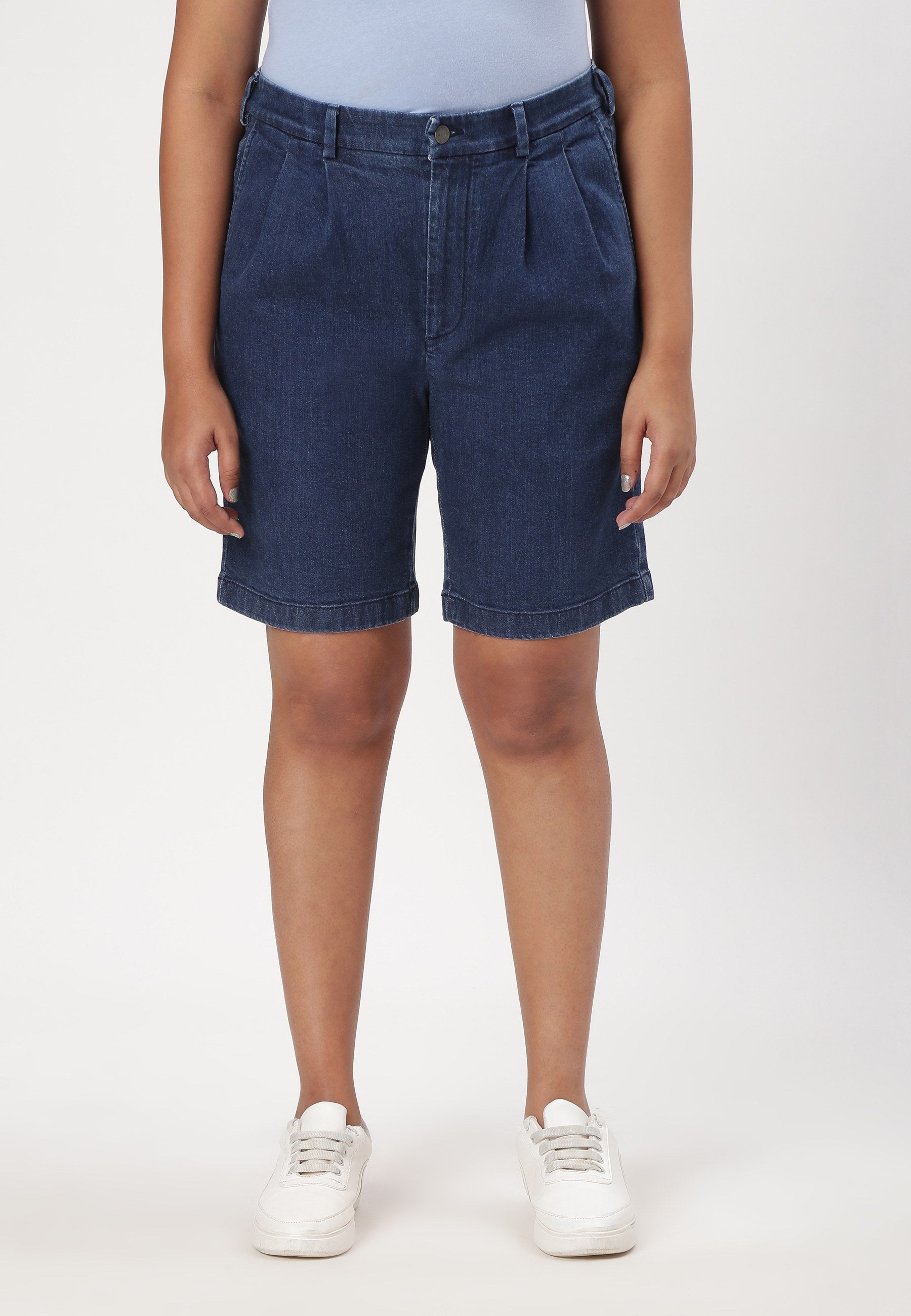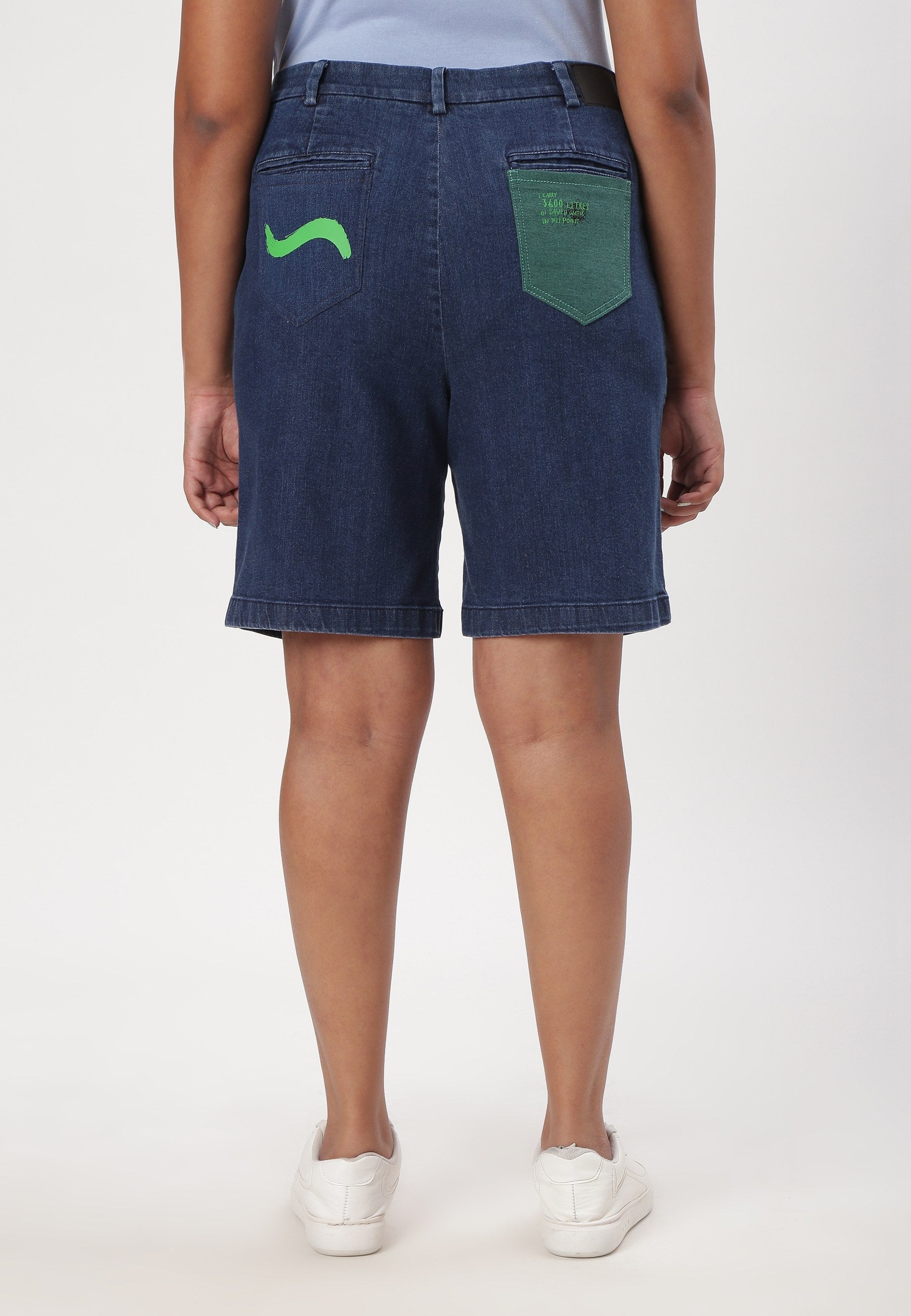 Women's dark indigo bermuda denim shorts that sit high on the waist with wide leg openings. A relaxed fit around the hip and thigh. They feature a deep green back pocket that says - ˜I carry ~3600 litres of saved water in this pocket.™