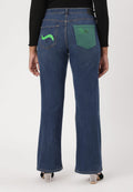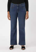 Women's dark indigo bootcut jeans that sit comfortably at the waist with wide leg openings. They fit snugly through the thigh and flare out from the knee. They feature a deep green back pocket that says - I carry ~3600 litres of saved water in this pocket.™