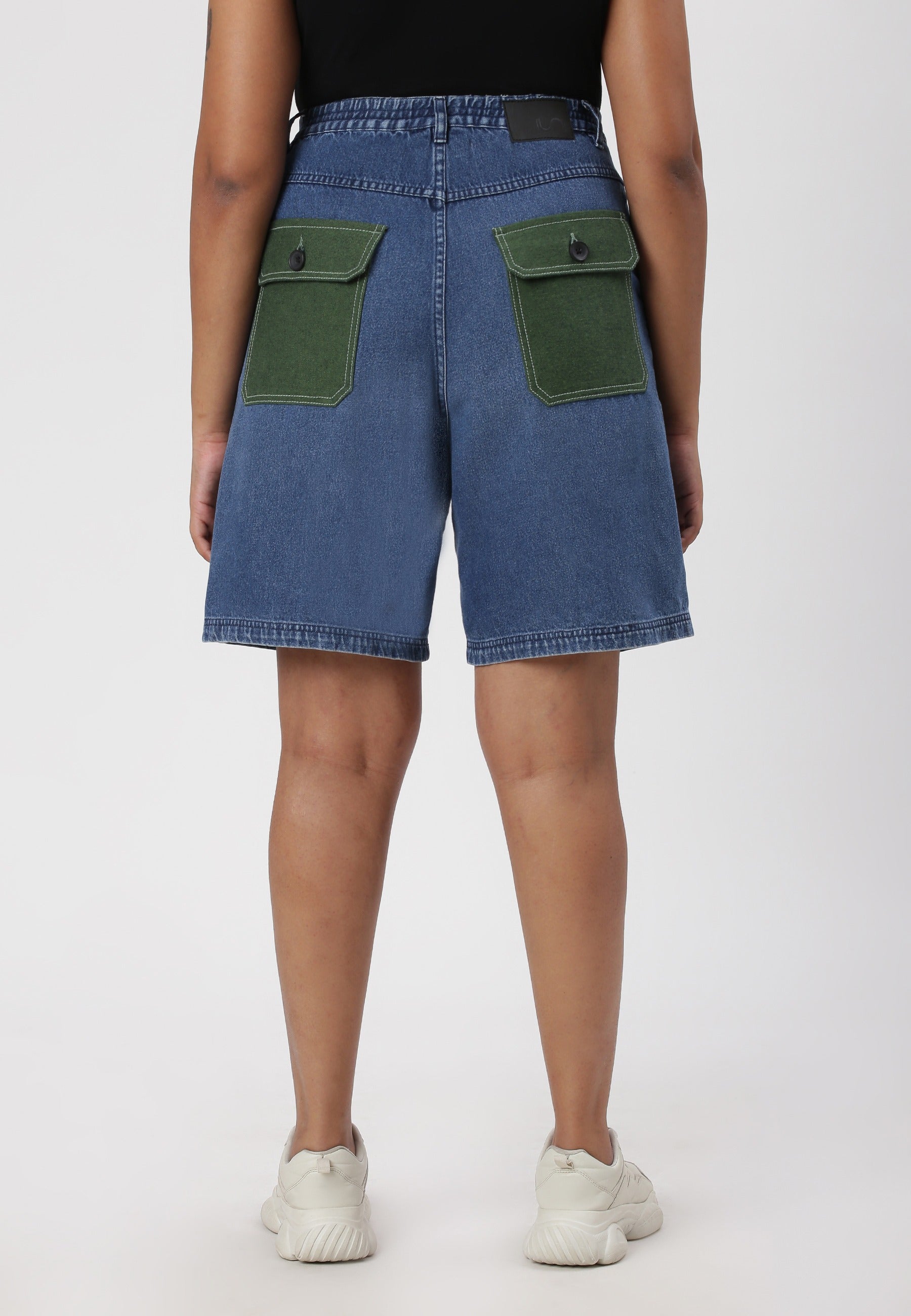 Women's dark indigo straight denim shorts that sit high on the waist with narrow leg openings. They fit fuller through the hip and thigh and run straight from hip to hem. They come with bold, earthy green back pockets.