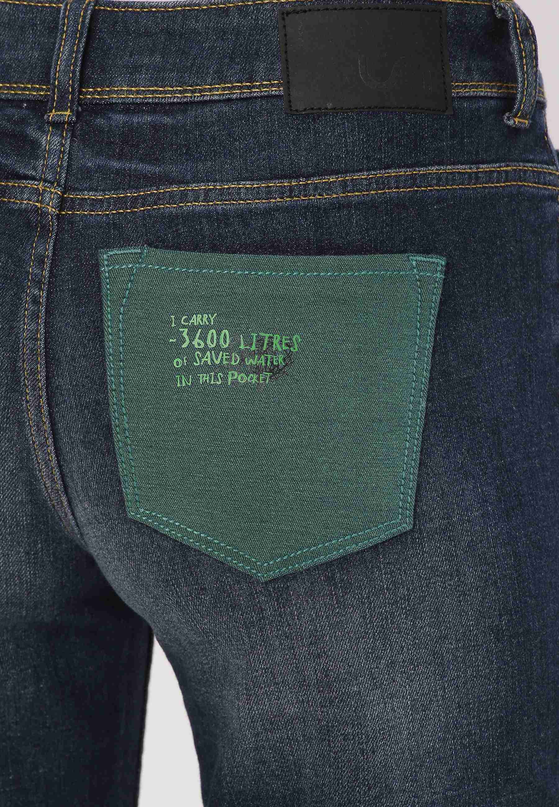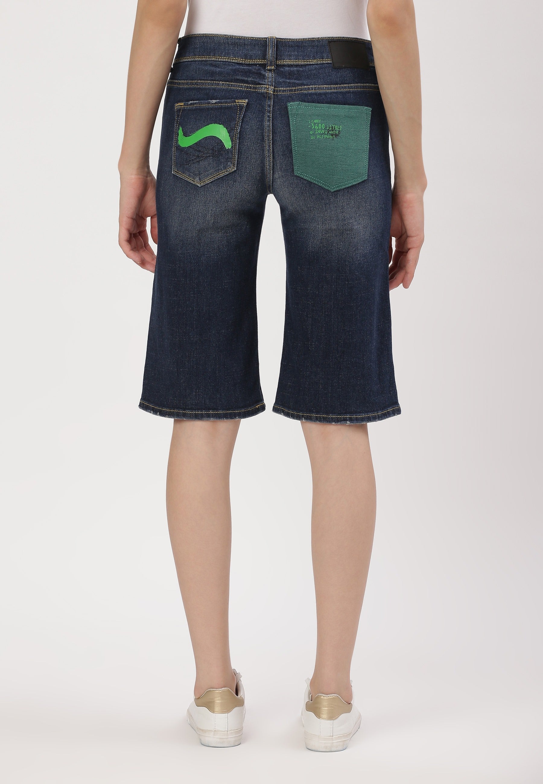 Women's dark indigo bermuda denim shorts that sit low on waist with wide leg openings. A relaxed fit around the hip and thigh. They feature a deep green back pocket that says - ˜I carry ~3600 litres of saved water in this pocket.™