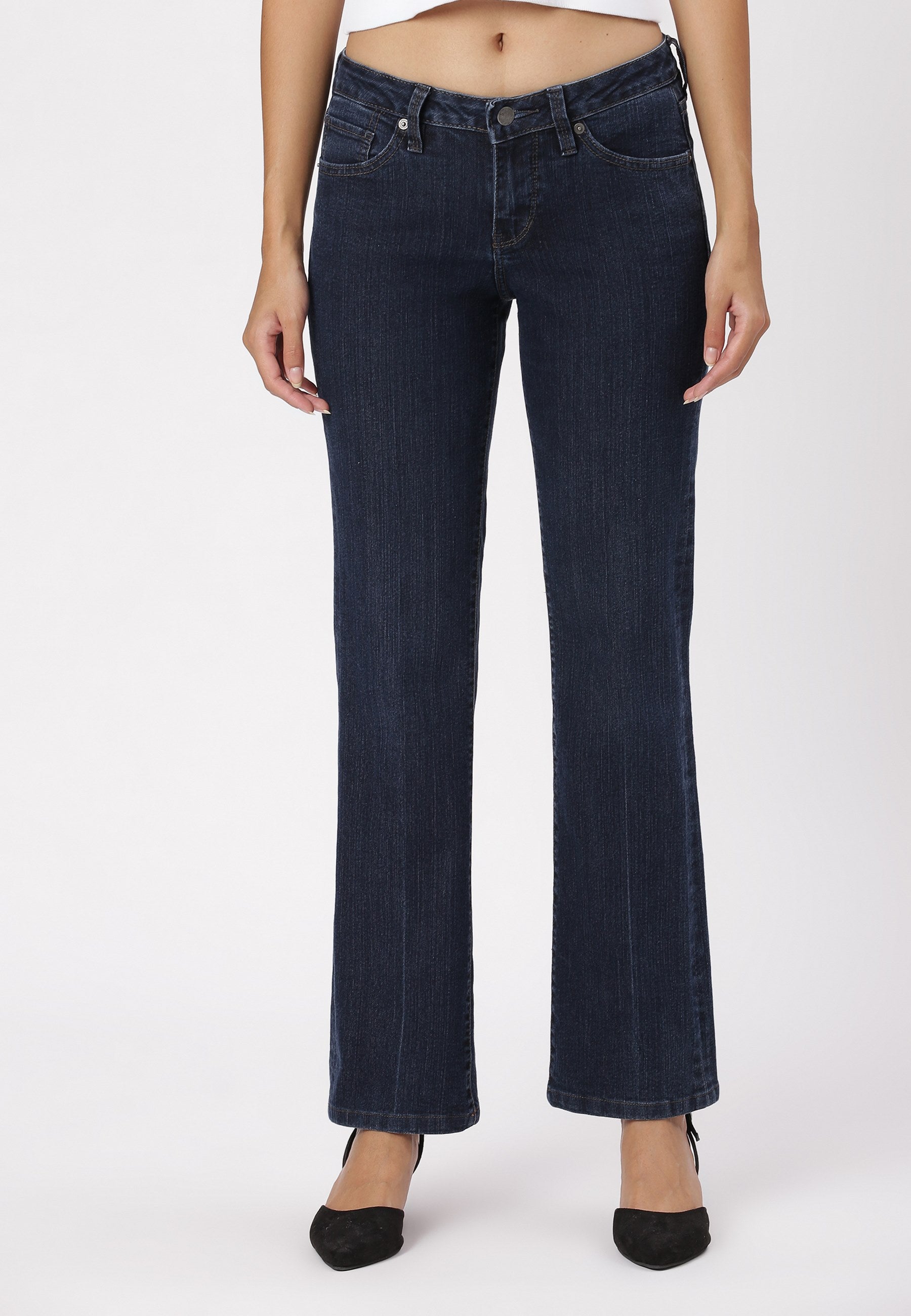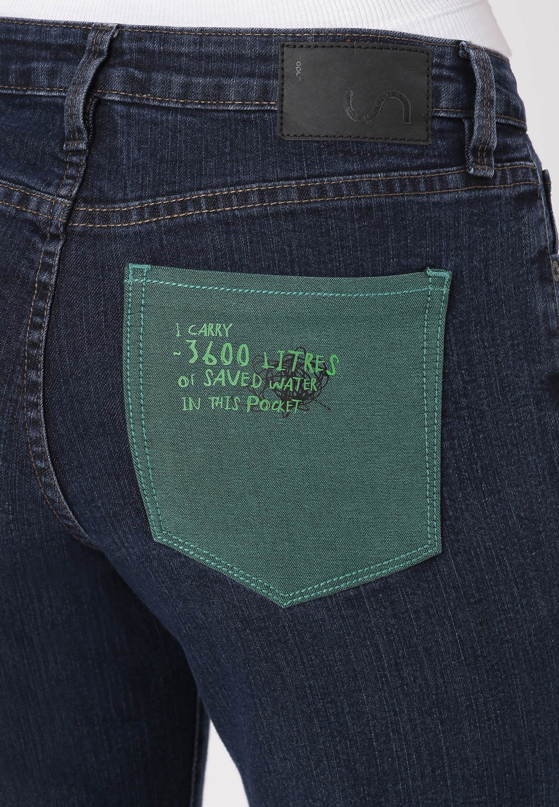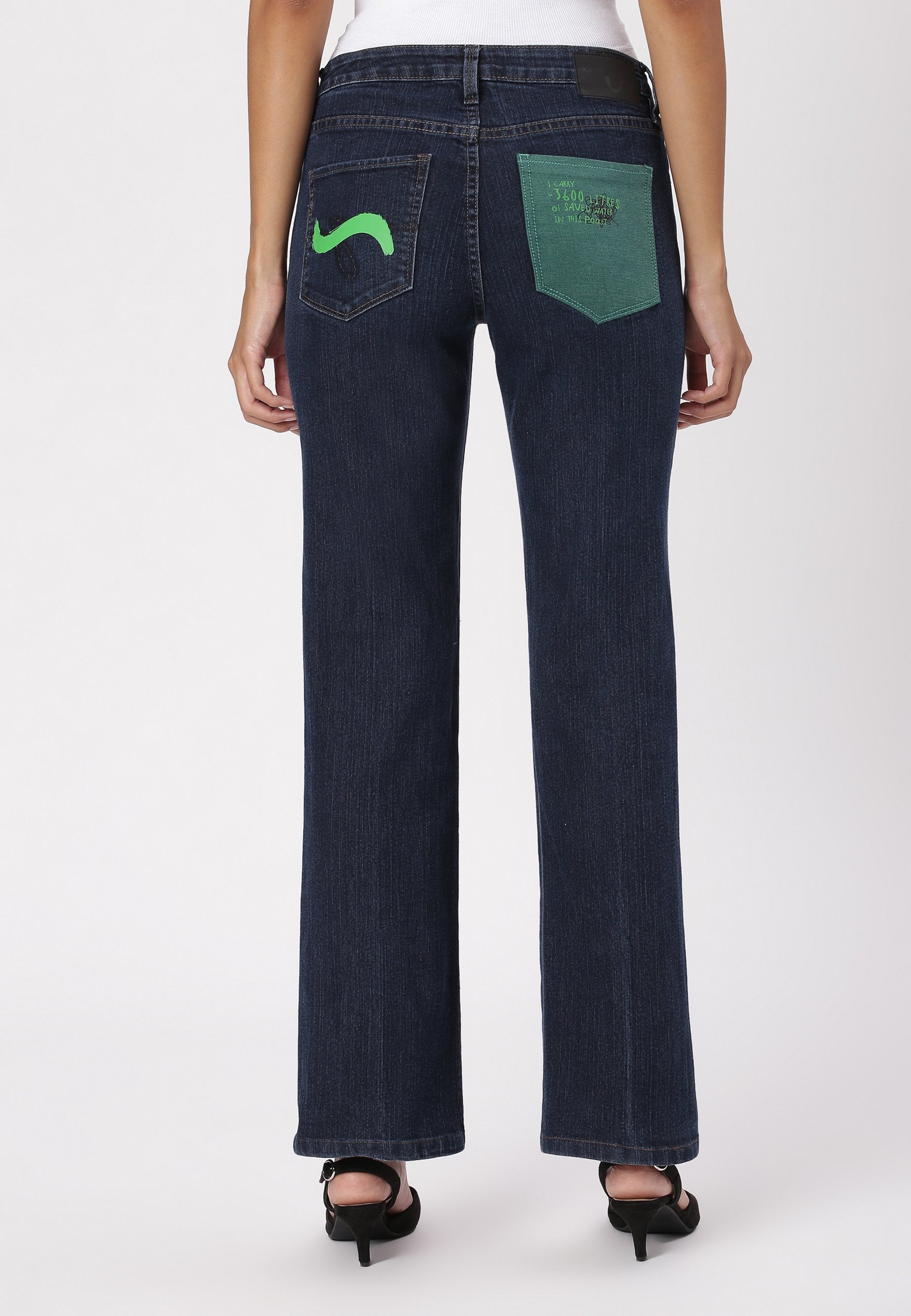 Women's dark indigo straight jeans that sit low on waist with narrow leg openings. They fit fuller through the hip and thigh and run straight from hip to ankle. They feature a deep green back pocket that says - I carry ~3600 litres of saved water in this pocket.™
