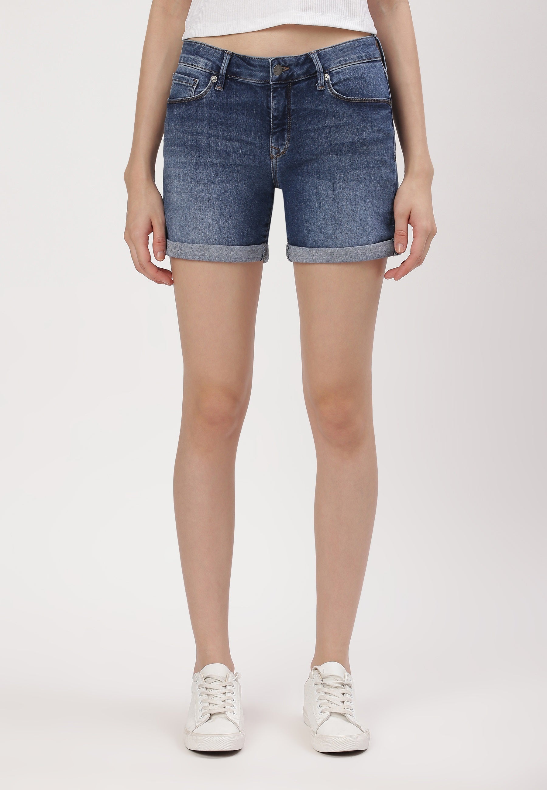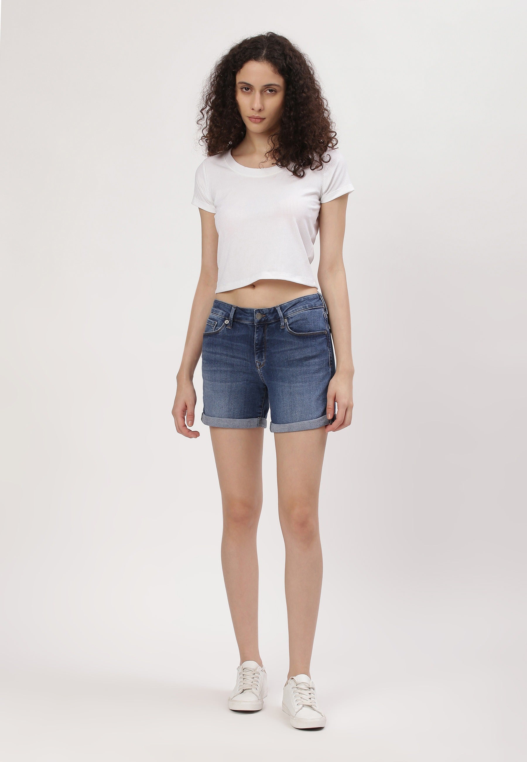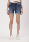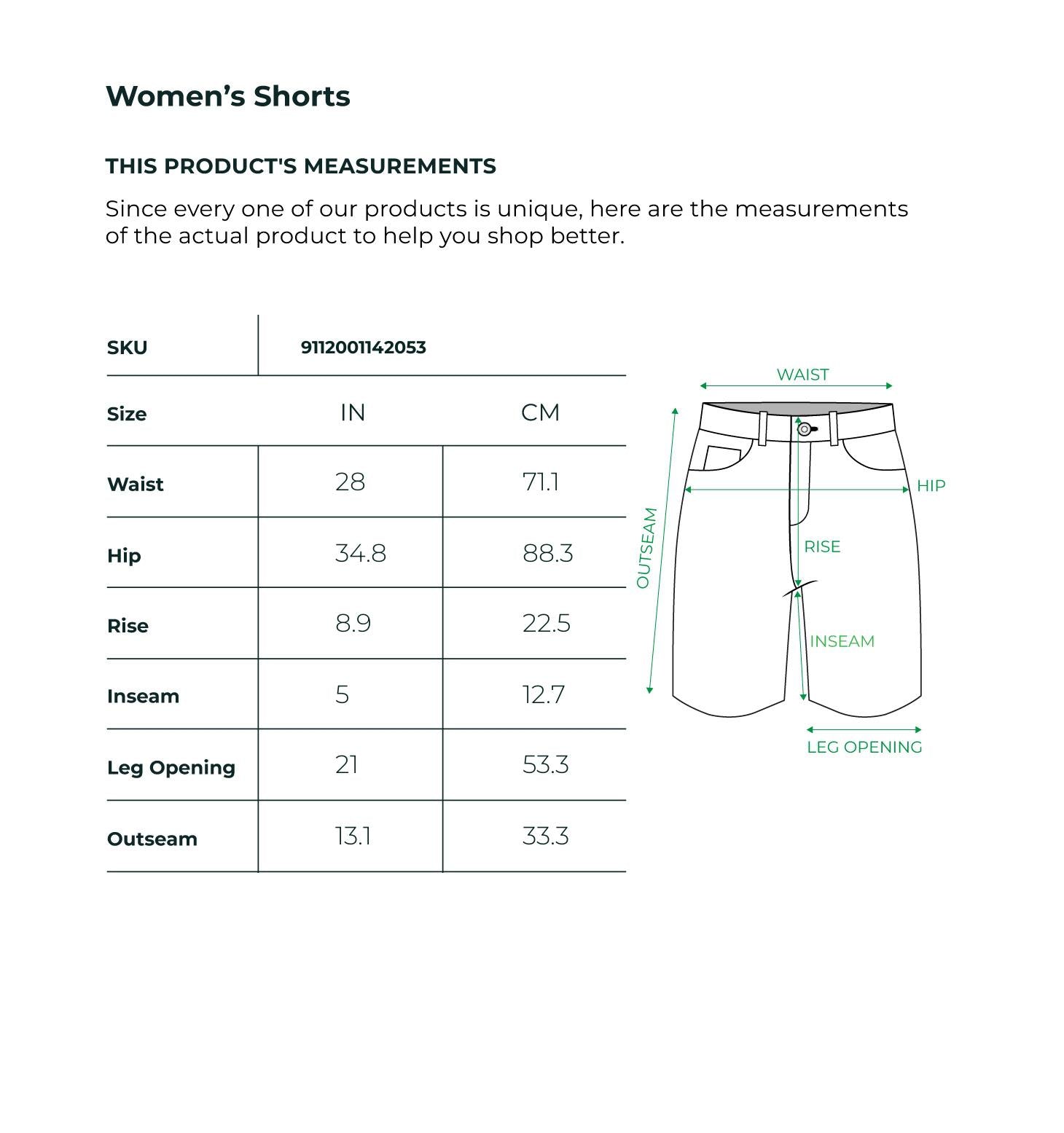 Women's dark indigo straight denim shorts that sit low on waist with narrow leg openings. They fit fuller through the hip and thigh and run straight from hip to hem. They feature a deep green back pocket that says - ‘I carry ~3600 litres of saved water in this pocket.’