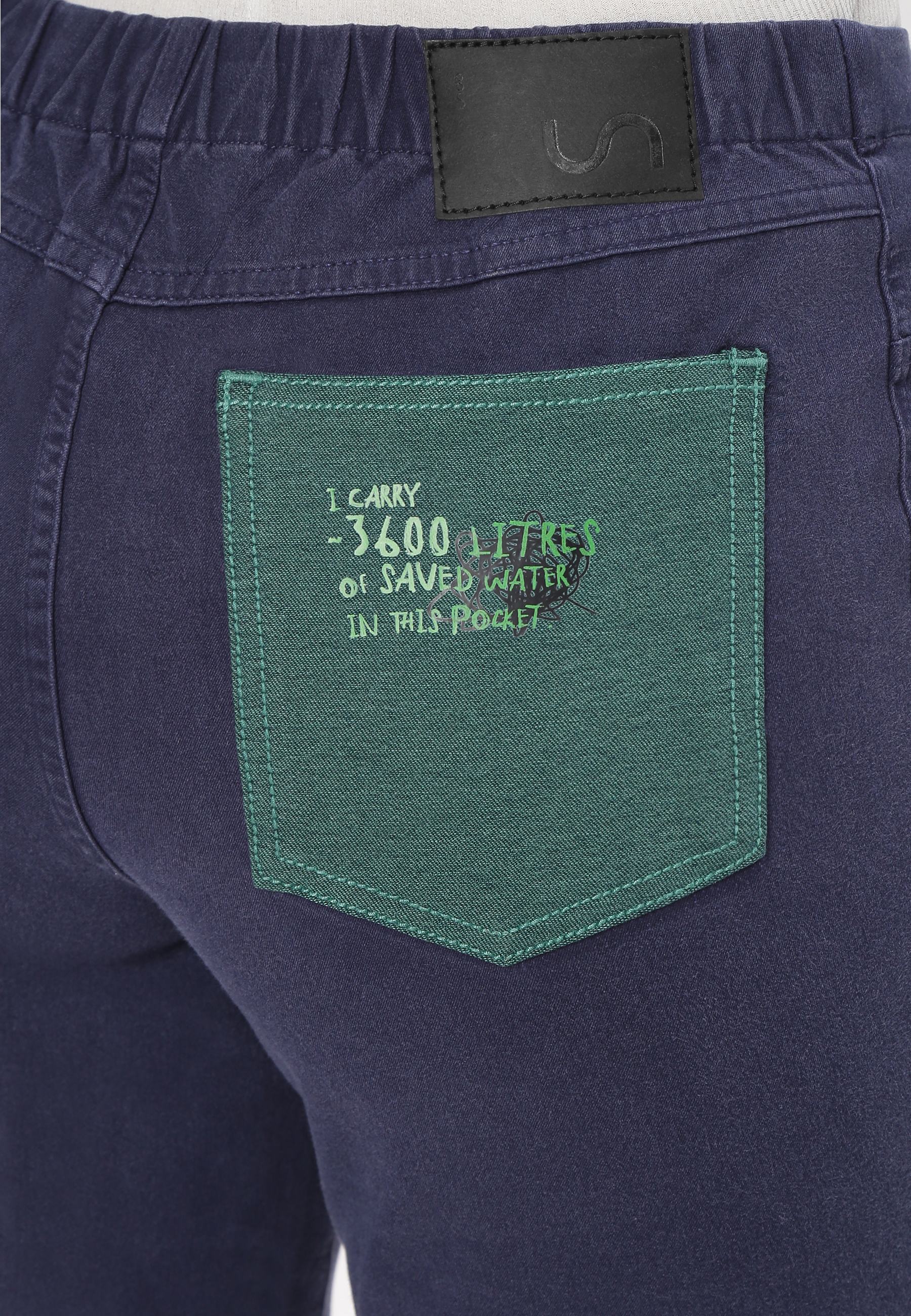 Women's dark indigo straight jeans that sit comfortably at the waist with narrow leg openings. They fit fuller through the hip and thigh and run straight from hip to ankle. They feature a deep green back pocket that says - ‘I carry ~3600 litres of saved water in this pocket.’