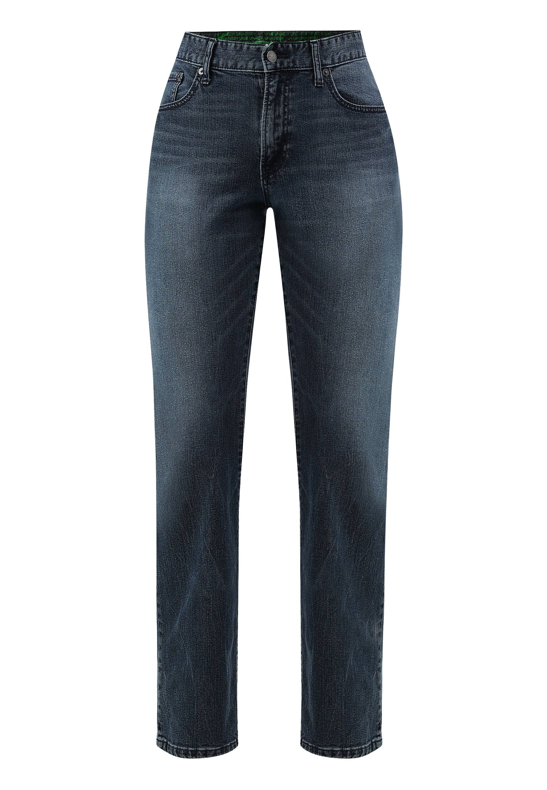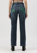 Women's dark indigo straight jeans that sit comfortably at the waist with narrow leg openings. They fit fuller through the hip and thigh and run straight from hip to ankle. They feature a deep green back pocket that says - ‘I carry ~3600 litres of saved water in this pocket.’