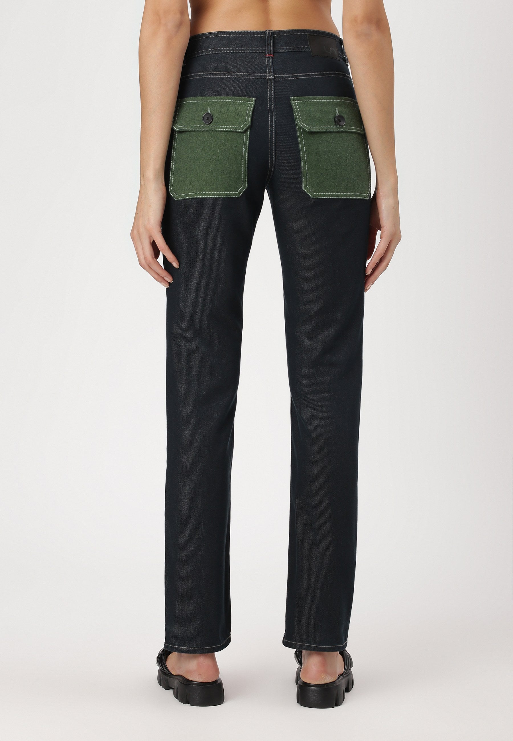 Women's dark indigo straight jeans that sit comfortably at the waist with narrow leg openings. They fit fuller through the hip and thigh and run straight from hip to ankle. They come with bold, earthy green back pockets.
