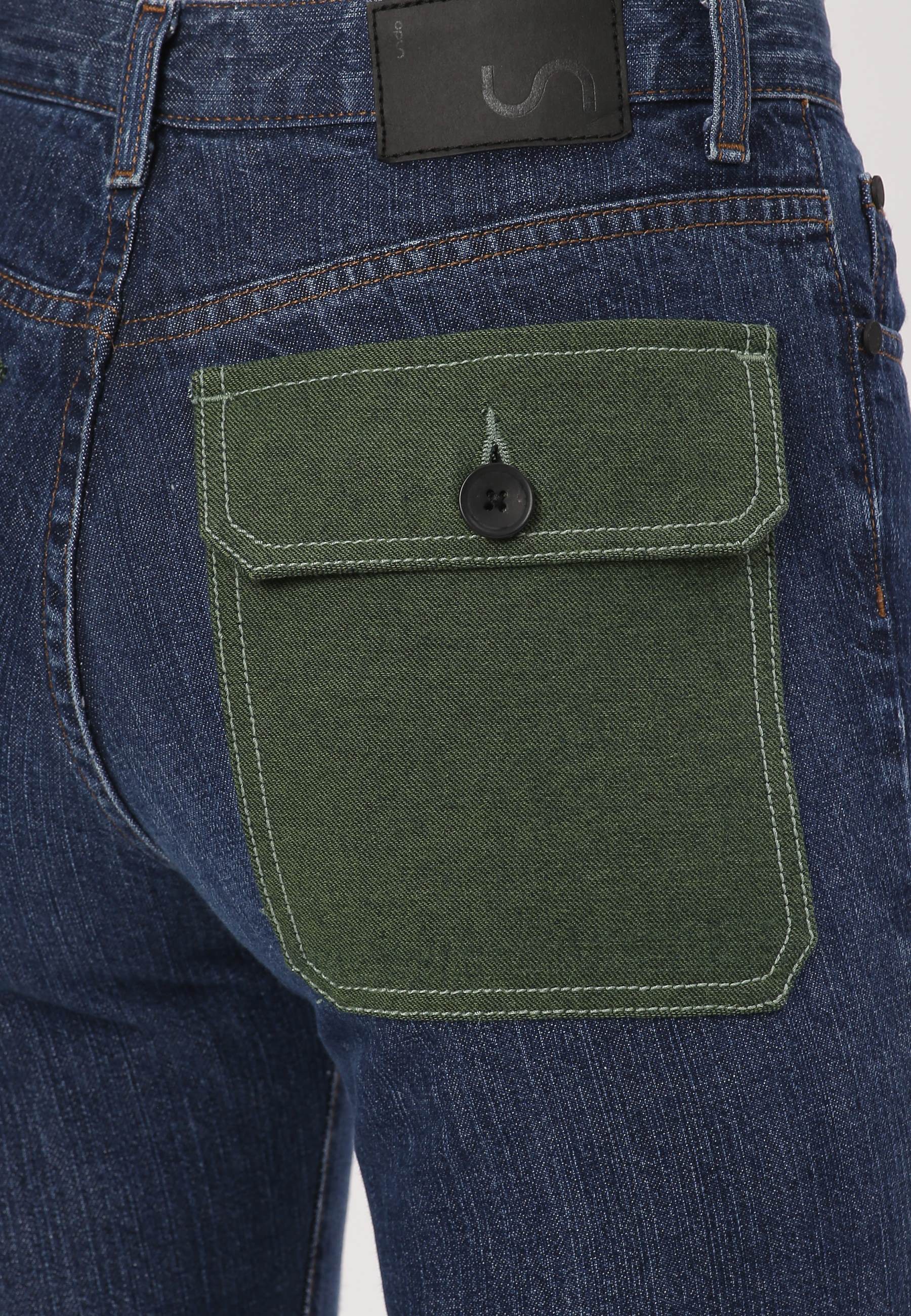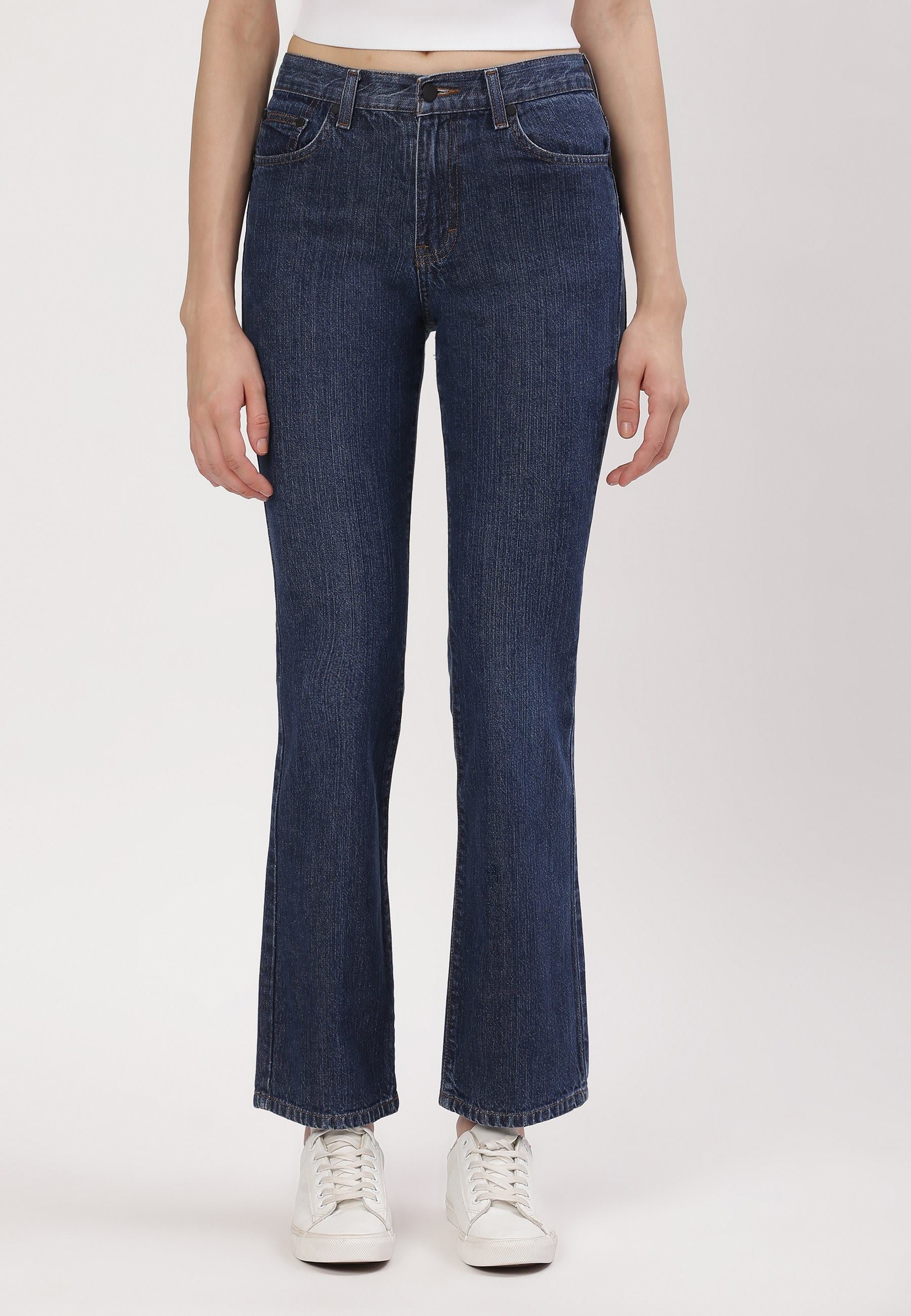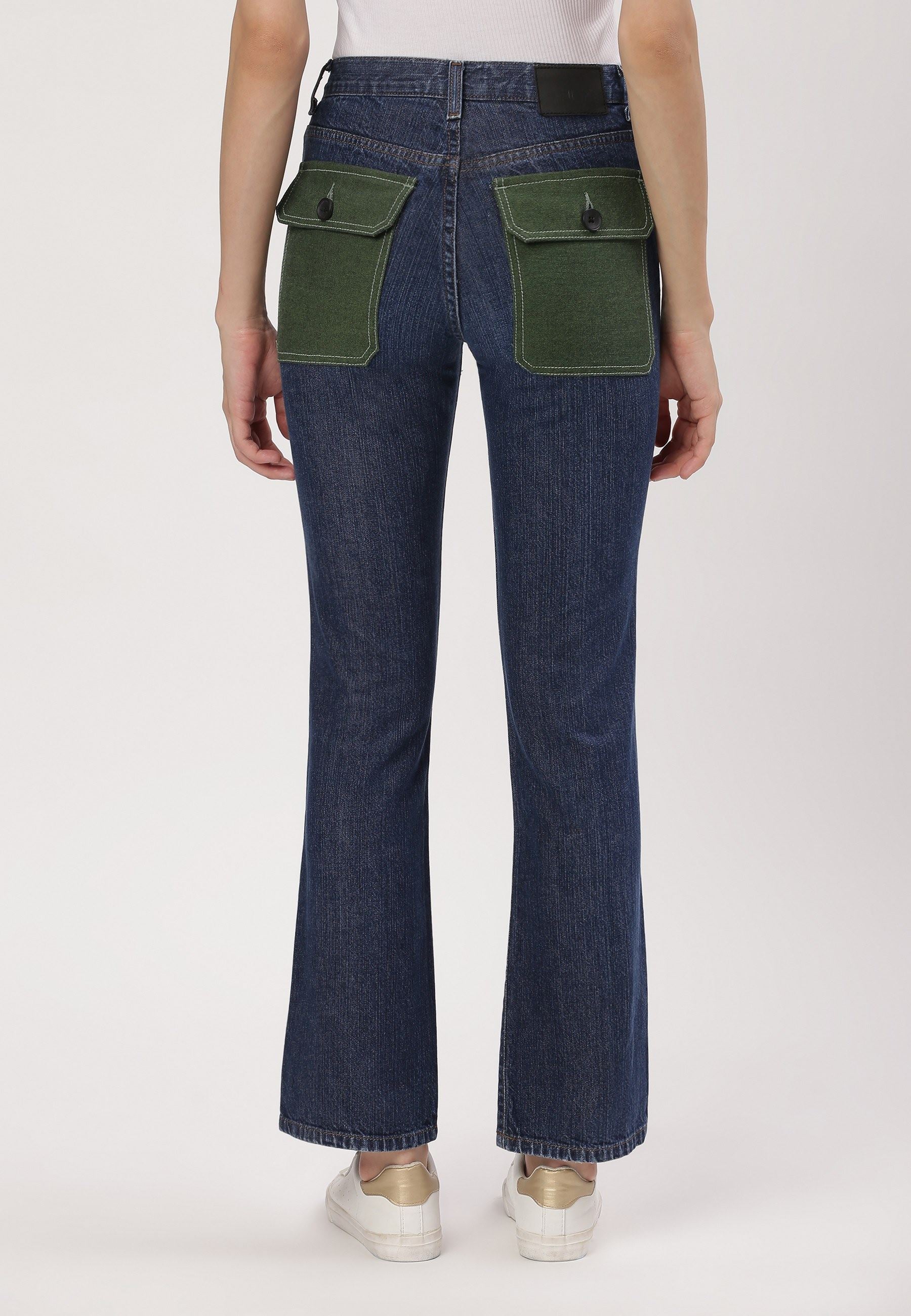 Women's dark indigo straight jeans that sit comfortably at the waist with narrow leg openings. They fit fuller through the hip and thigh and run straight from hip to ankle. They come with bold, earthy green back pockets.