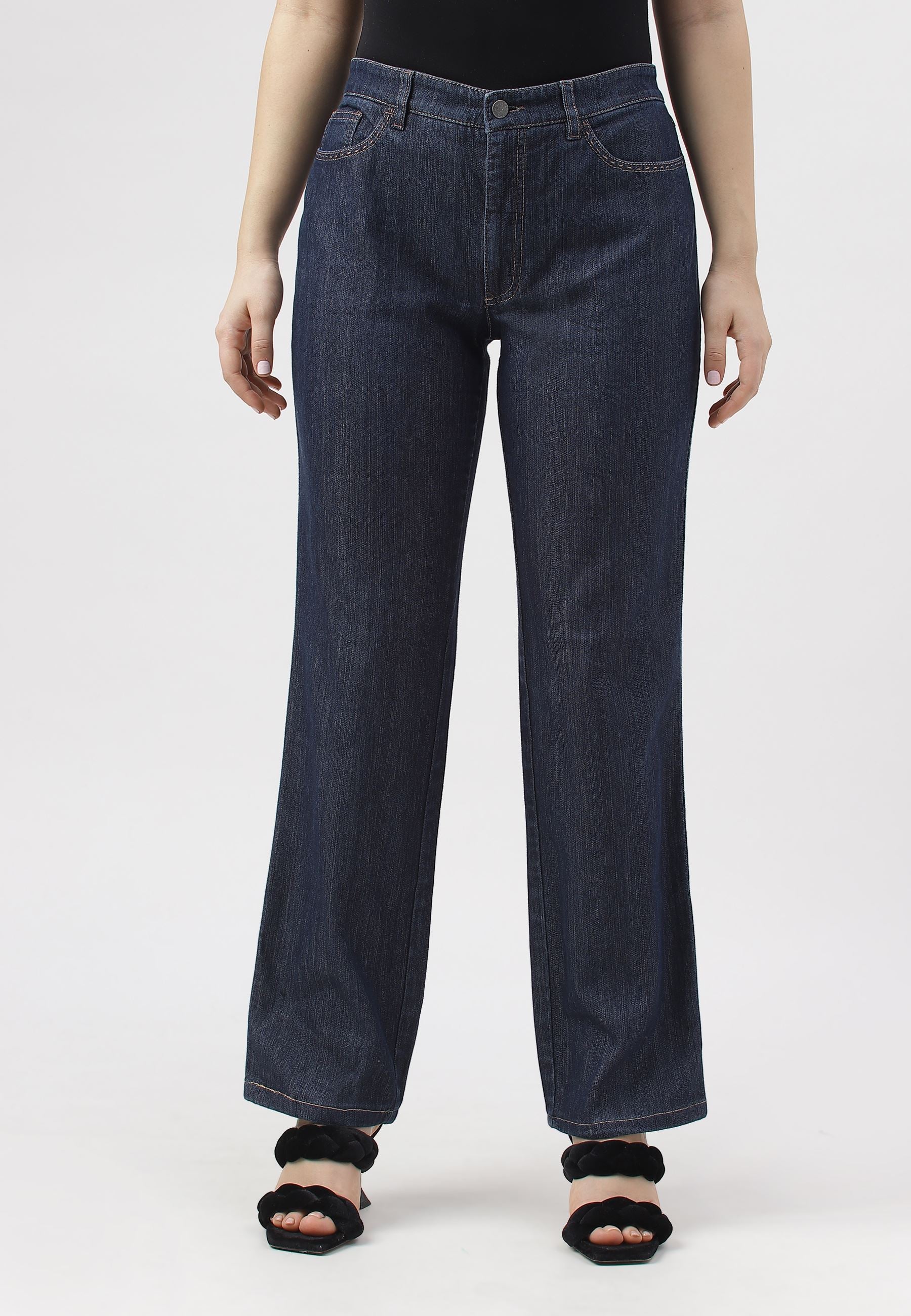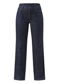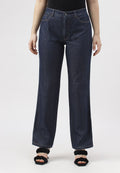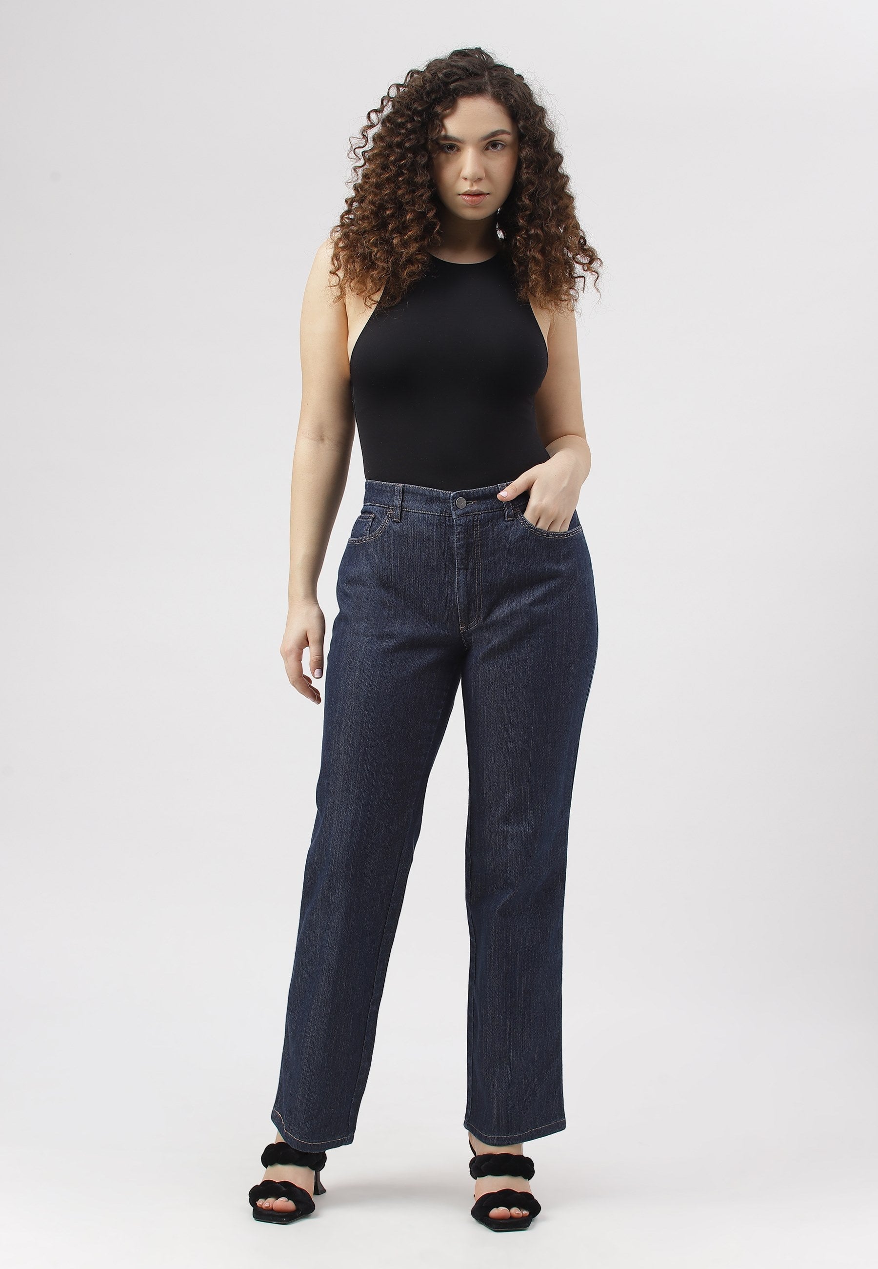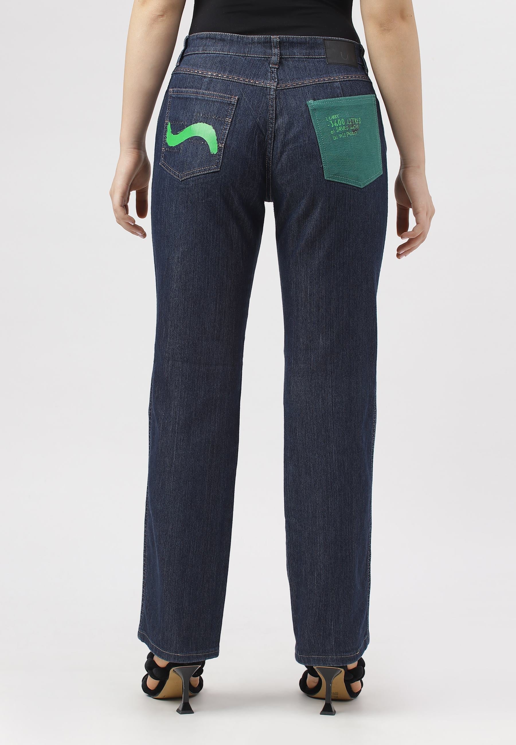 Women's dark indigo straight jeans that sit comfortably at the waist with narrow leg openings. They fit fuller through the hip and thigh and run straight from hip to ankle. They feature a deep green back pocket that says - ‘I carry ~3600 litres of saved water in this pocket.’