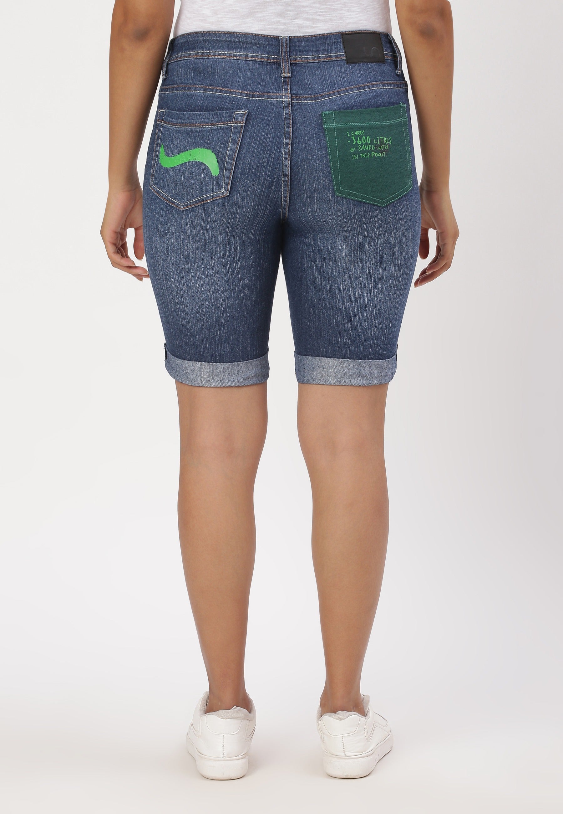 Women's dark indigo straight denim shorts that sit comfortably at the waist with narrow leg openings. They fit fuller through the hip and thigh and run straight from hip to hem. They feature a deep green back pocket that says - ˜I carry ~3600 litres of saved water in this pocket.™