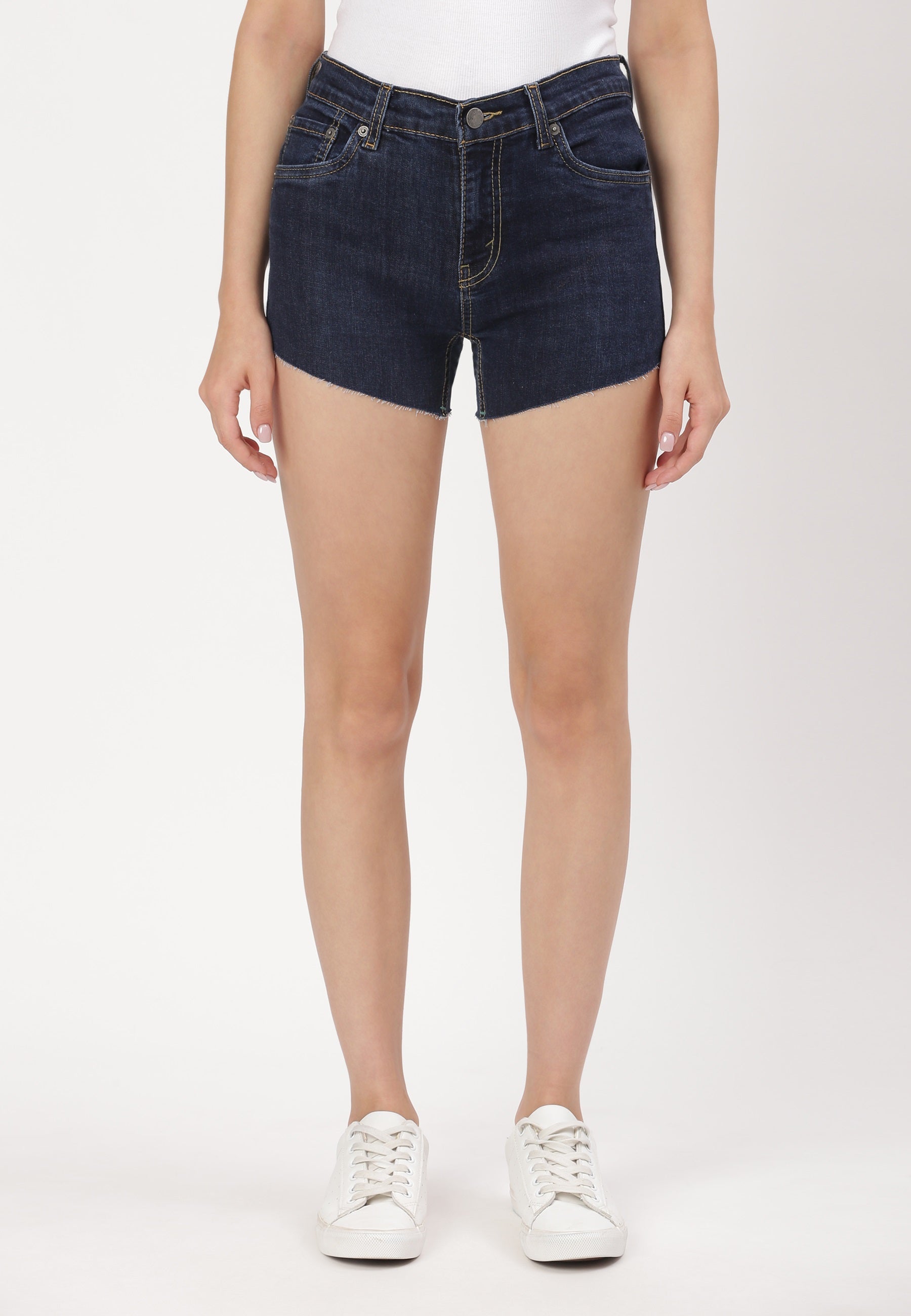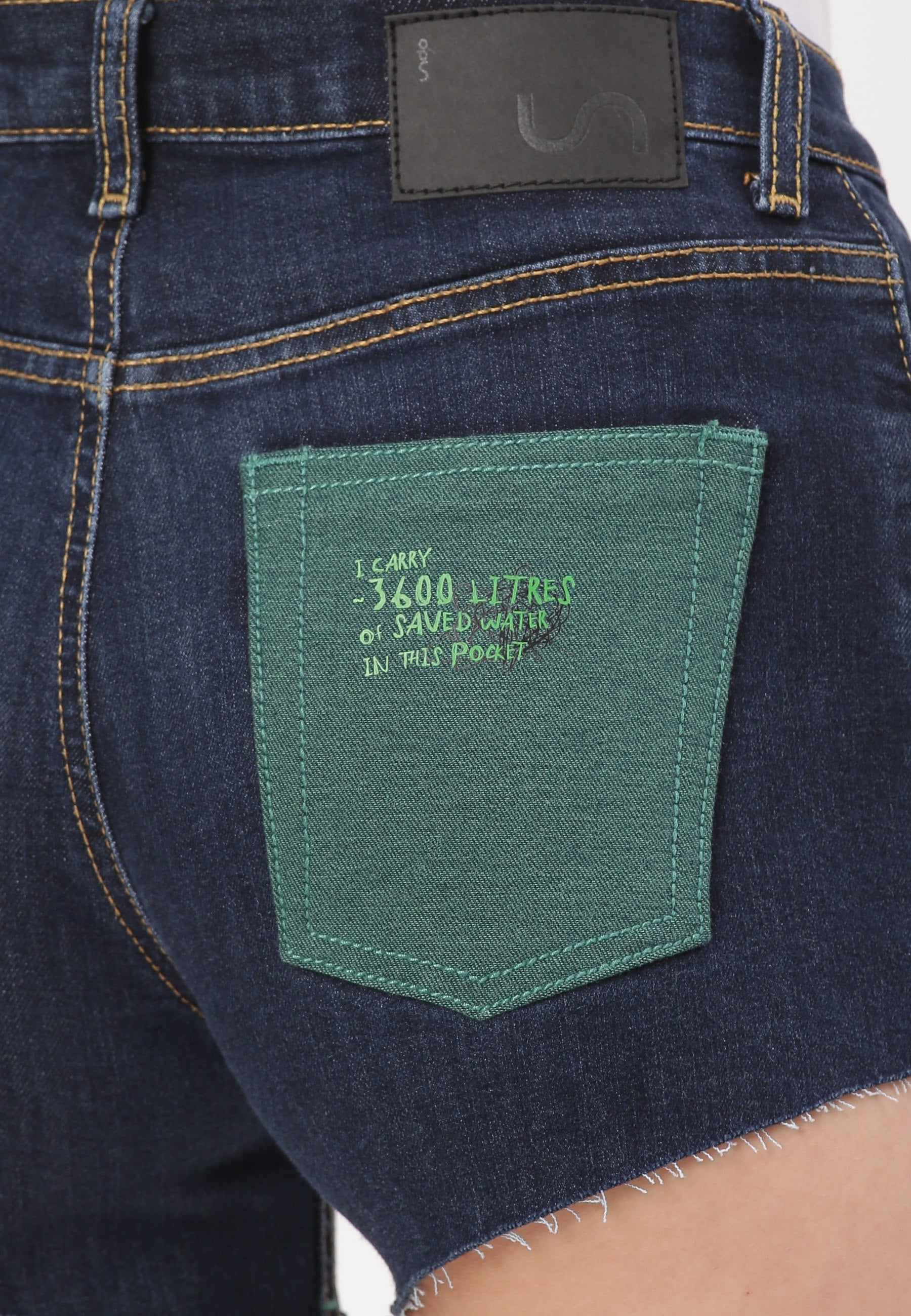 Women's dark indigo straight denim shorts that sit comfortably at the waist with narrow leg openings. They fit fuller through the hip and thigh and run straight from hip to hem. They feature a deep green back pocket that says - ‘I carry ~3600 litres of saved water in this pocket.’