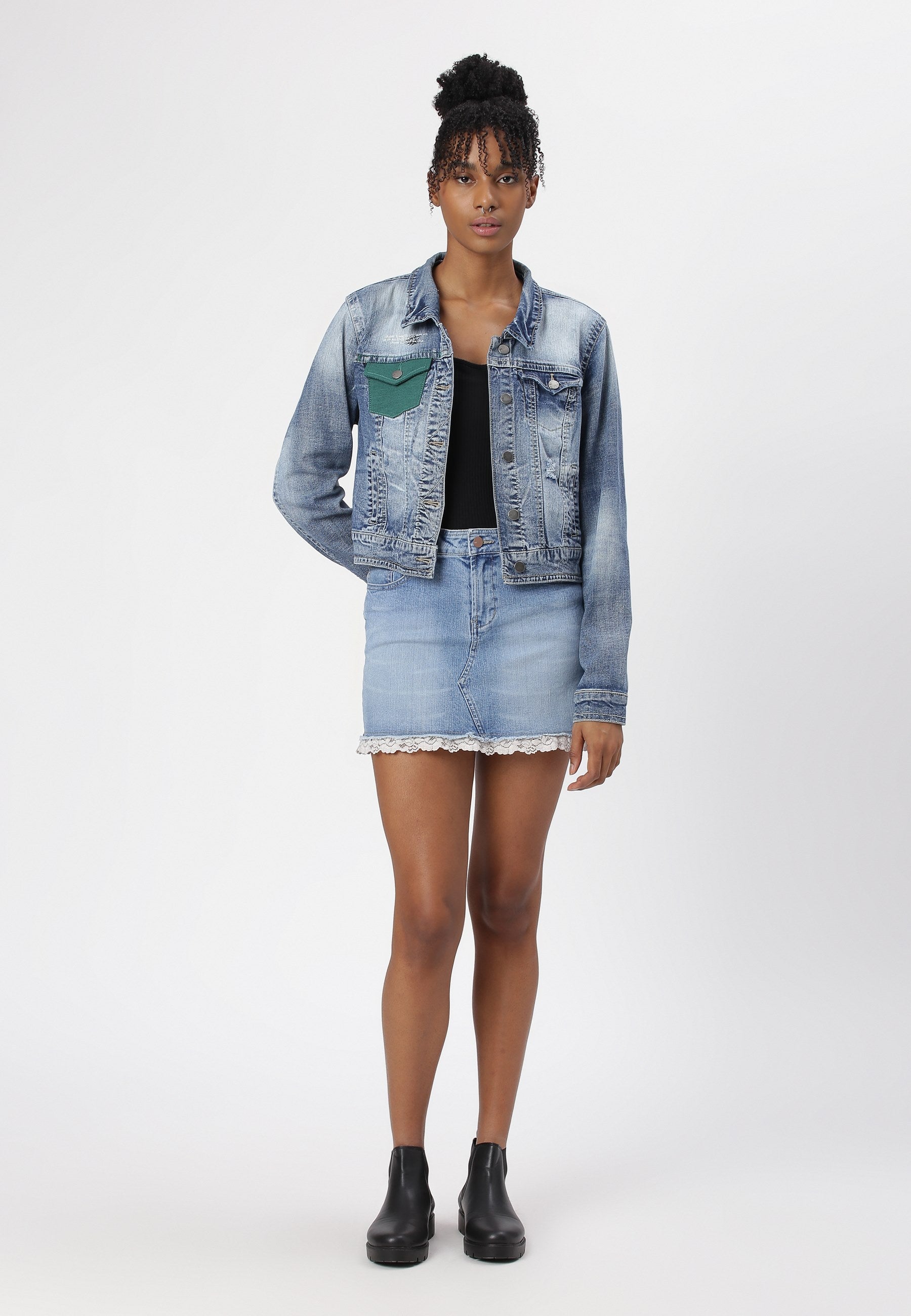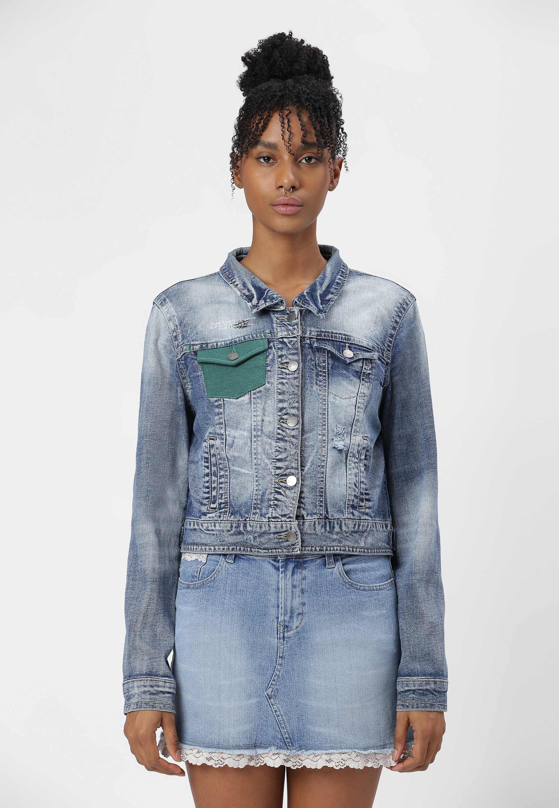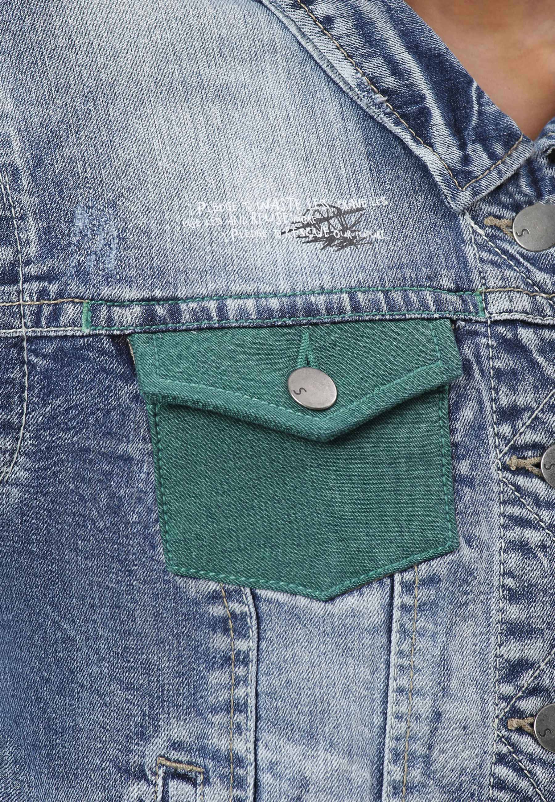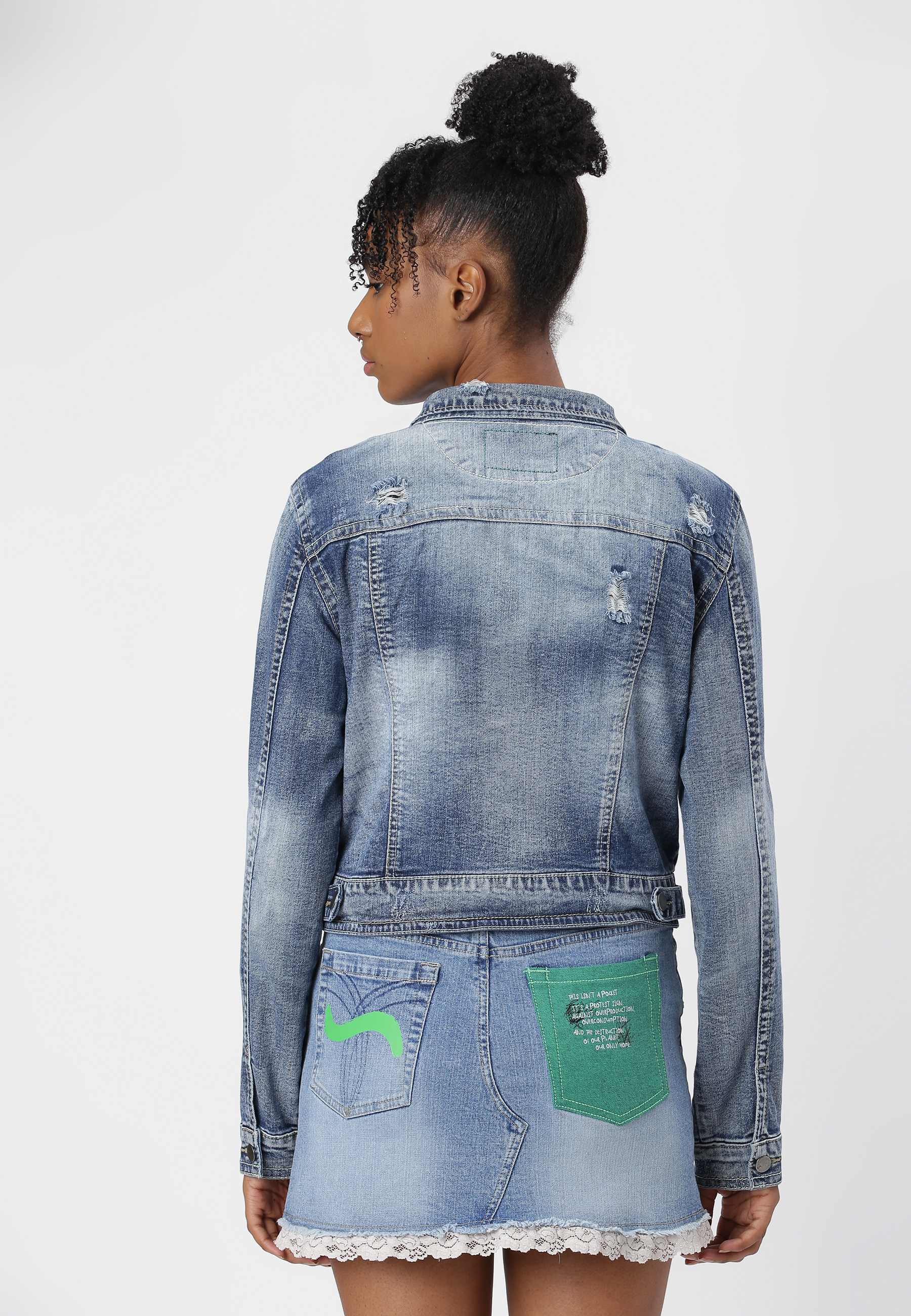 Women's dark indigo trucker denim jacket. An iconic jacket style with a slim casual cut, spread collar, pointed flap chest pockets, button tab waist adjusters, and two V-shaped seams that run from chest pocket to waist. It features a deep green pocket that says - ‘I pledge to waste less, crave less, use less and reuse more. I pledge to rescue our future.'