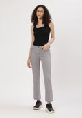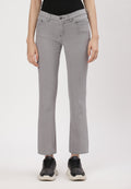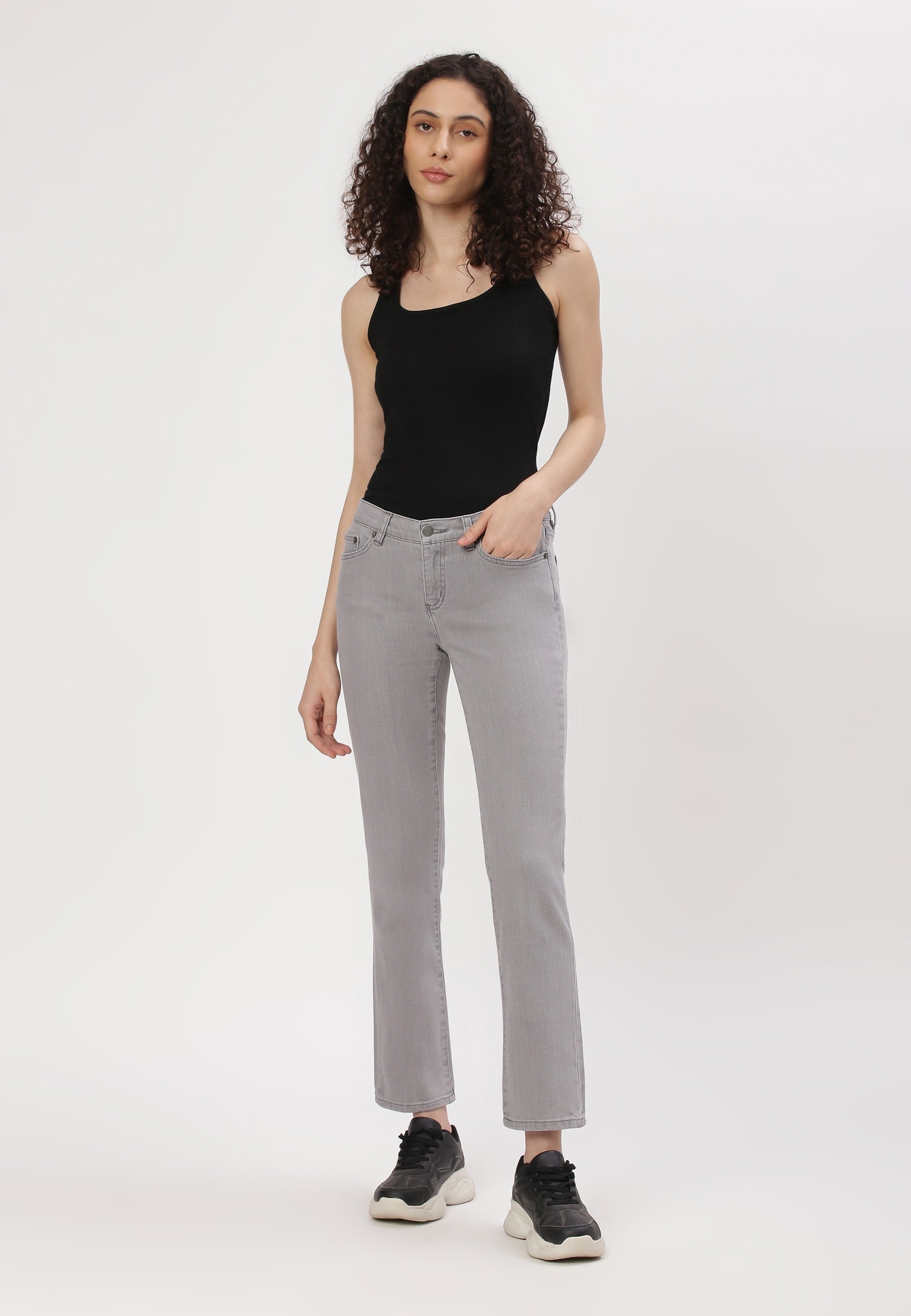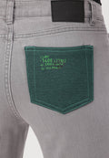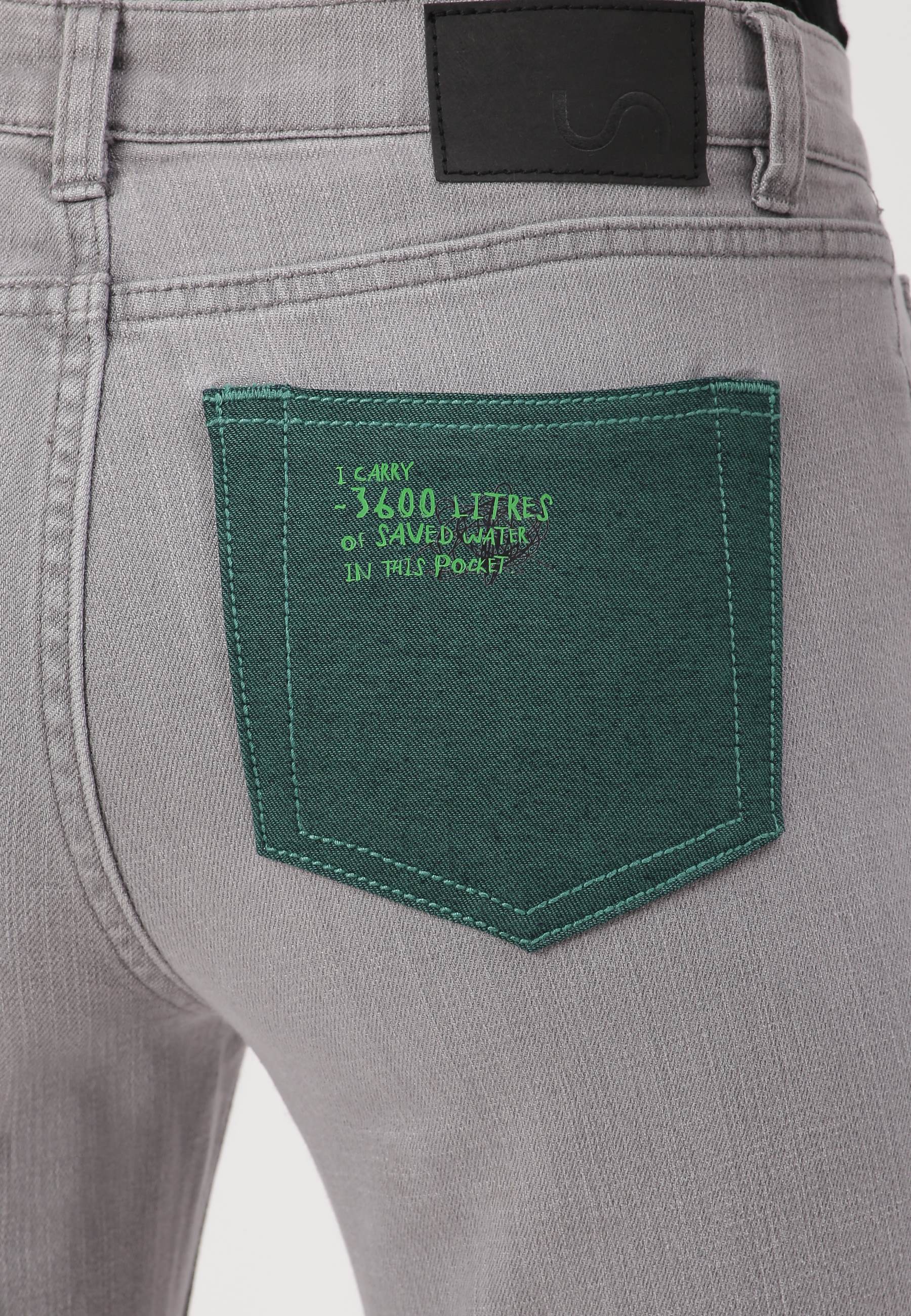Women's grey straight jeans that sit low on waist with narrow leg openings. They fit fuller through the hip and thigh and run straight from hip to ankle. They feature a deep green back pocket that says - ‘I carry ~3600 litres of saved water in this pocket.’