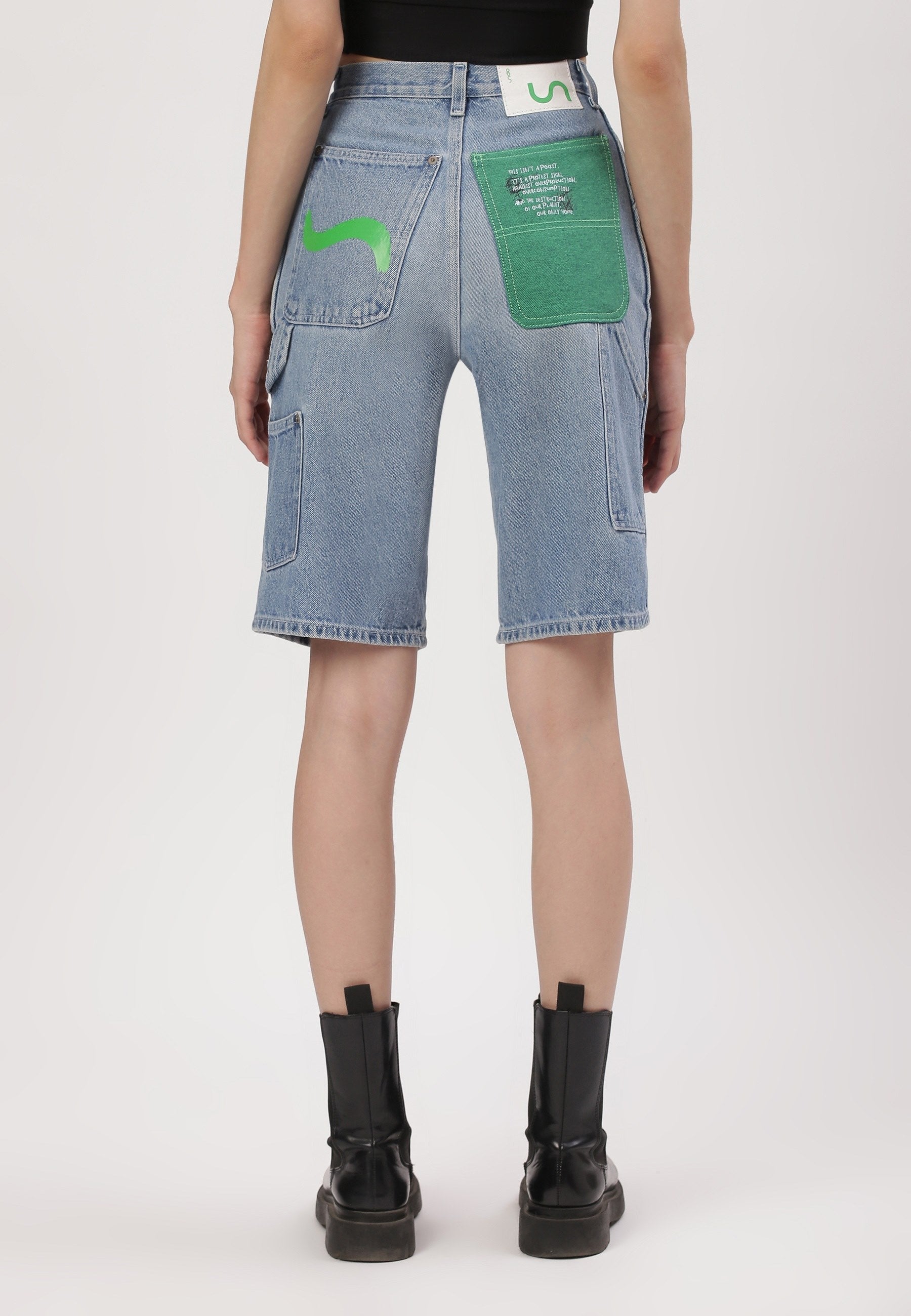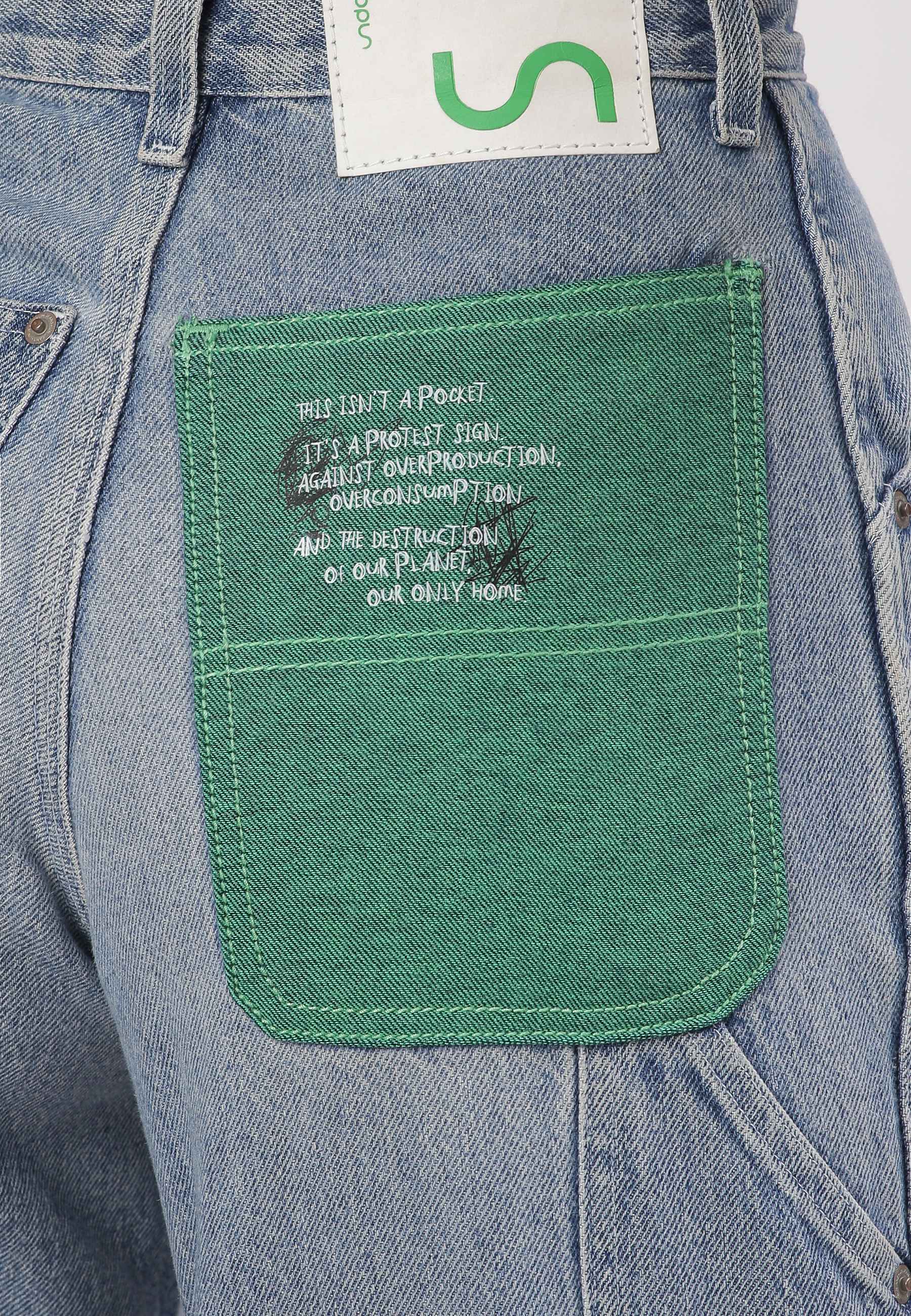 Women's light indigo bermuda denim shorts that sit high on the waist with wide leg openings. A relaxed fit around the hip and thigh. They feature Un Denim's signature GreenPocket™ that says - ‘This is not a green pocket, it’s a protest sign, against overproduction, overconsumption and the destruction of our planet, our only home.’