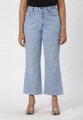 Women's light indigo bootcut jeans that sit high on the waist with wide leg openings. They fit snugly through the thigh and flare out from the knee. They placeholder for RS63