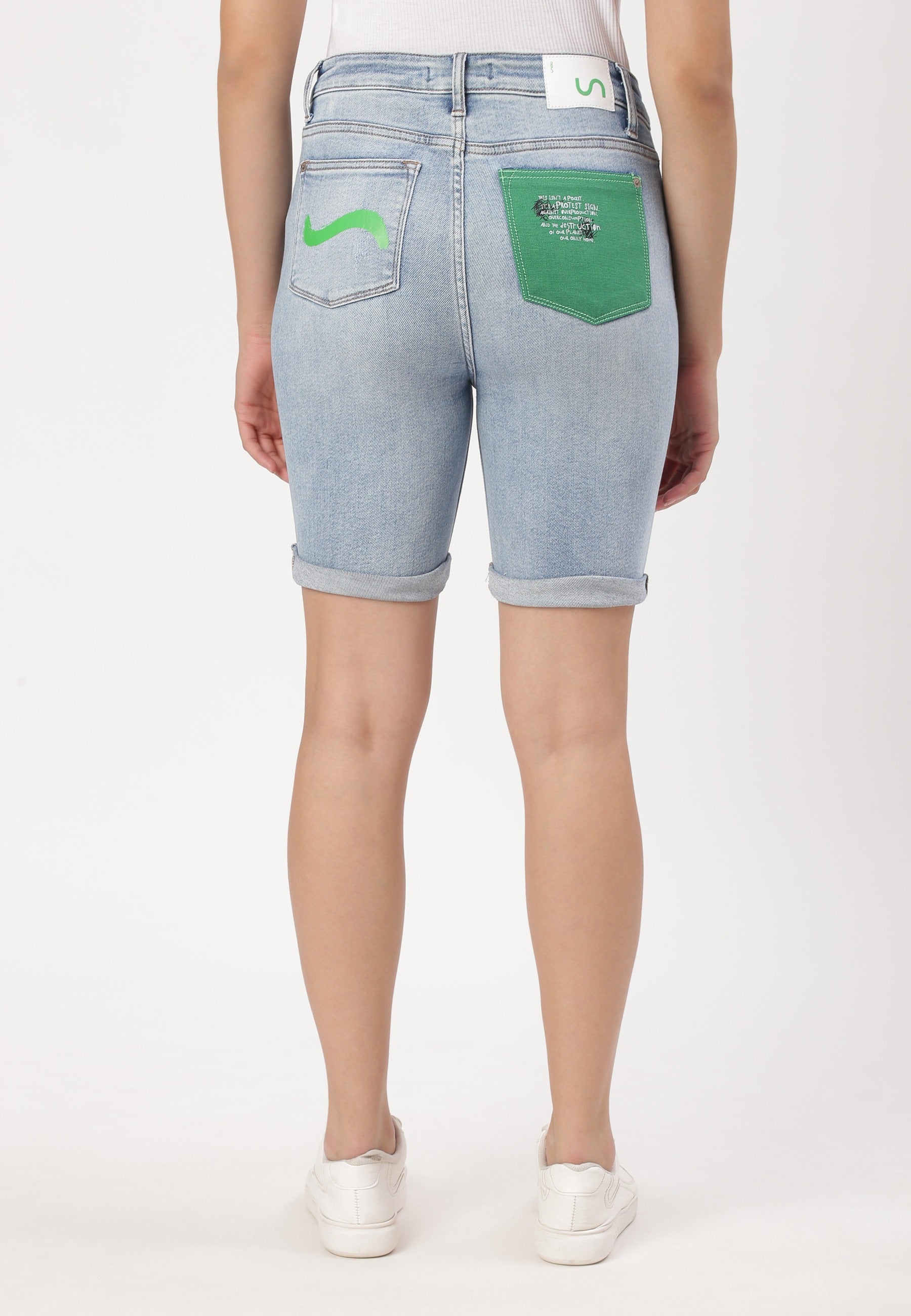 Women's light indigo cycling denim shorts that sit high on the waist with narrow leg openings. They fit snugly from thigh to knee. They feature Un Denim's signature GreenPocket™ that says - ‘This is not a green pocket, it’s a protest sign, against overproduction, overconsumption and the destruction of our planet, our only home.’