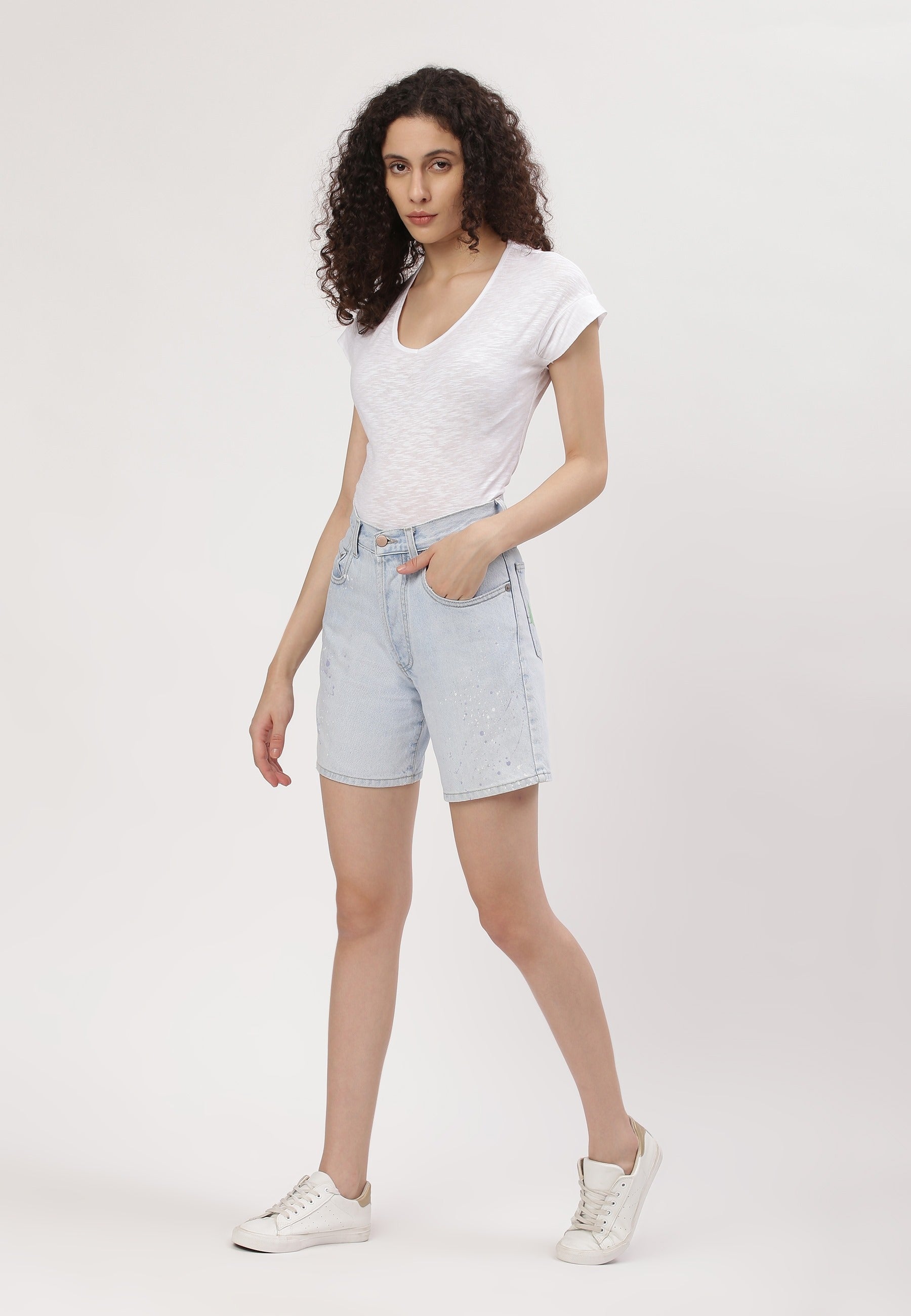 Women's light indigo mom fit denim shorts that sit high on the waist with wide leg openings. They fit loose around the upper thigh, flaring out slightly from the waist. They feature Un Denim's signature GreenPocket™ that says - ‘This is not a green pocket, it’s a protest sign, against overproduction, overconsumption and the destruction of our planet, our only home.’
