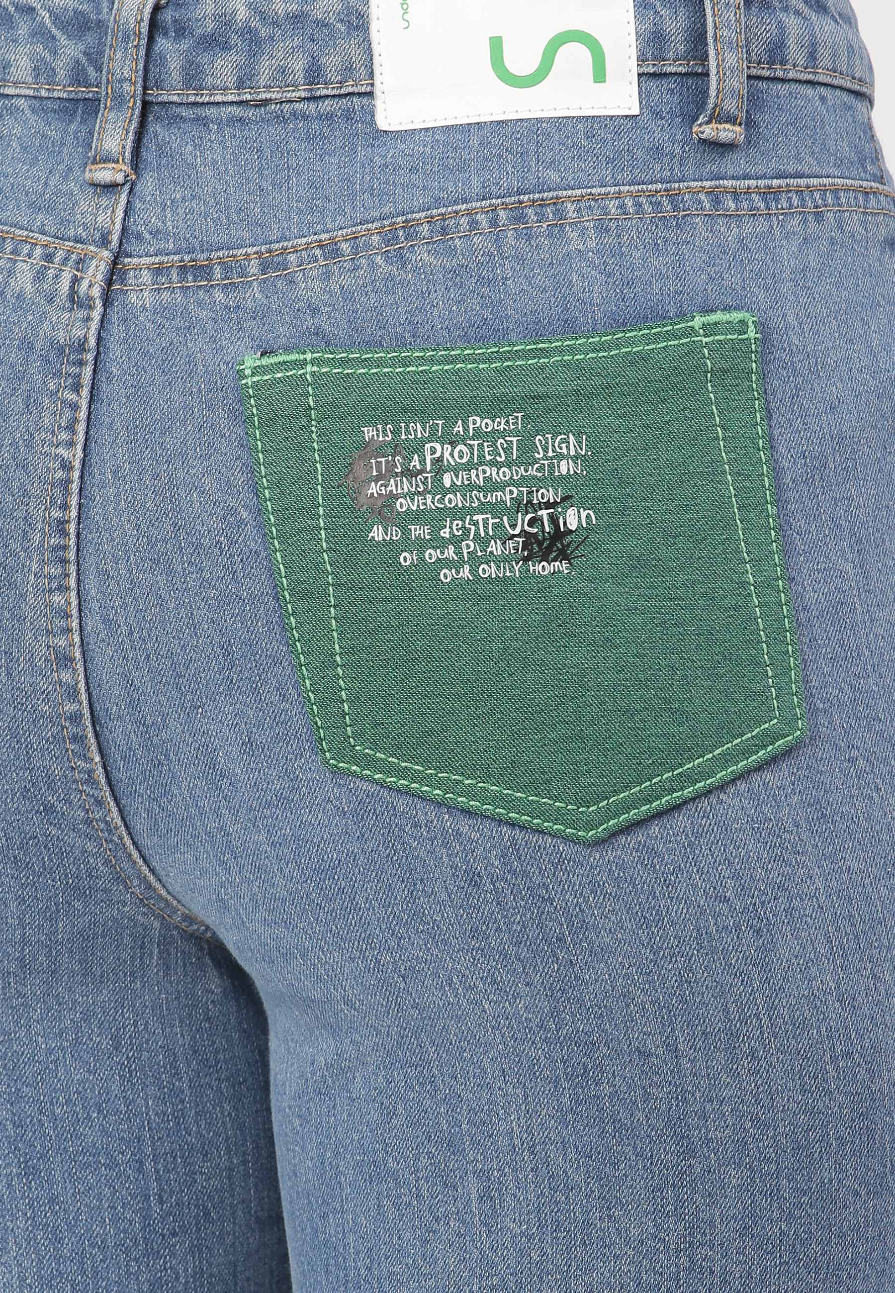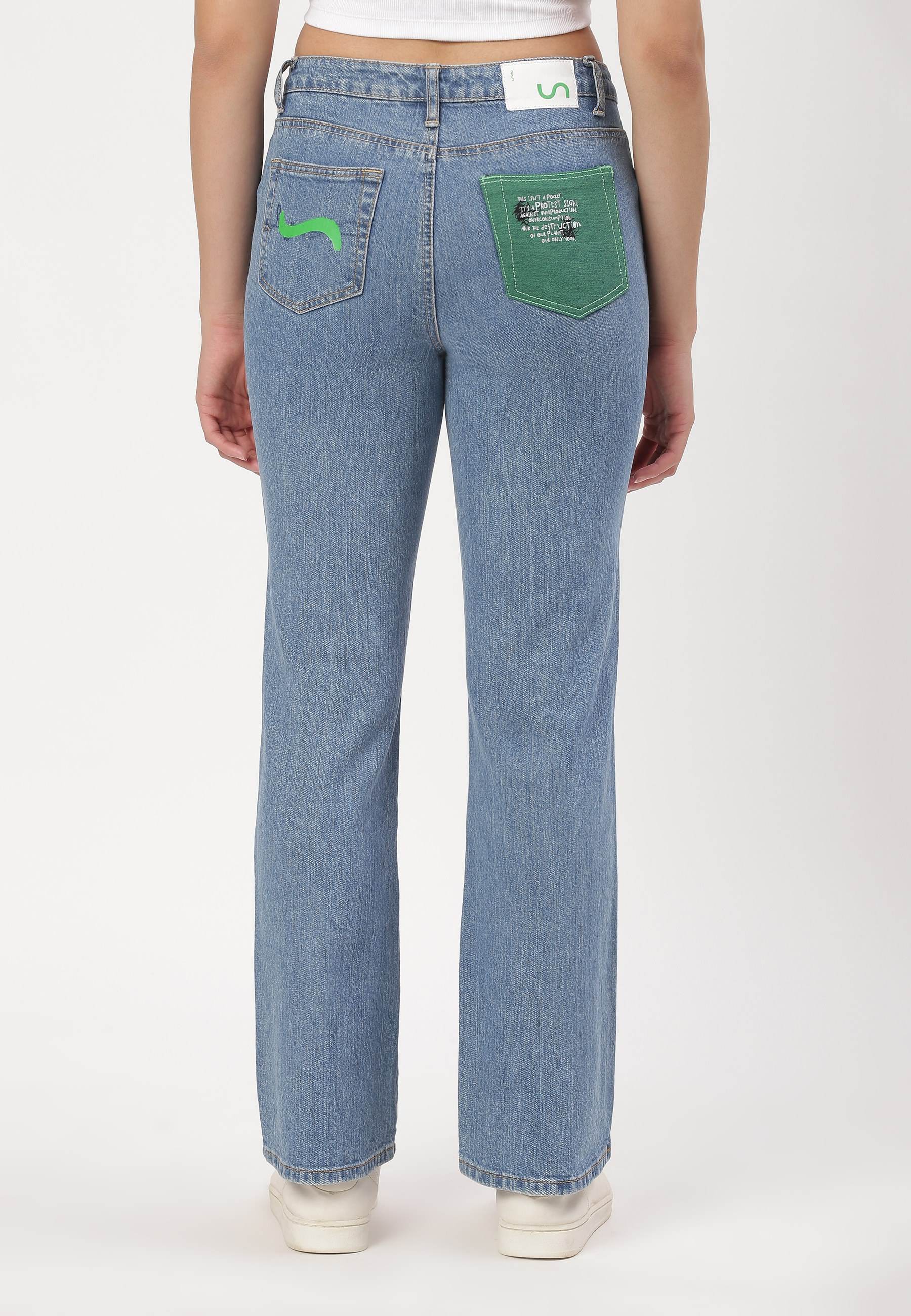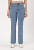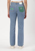 Women's light indigo straight jeans that sit high on the waist with narrow leg openings. They fit fuller through the hip and thigh and run straight from hip to ankle. They feature Un Denim's signature GreenPocket™ that says - ‘This is not a green pocket, it’s a protest sign, against overproduction, overconsumption and the destruction of our planet, our only home.’