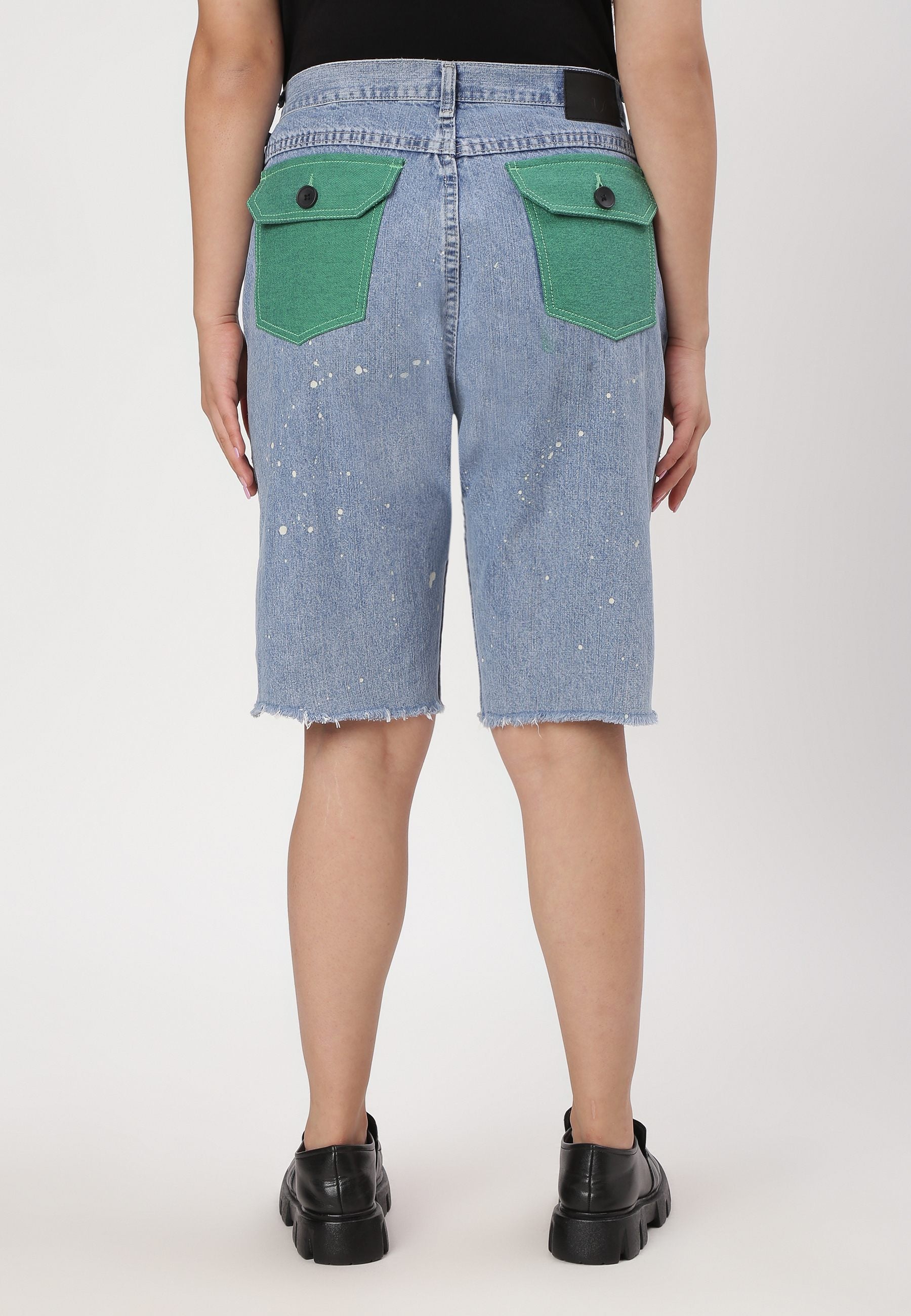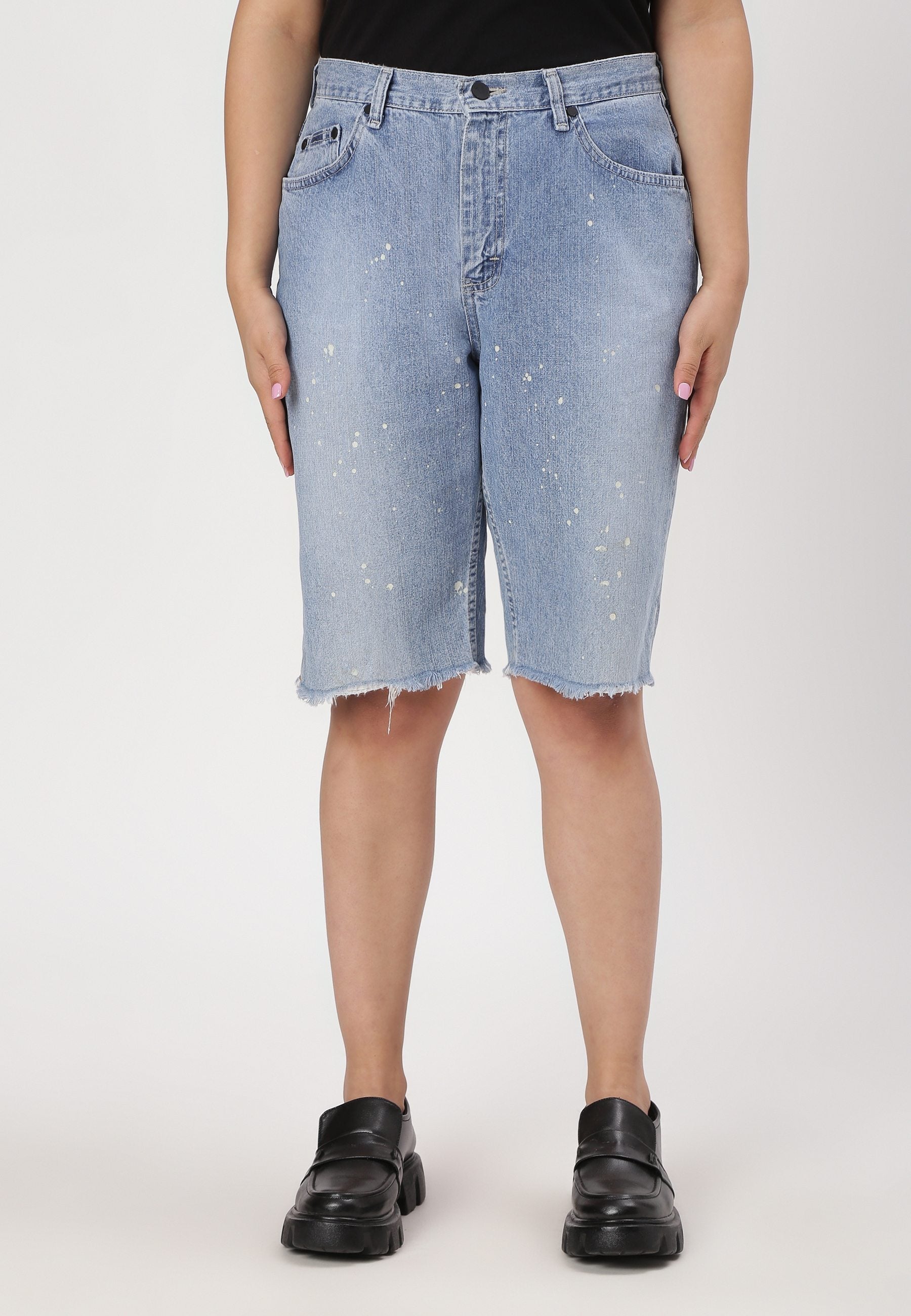 Women's light indigo straight denim shorts that sit high on the waist with narrow leg openings. They fit fuller through the hip and thigh and run straight from hip to hem. They placeholder for RS63