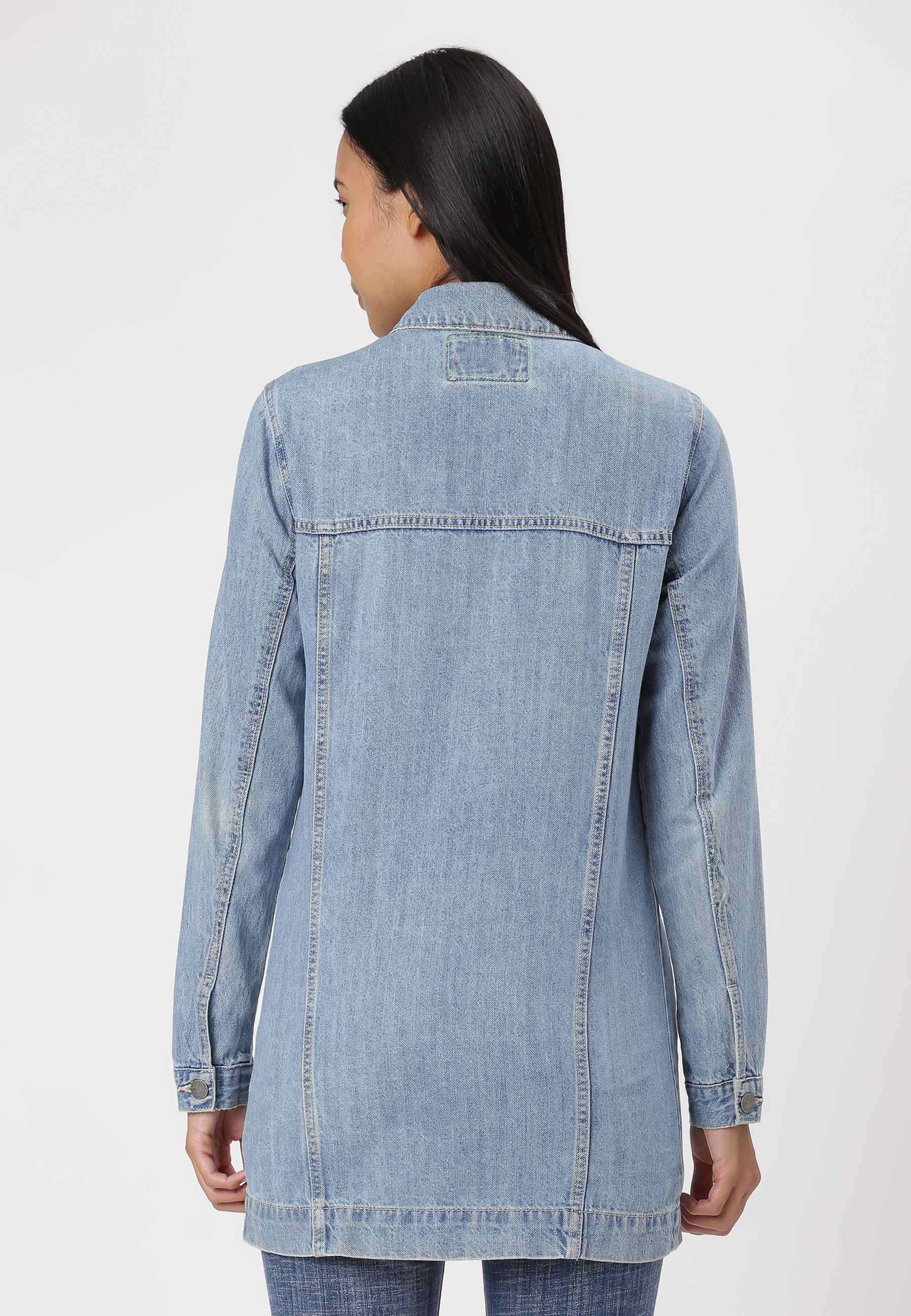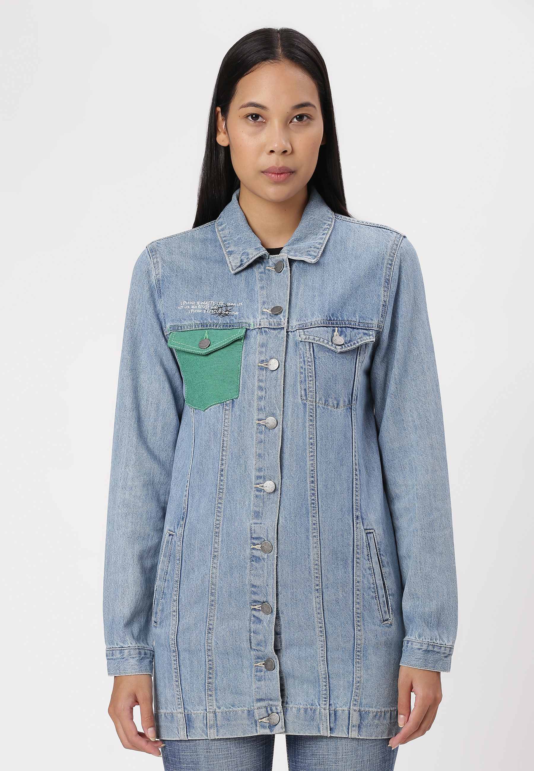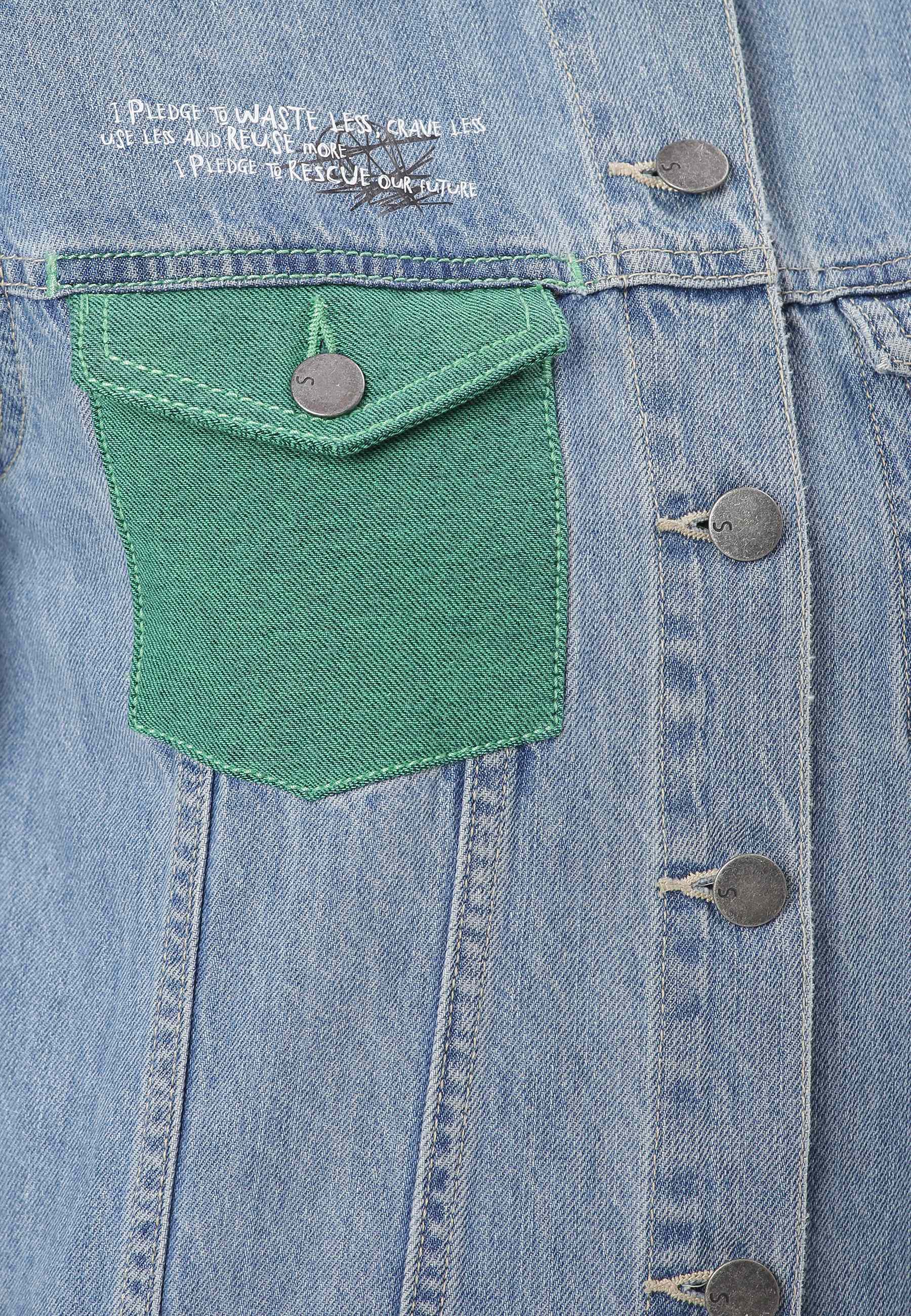 Women's light indigo trucker denim jacket. An iconic jacket style with a slim casual cut, spread collar, pointed flap chest pockets, button tab waist adjusters, and two V-shaped seams that run from chest pocket to waist. It features Un Denim's signature GreenPocket™ that says - ‘I pledge to waste less, crave less, use less and reuse more. I pledge to rescue our future.'