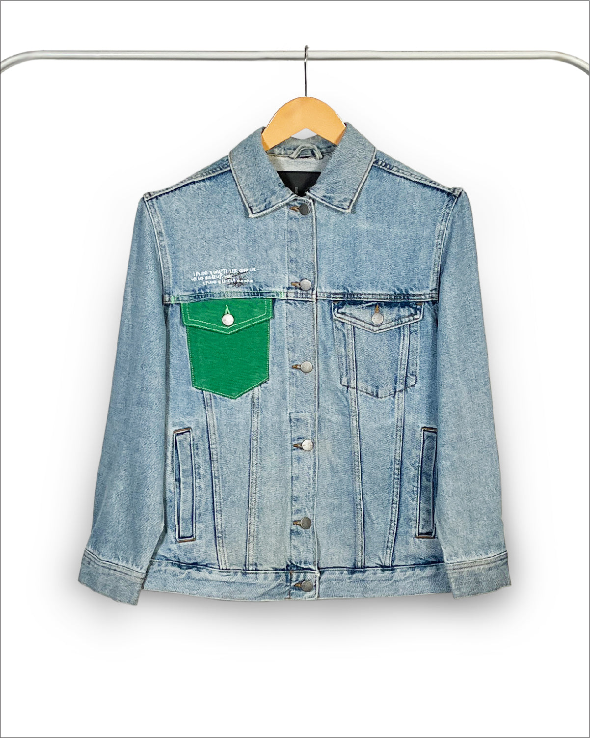 Women's light indigo trucker denim jacket. An iconic jacket style with a slim casual cut, spread collar, pointed flap chest pockets, button tab waist adjusters, and two V-shaped seams that run from chest pocket to waist. It features Un Denim's signature GreenPocket™ that says - ‘I pledge to waste less, crave less, use less and reuse more. I pledge to rescue our future.'