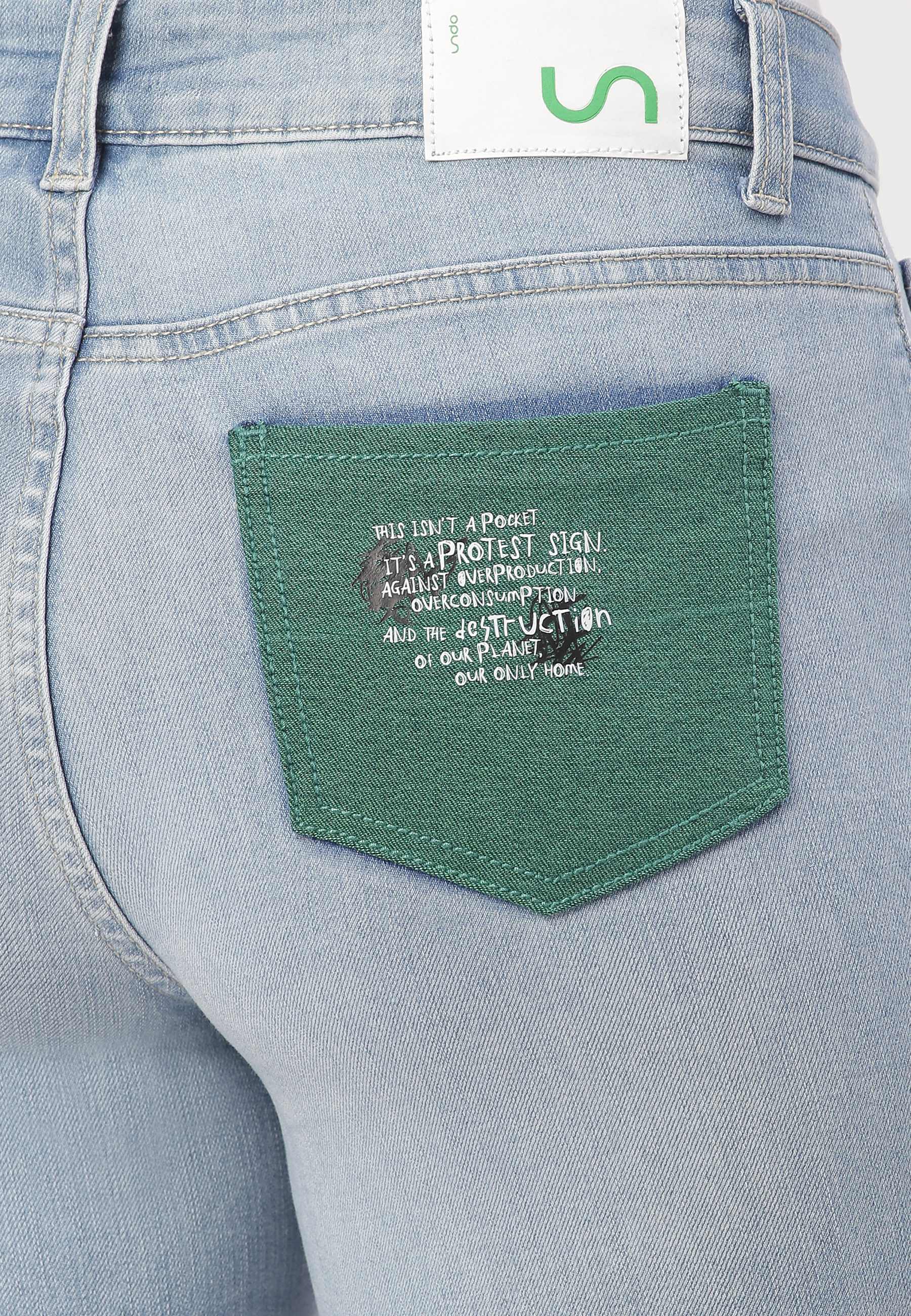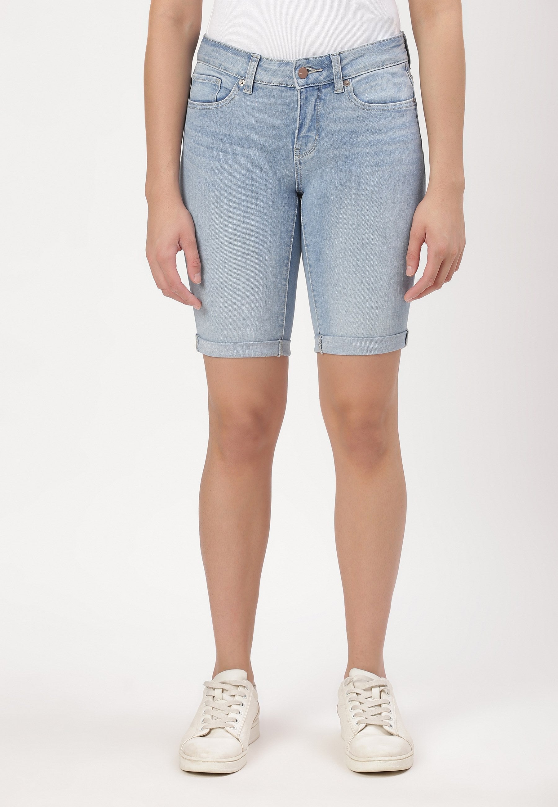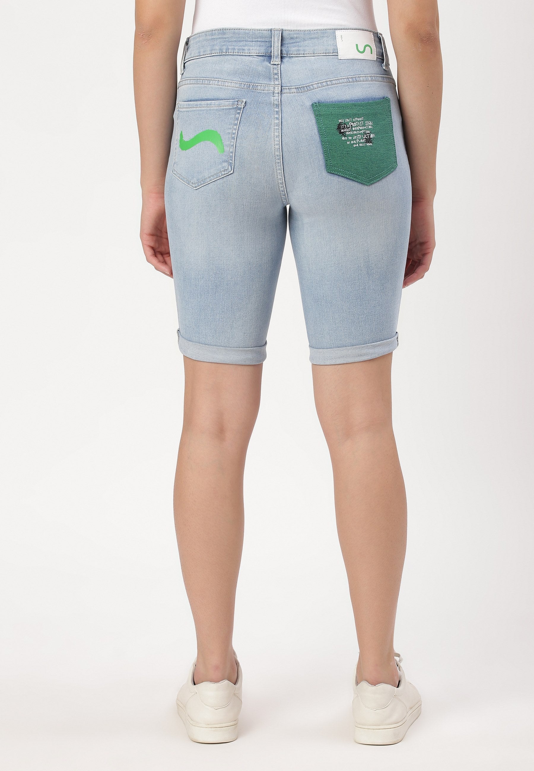 Women's light indigo cycling denim shorts that sit low on waist with narrow leg openings. They fit snugly from thigh to knee. They feature Un Denim's signature GreenPocket™ that says - ‘This is not a green pocket, it’s a protest sign, against overproduction, overconsumption and the destruction of our planet, our only home.’