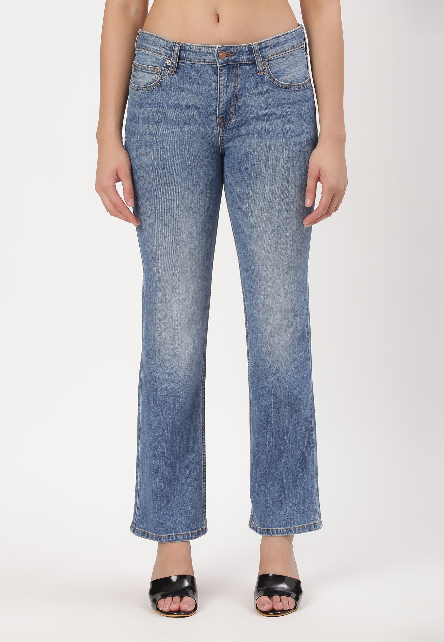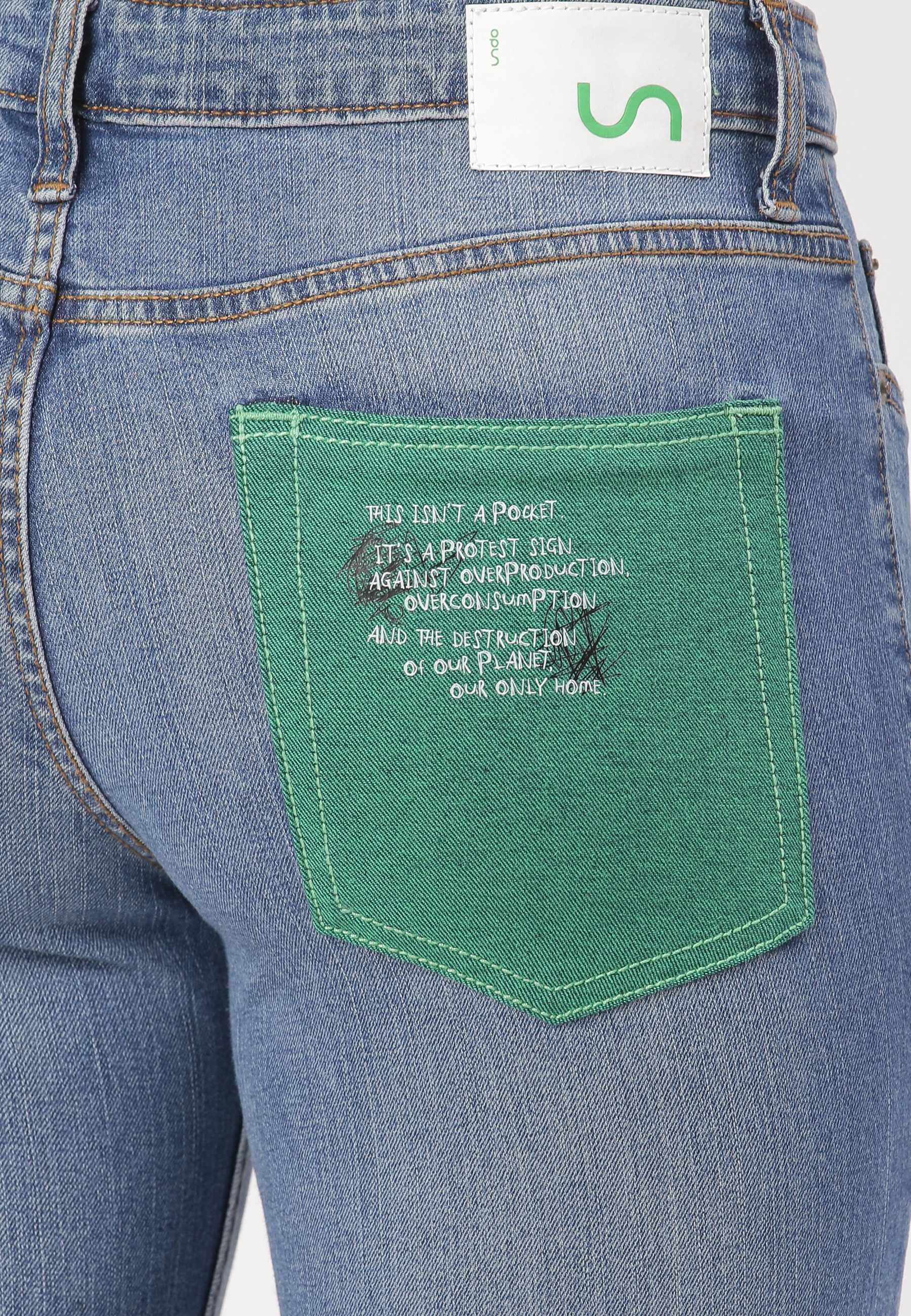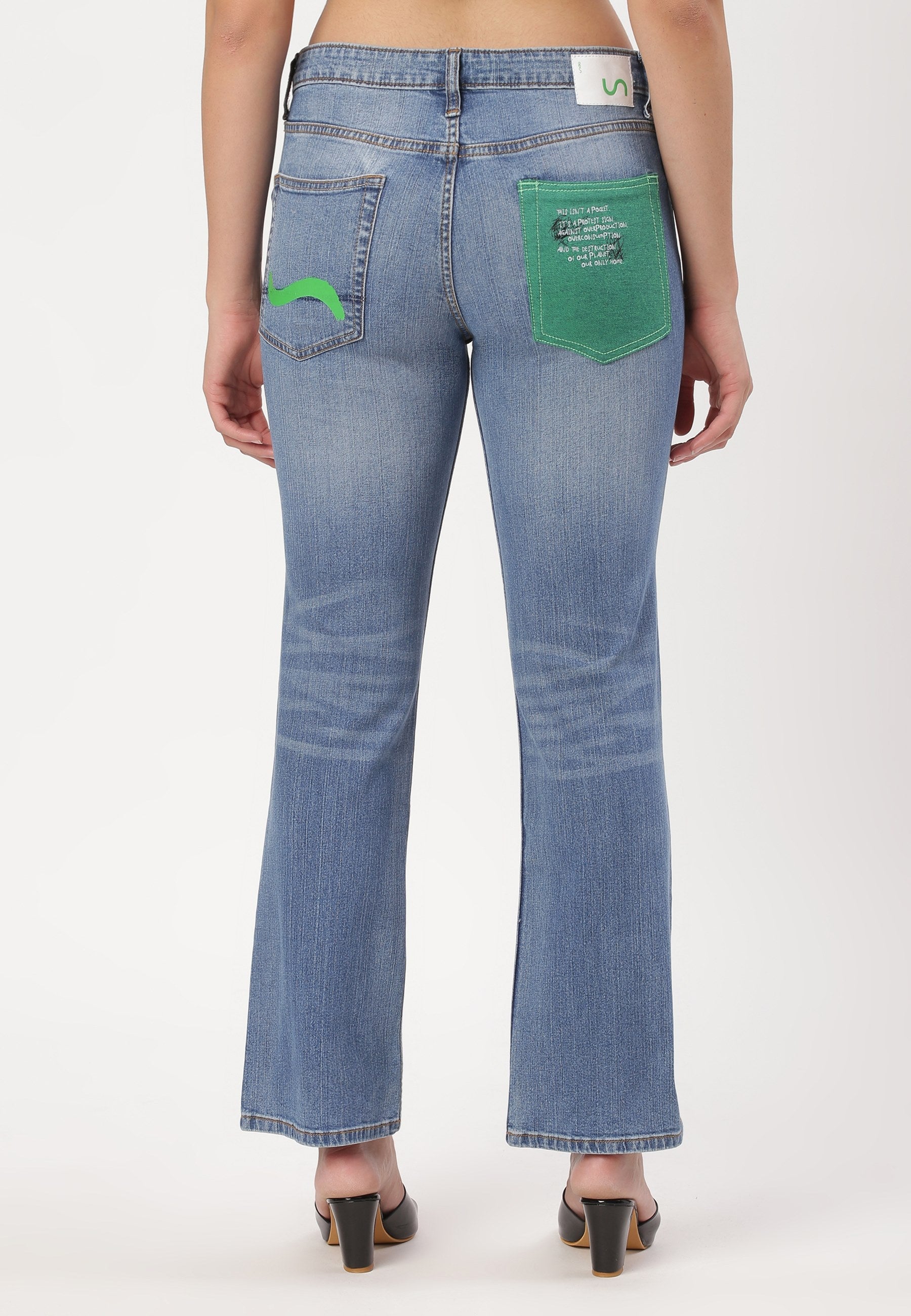 Women's light indigo straight jeans that sit comfortably at the waist with narrow leg openings. They fit fuller through the hip and thigh and run straight from hip to ankle. They feature Un Denim's signature GreenPocket„¢ that says - This is not a green pocket, its a protest sign, against overproduction, overconsumption and the destruction of our planet, our only home.™