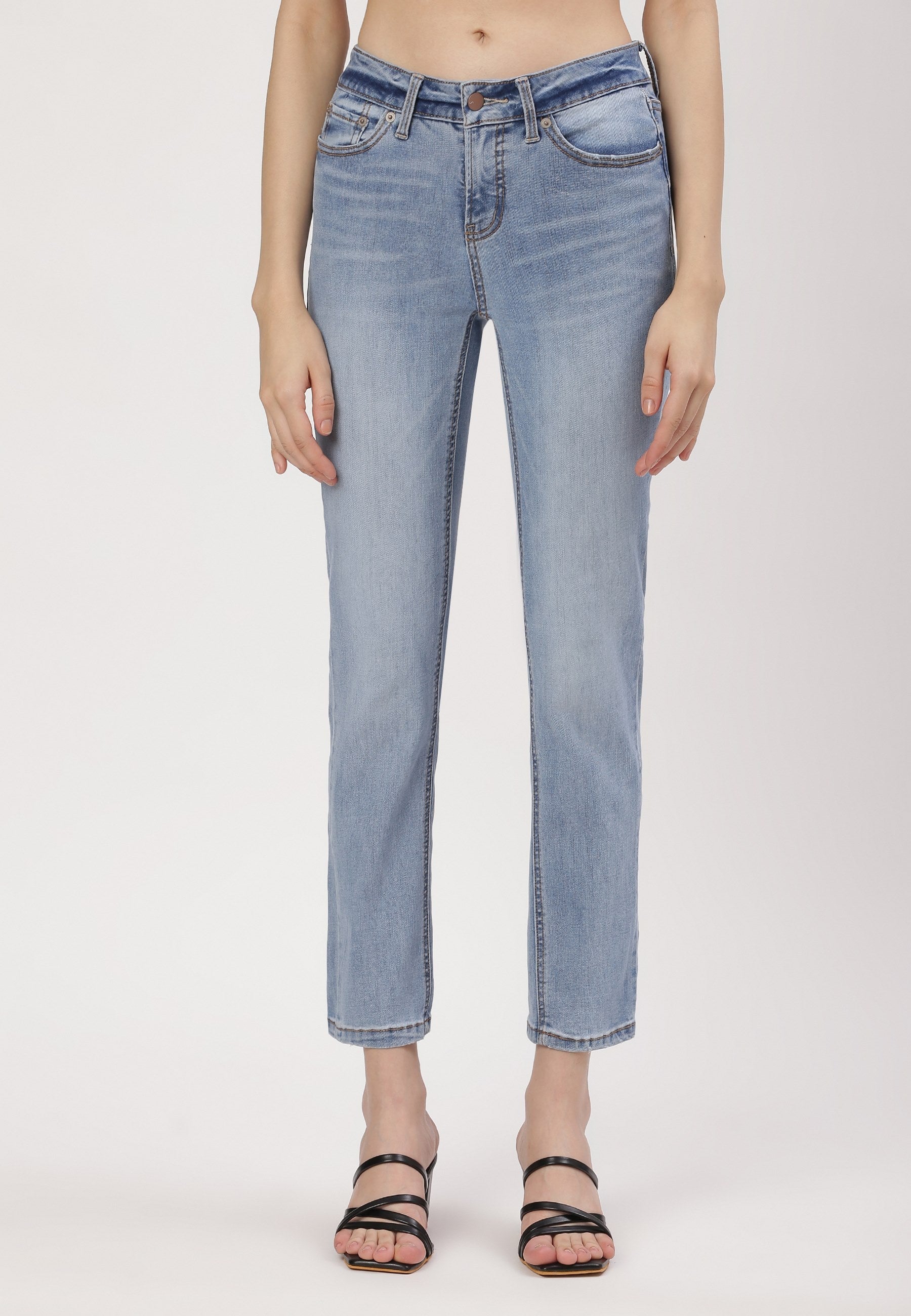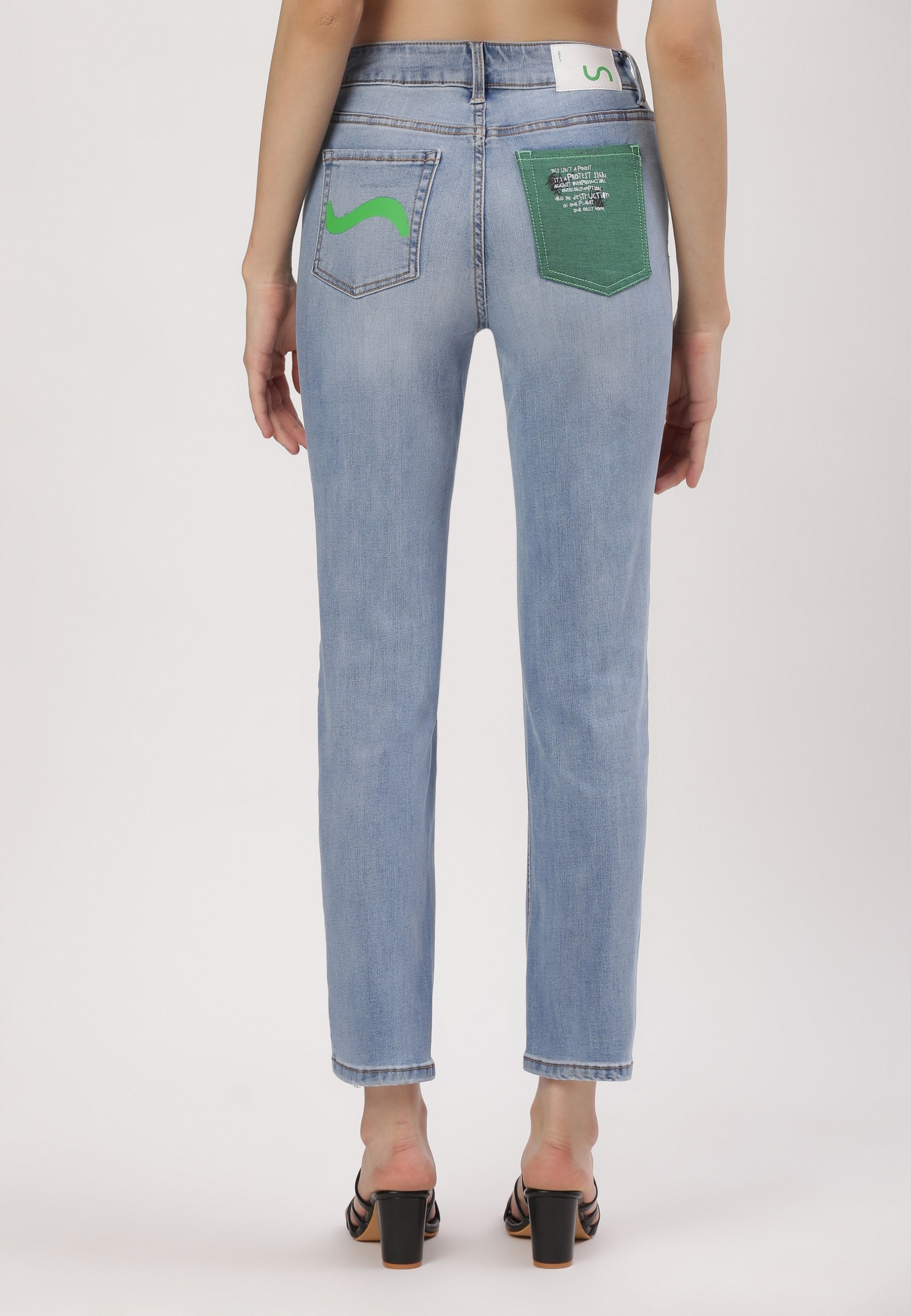 Women's light indigo straight jeans that sit comfortably at the waist with narrow leg openings. They fit fuller through the hip and thigh and run straight from hip to ankle. They feature Un Denim's signature GreenPocket„¢ that says - This is not a green pocket, its a protest sign, against overproduction, overconsumption and the destruction of our planet, our only home.™
