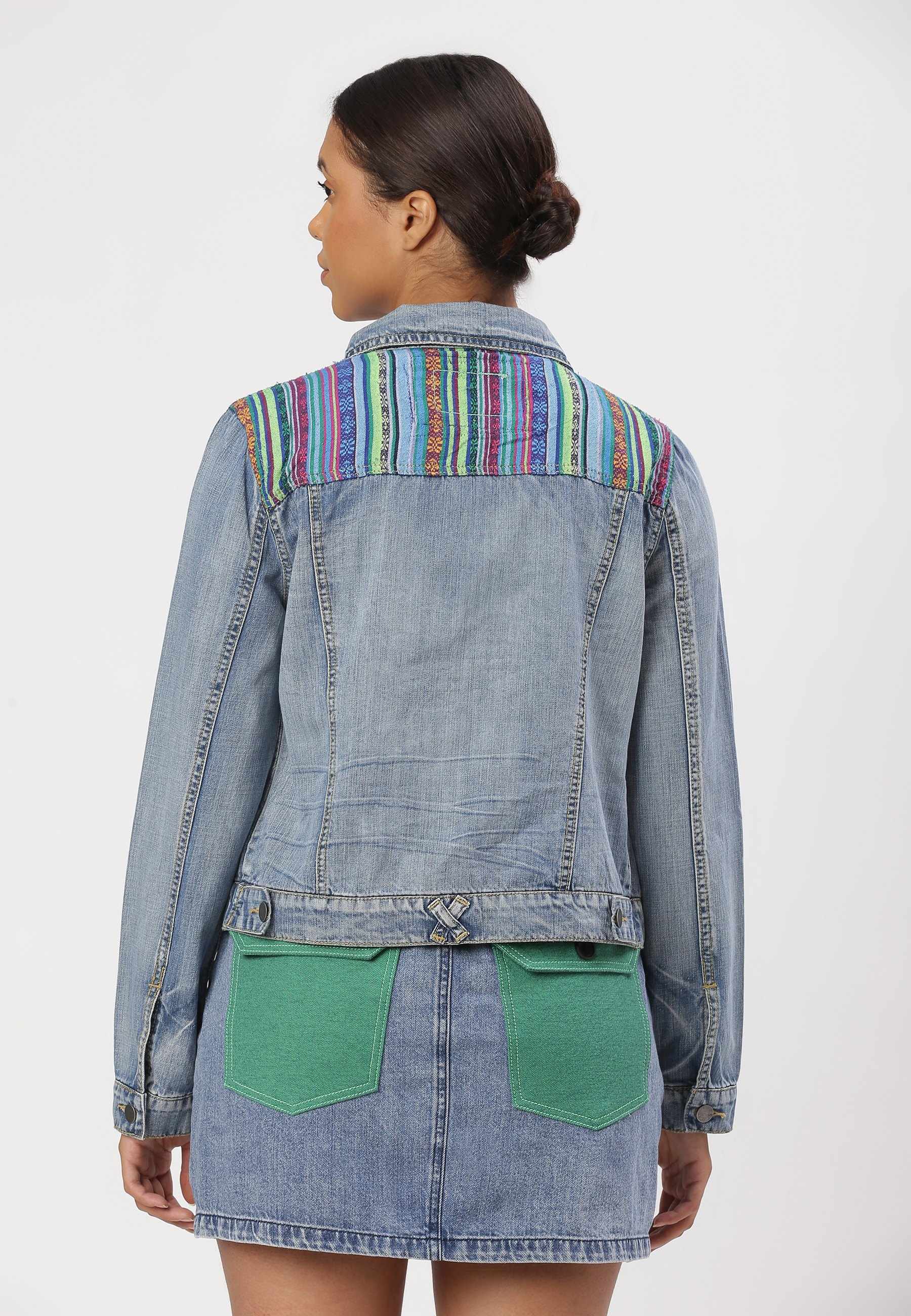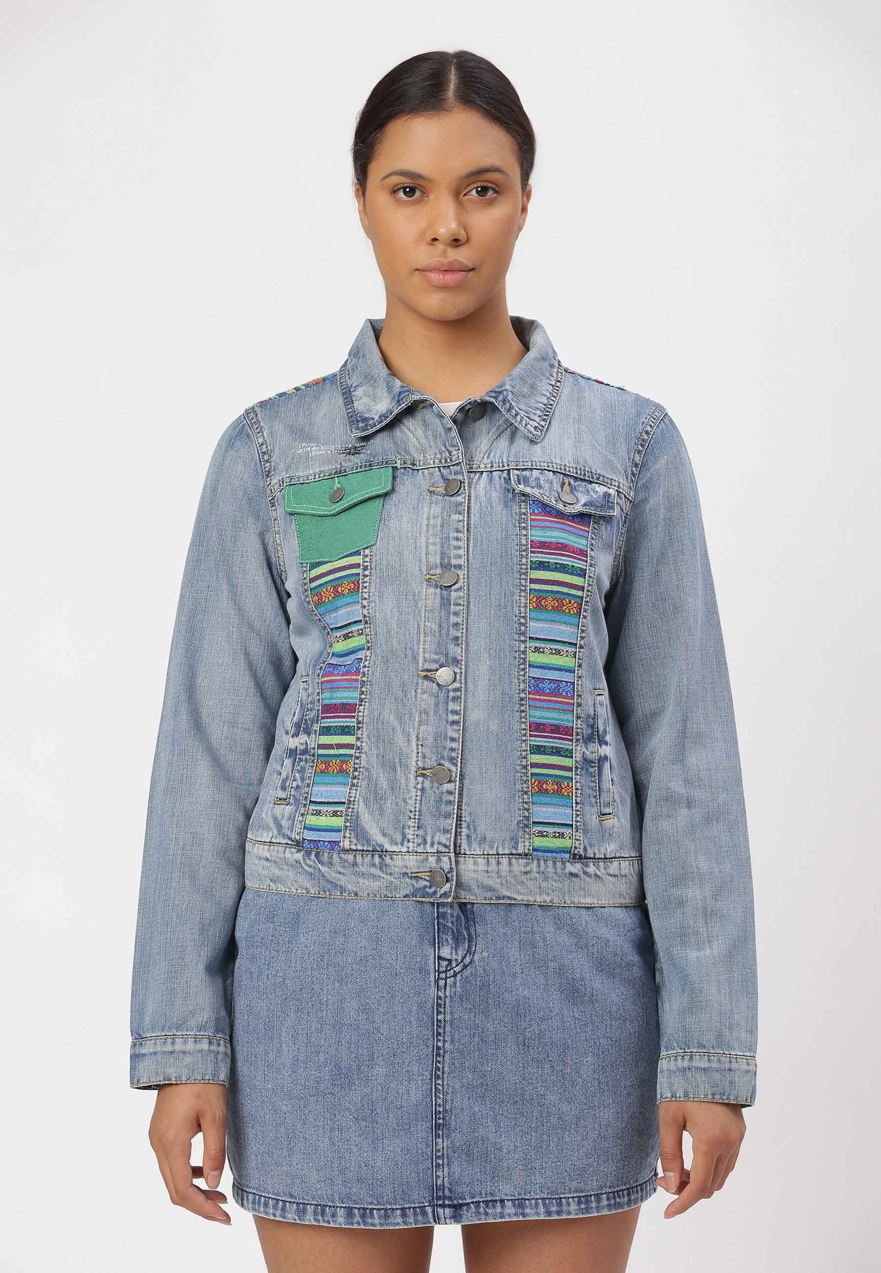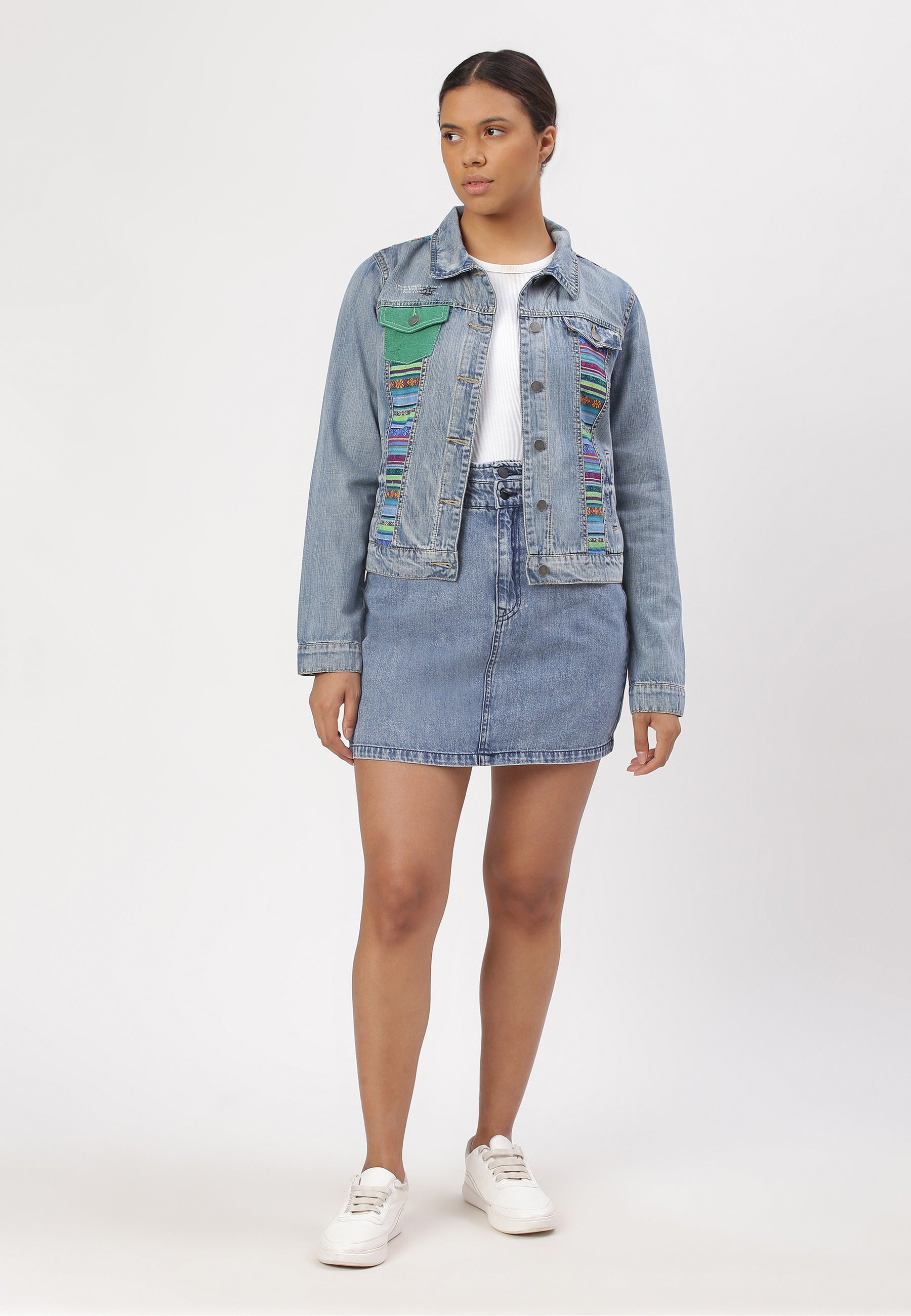 Women's light indigo trucker denim jacket. An iconic jacket style with a slim casual cut, spread collar, pointed flap chest pockets, button tab waist adjusters, and two V-shaped seams that run from chest pocket to waist. It features Un Denim's signature GreenPocket™ that says - ‘I pledge to waste less, crave less, use less and reuse more. I pledge to rescue our future.'
