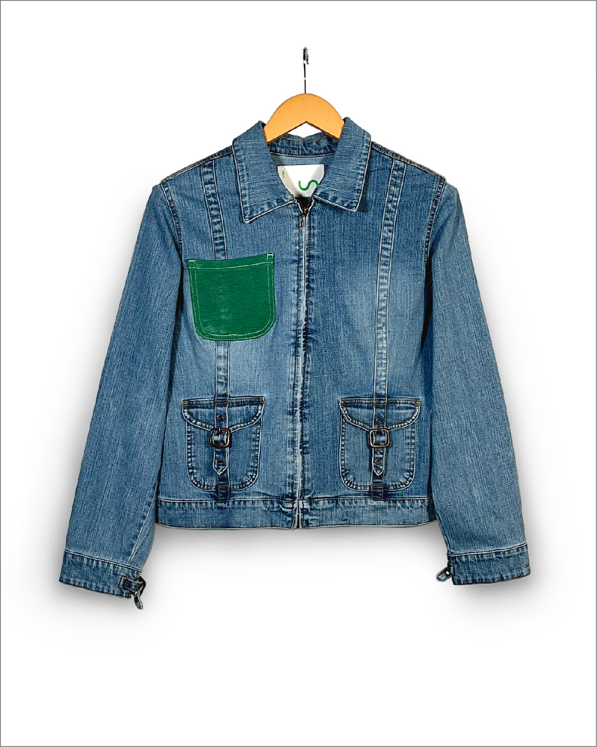 Women's light indigo trucker denim jacket. An iconic jacket style with a slim casual cut, spread collar, pointed flap chest pockets, button tab waist adjusters, and two V-shaped seams that run from chest pocket to waist. It features Un Denim's signature GreenPocket™ that says - ‘I pledge to waste less, crave less, use less and reuse more. I pledge to rescue our future.'