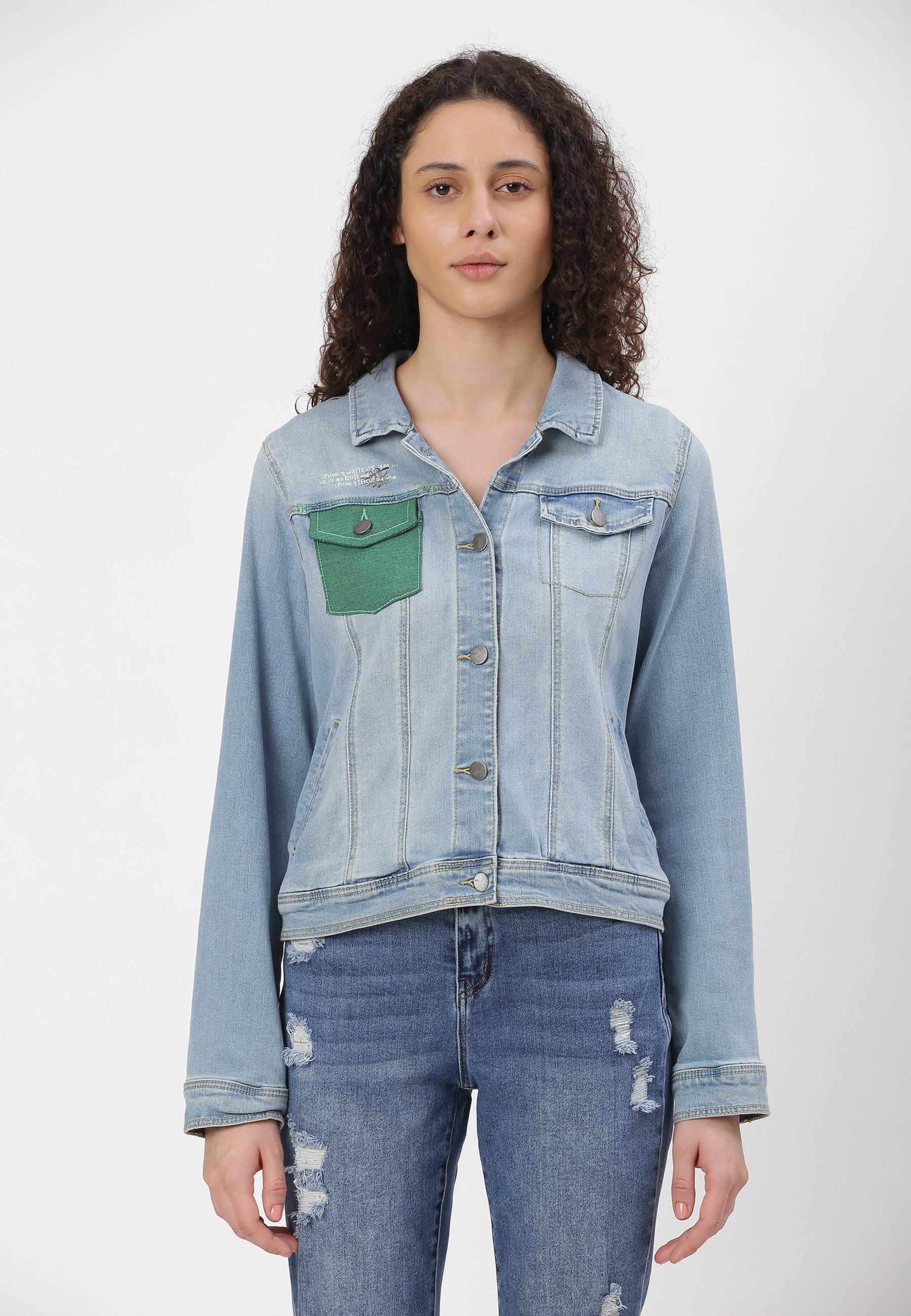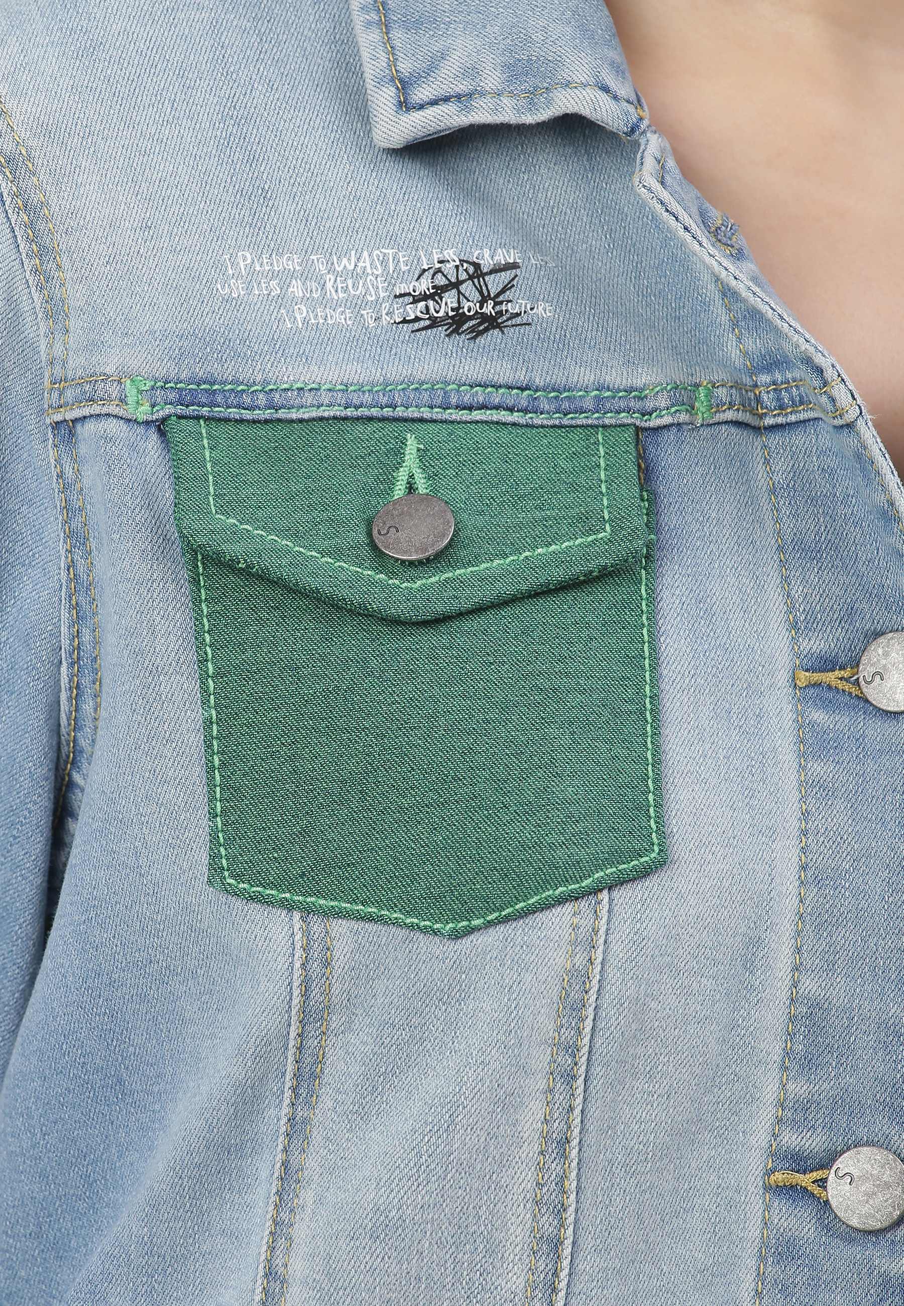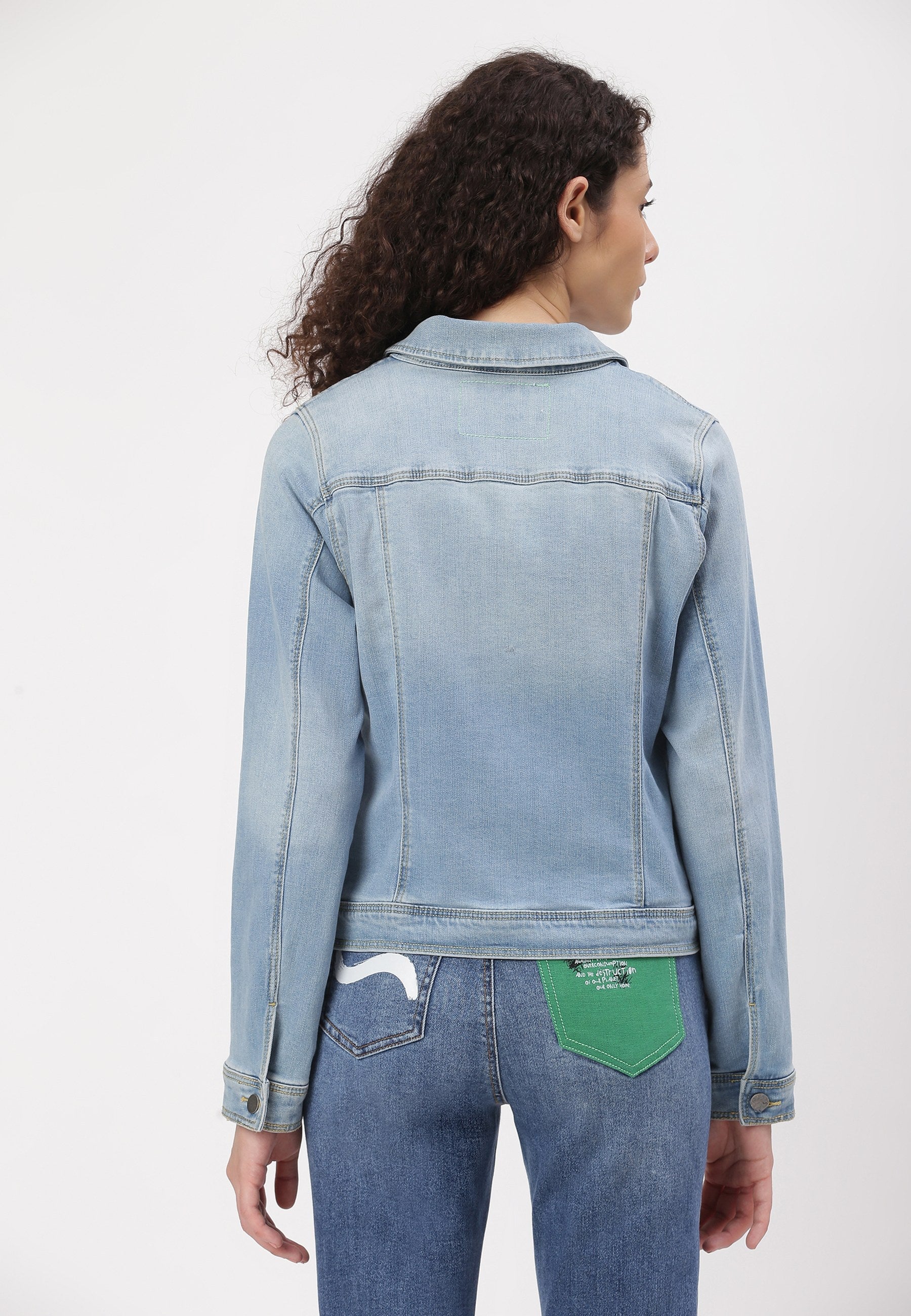 Women's light indigo trucker denim jacket. An iconic jacket style with a slim casual cut, spread collar, pointed flap chest pockets, button tab waist adjusters, and two V-shaped seams that run from chest pocket to waist. It features Un Denim's signature GreenPocket™ that says - ‘I pledge to waste less, crave less, use less and reuse more. I pledge to rescue our future.'