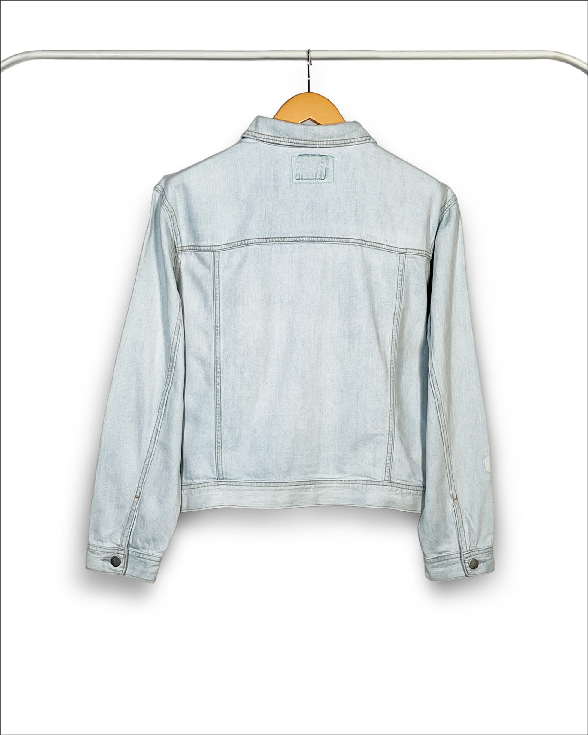 Women's light indigo trucker denim jacket. An iconic jacket style with a slim casual cut, spread collar, pointed flap chest pockets, button tab waist adjusters, and two V-shaped seams that run from chest pocket to waist. It features Un Denim's signature GreenPocket™ that says - ‘I pledge to waste less, crave less, use less and reuse more. I pledge to rescue our future.'