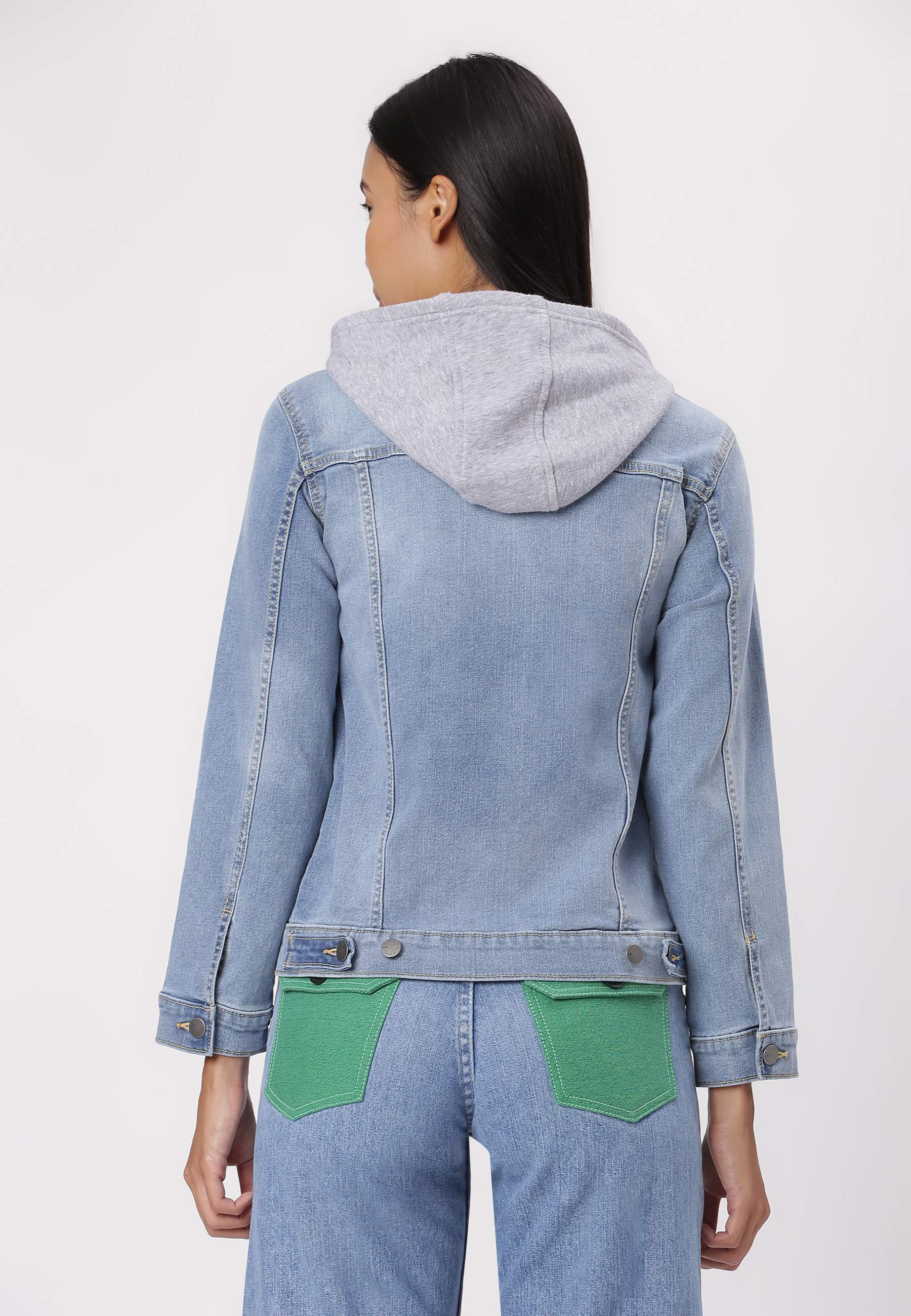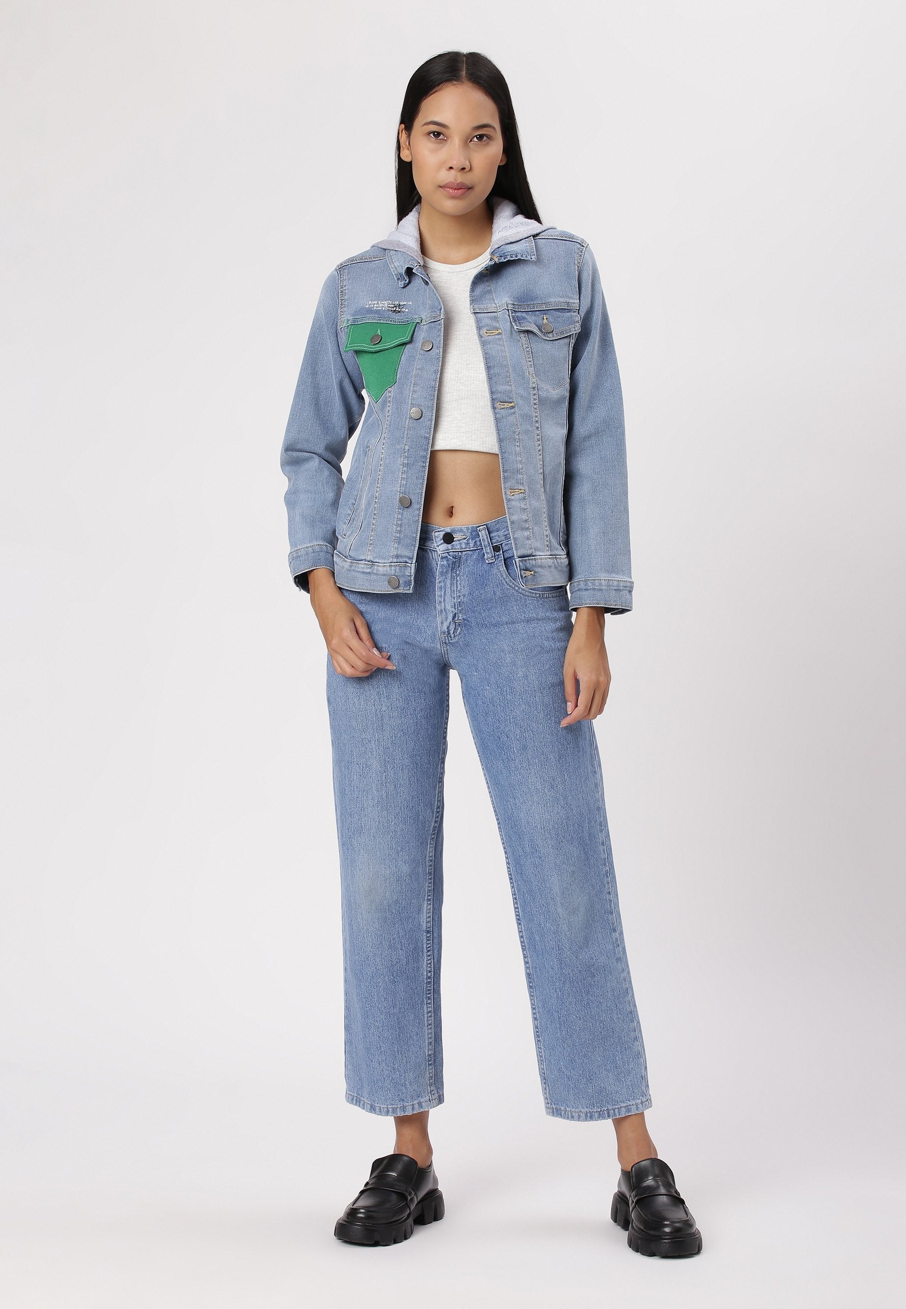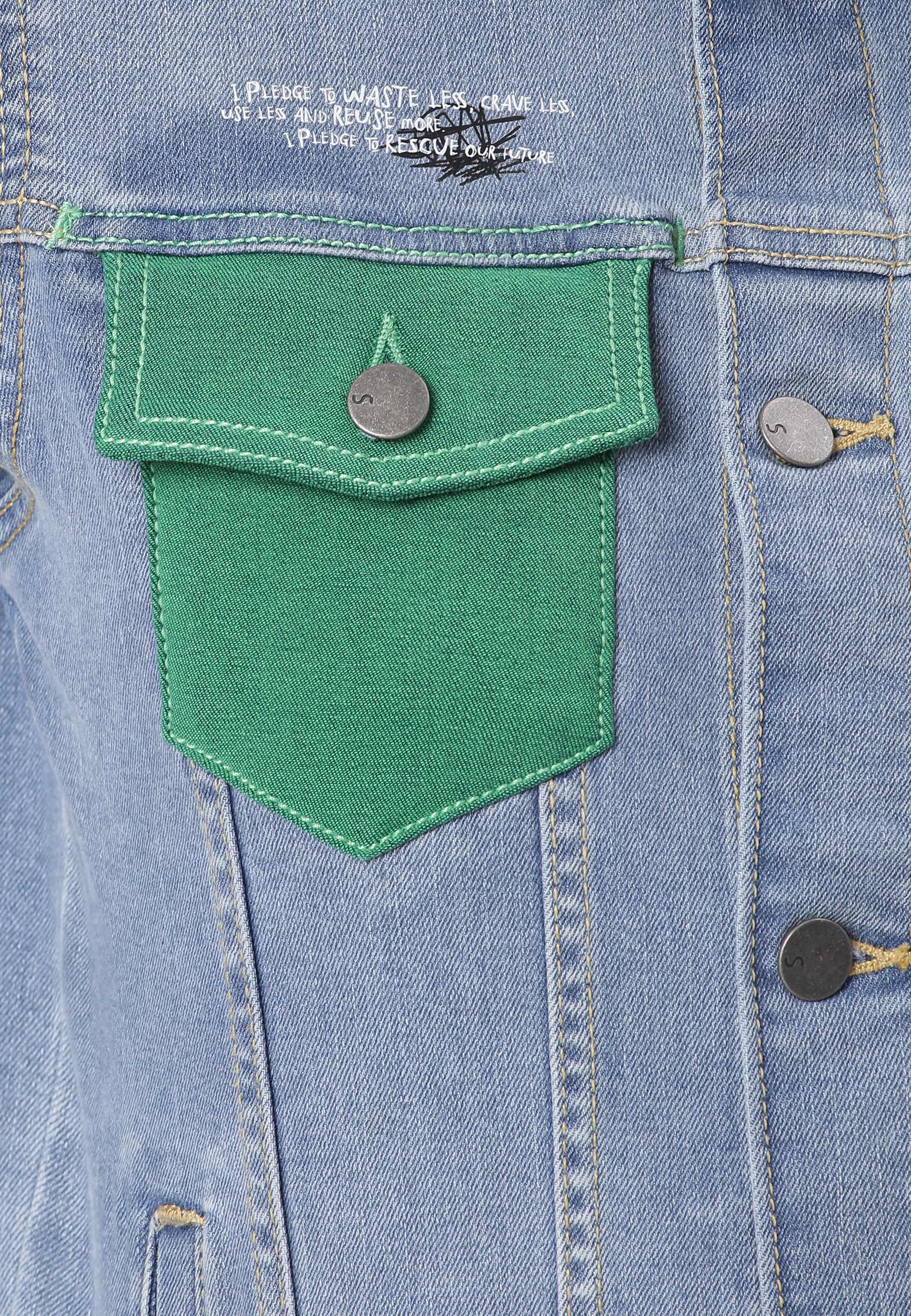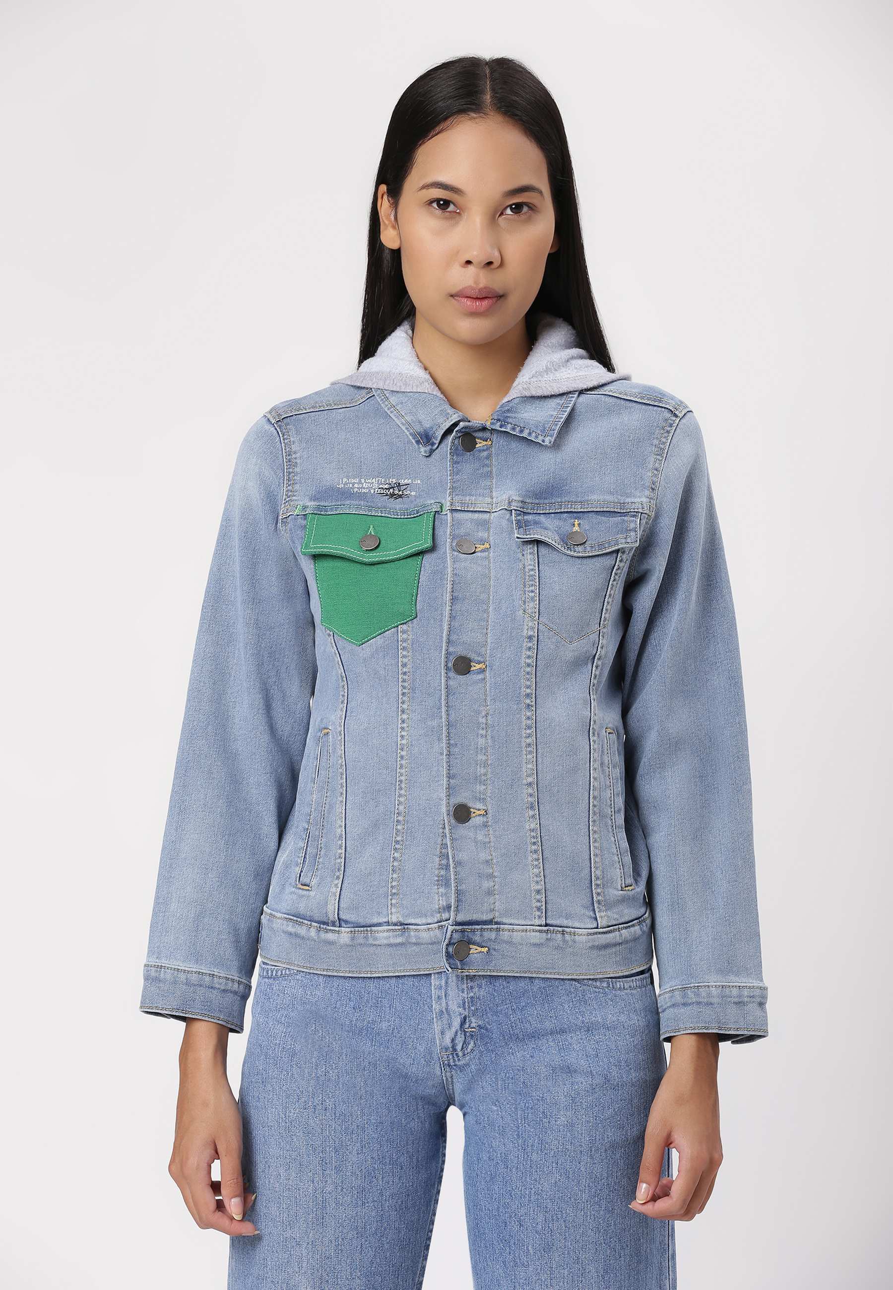 Women's light indigo trucker denim jacket. An iconic jacket style with a slim casual cut, spread collar, pointed flap chest pockets, button tab waist adjusters, and two V-shaped seams that run from chest pocket to waist. It features Un Denim's signature GreenPocket™ that says - ‘I pledge to waste less, crave less, use less and reuse more. I pledge to rescue our future.'