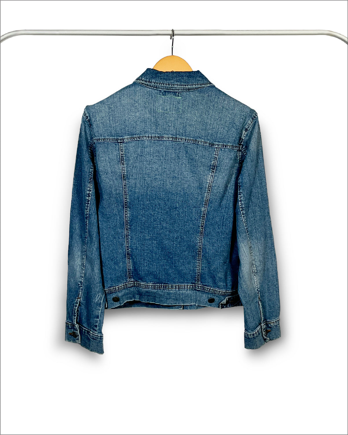 Women's light indigo trucker denim jacket. An iconic jacket style with a slim casual cut, spread collar, pointed flap chest pockets, button tab waist adjusters, and two V-shaped seams that run from chest pocket to waist. It features Un Denim's signature GreenPocket™ that says - ‘I pledge to waste less, crave less, use less and reuse more. I pledge to rescue our future.'