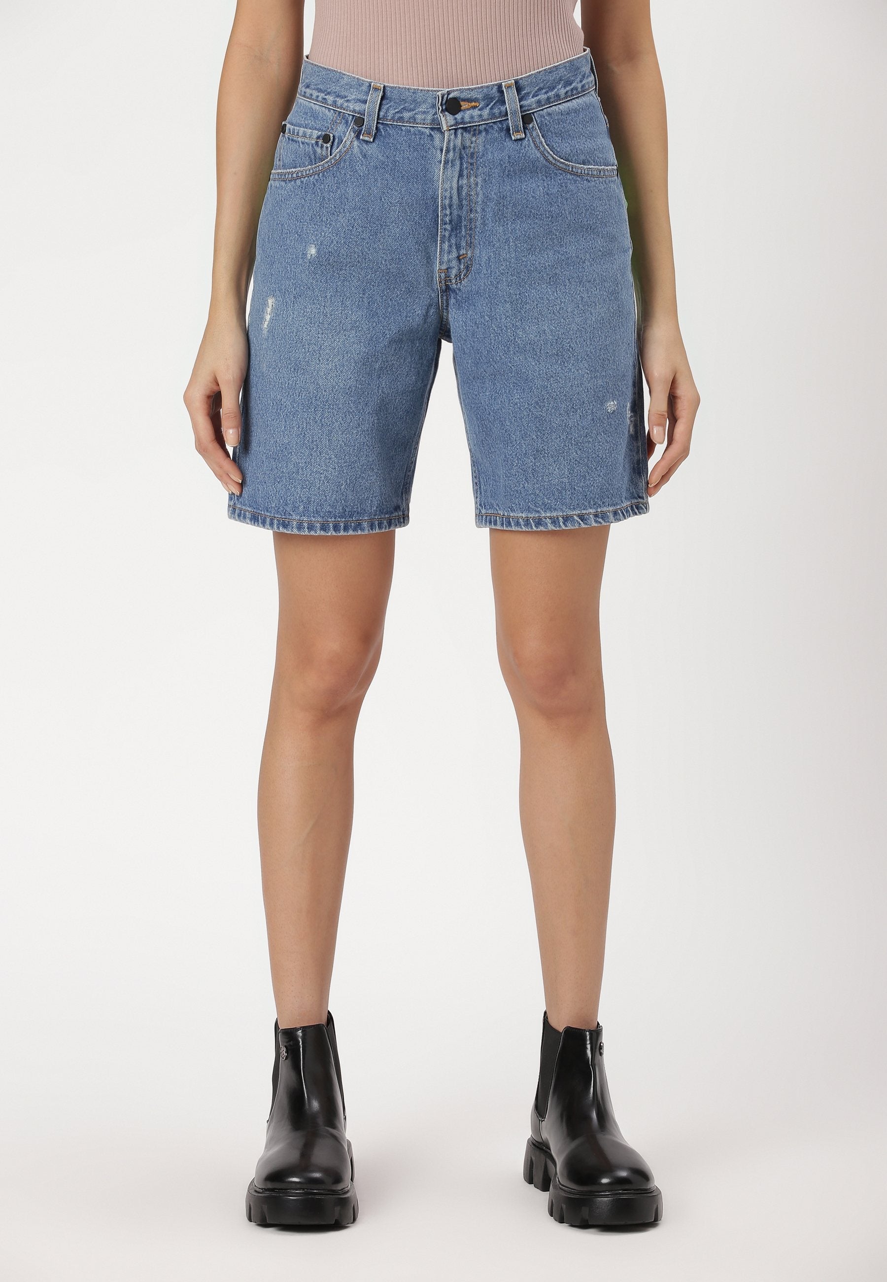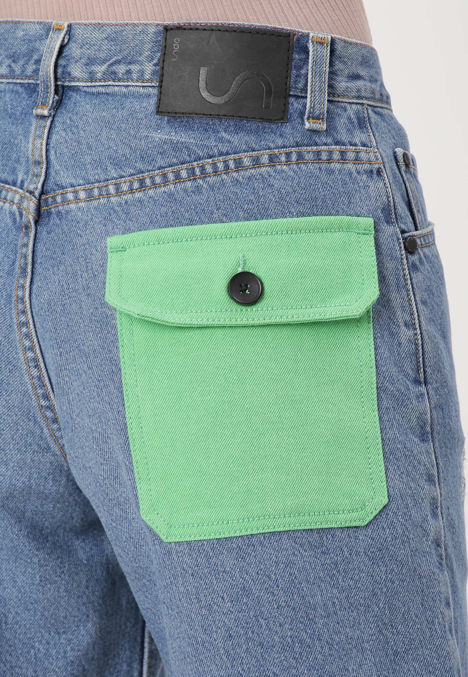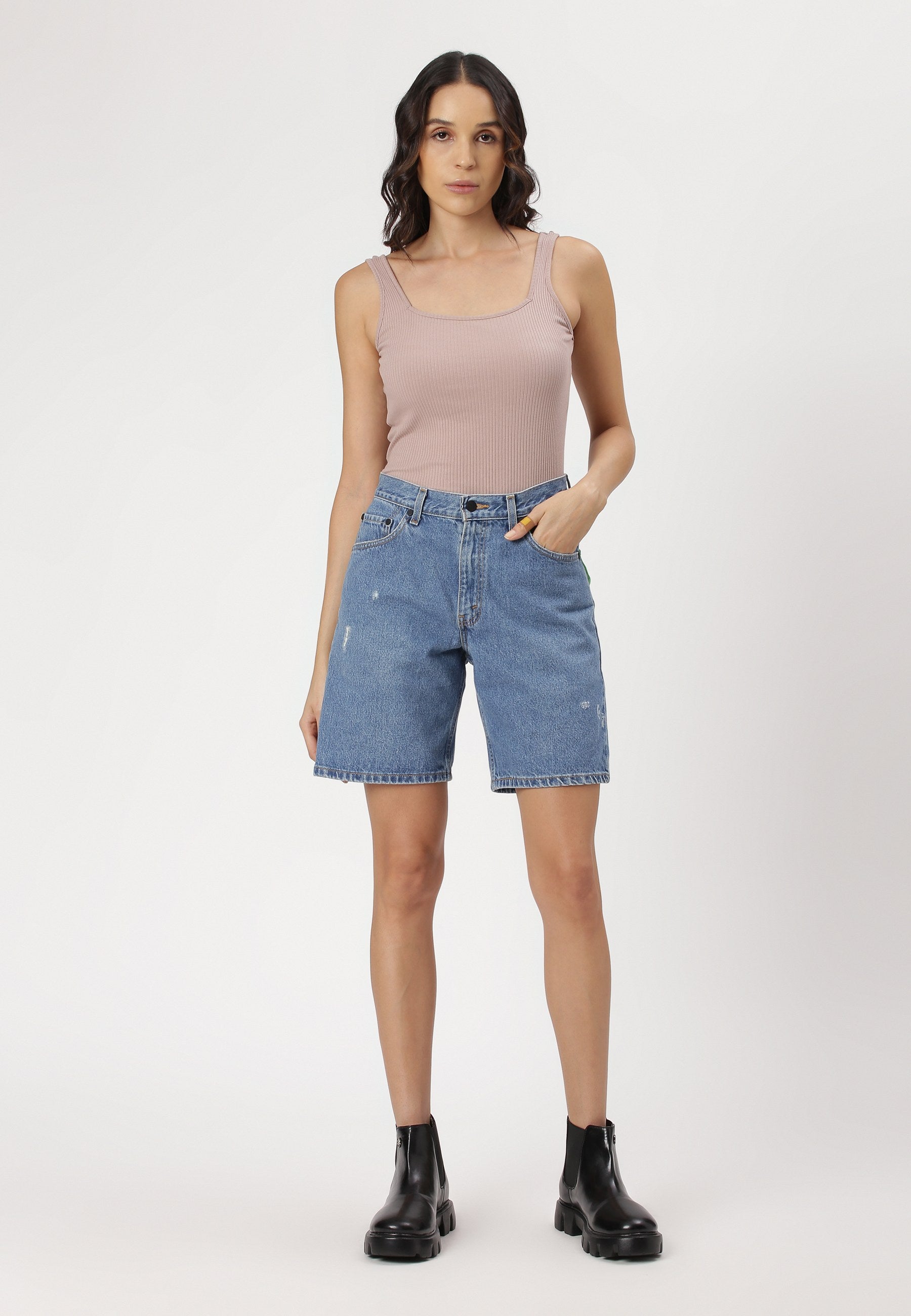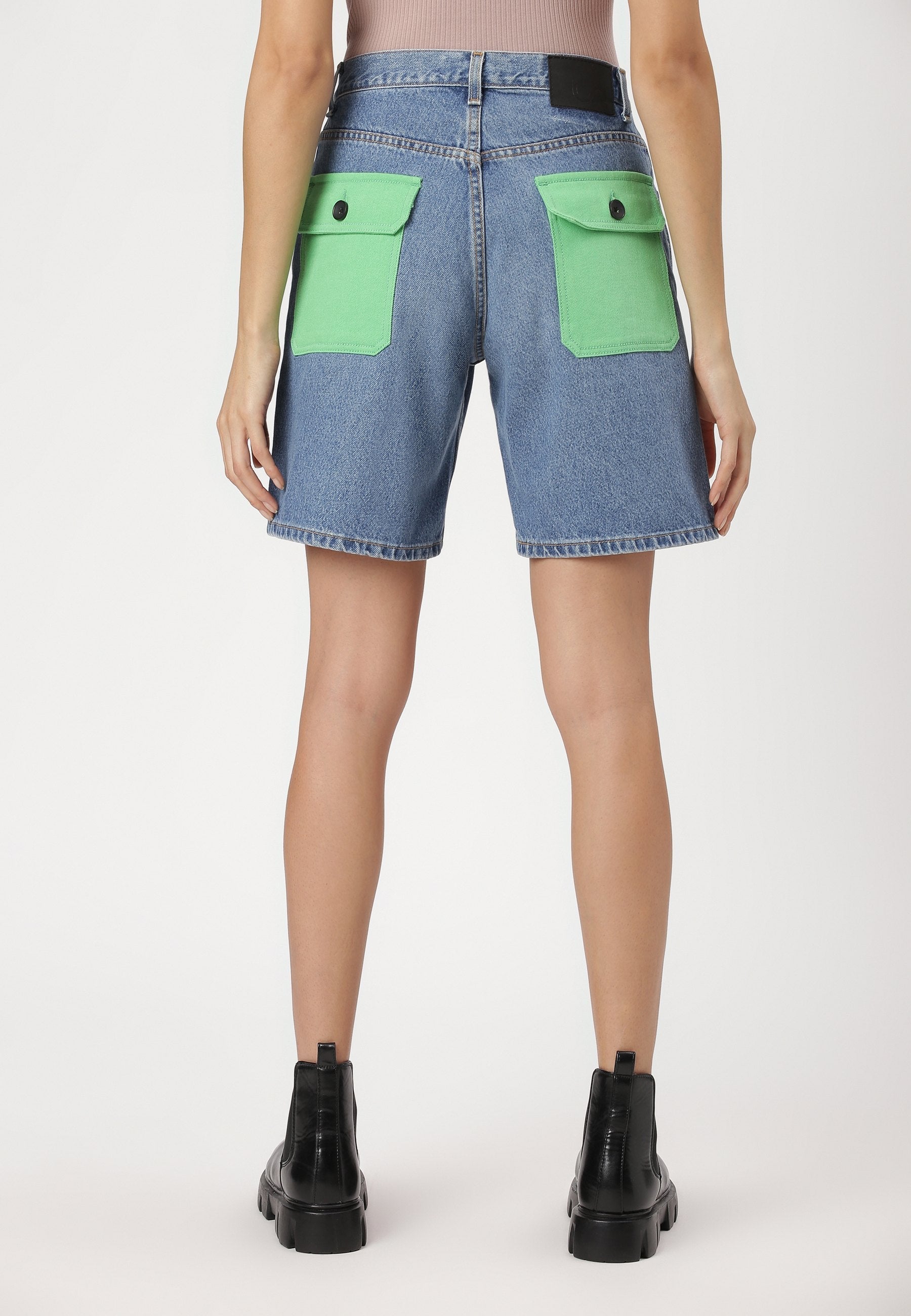 Women's mid indigo bermuda denim shorts that sit high on the waist with wide leg openings. A relaxed fit around the hip and thigh. They come with bold, bright green back pockets.