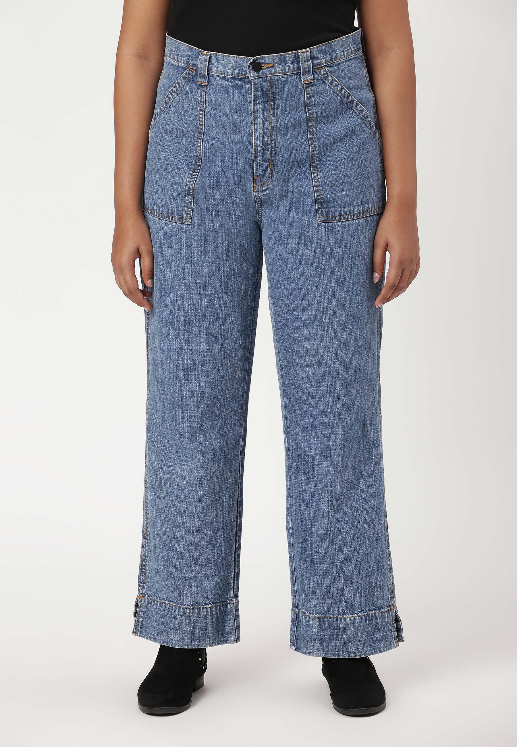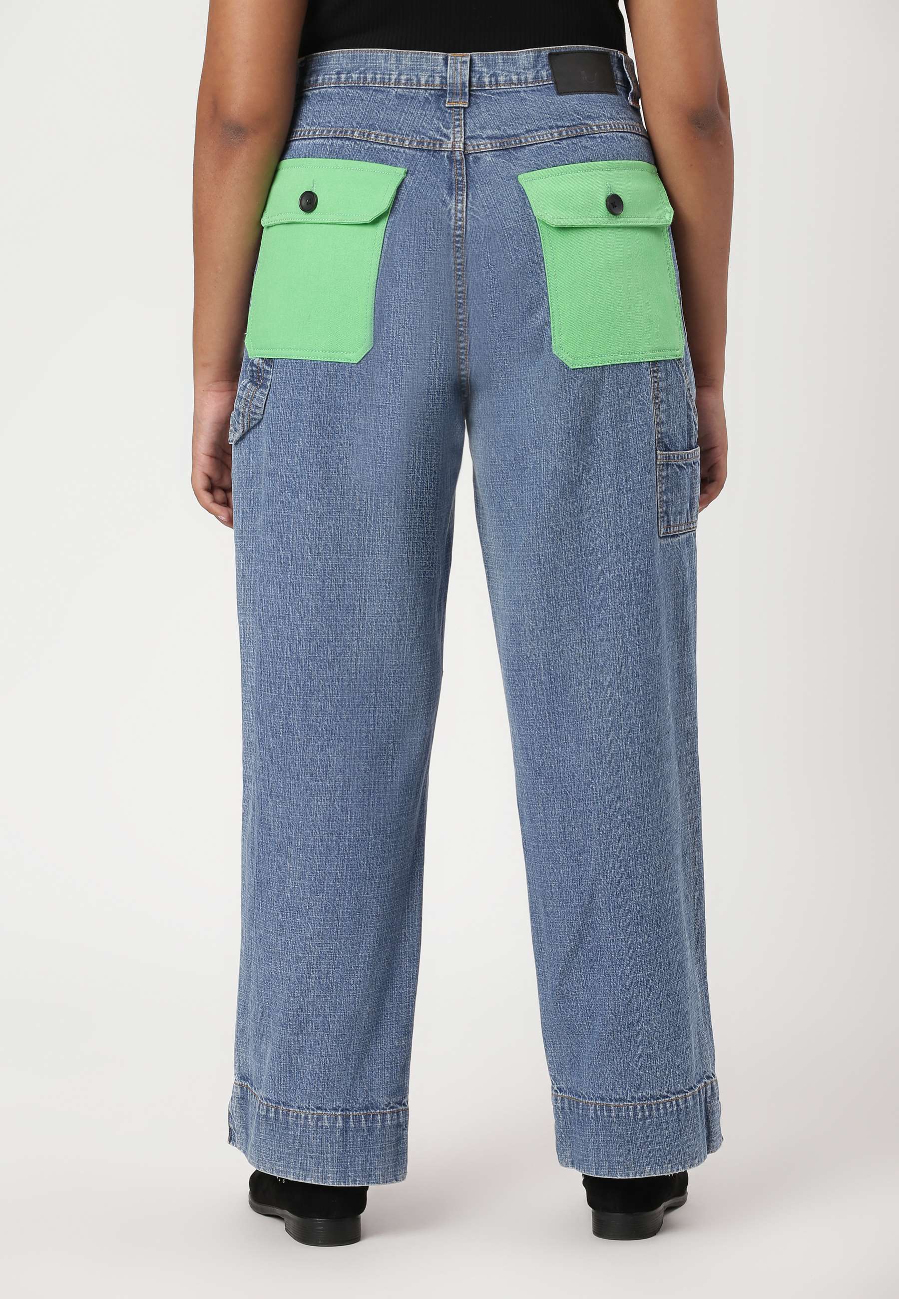 Women's mid indigo straight jeans that sit high on the waist with narrow leg openings. They fit fuller through the hip and thigh and run straight from hip to ankle. They come with bold, bright green back pockets.