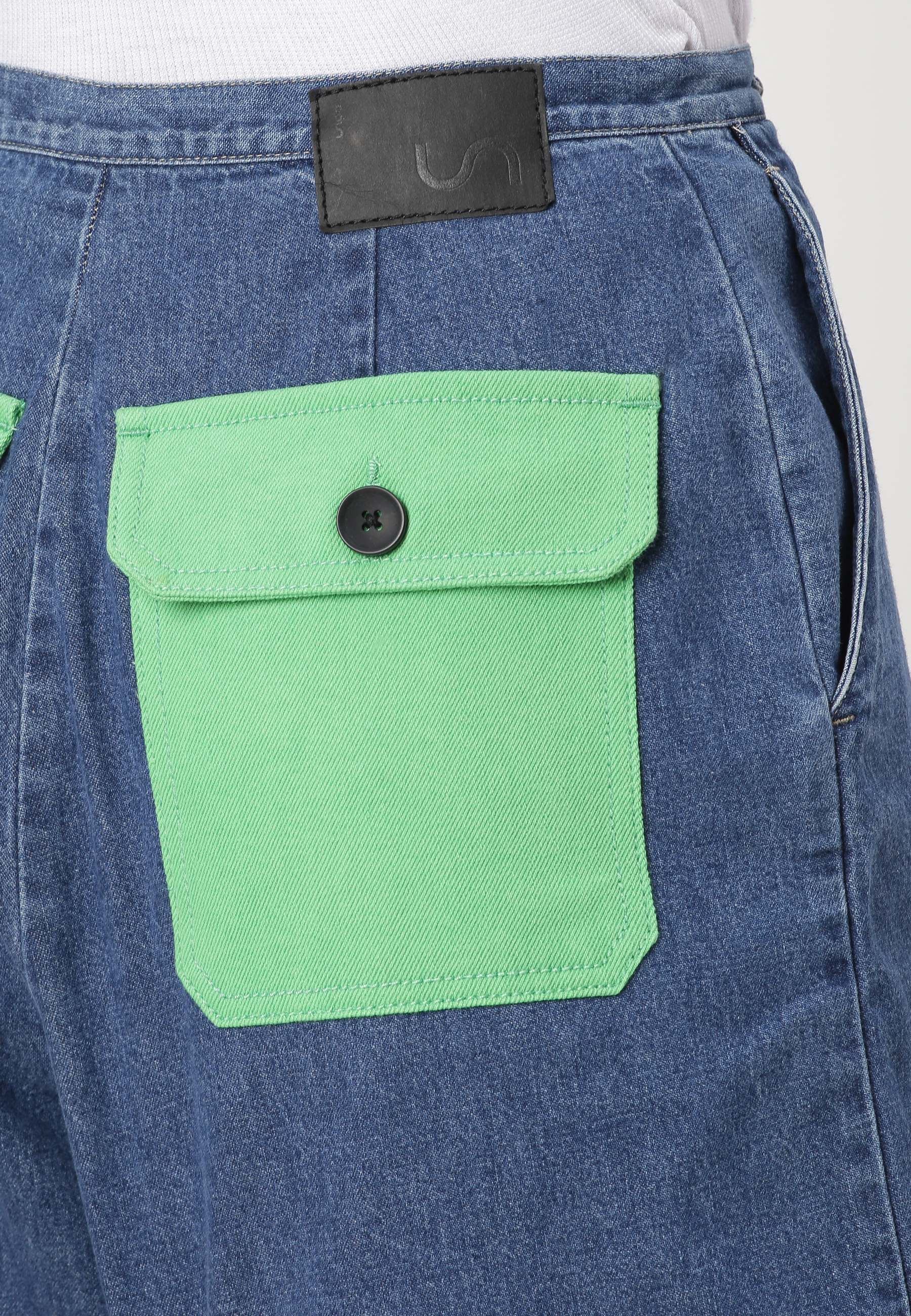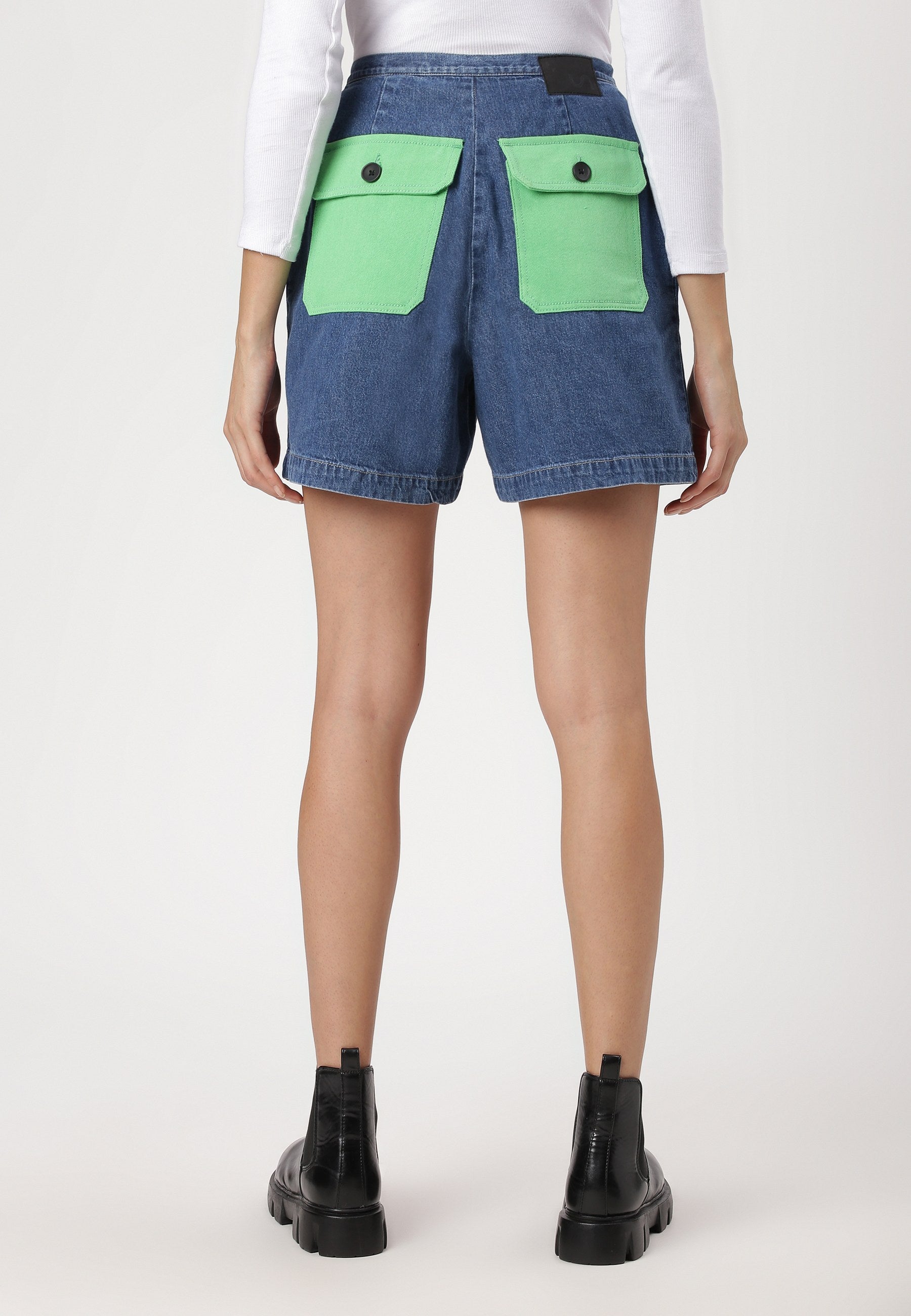 Women's mid indigo mom fit denim shorts that sit high on the waist with wide leg openings. They fit loose around the upper thigh, flaring out slightly from the waist. They come with bold, bright green back pockets.
